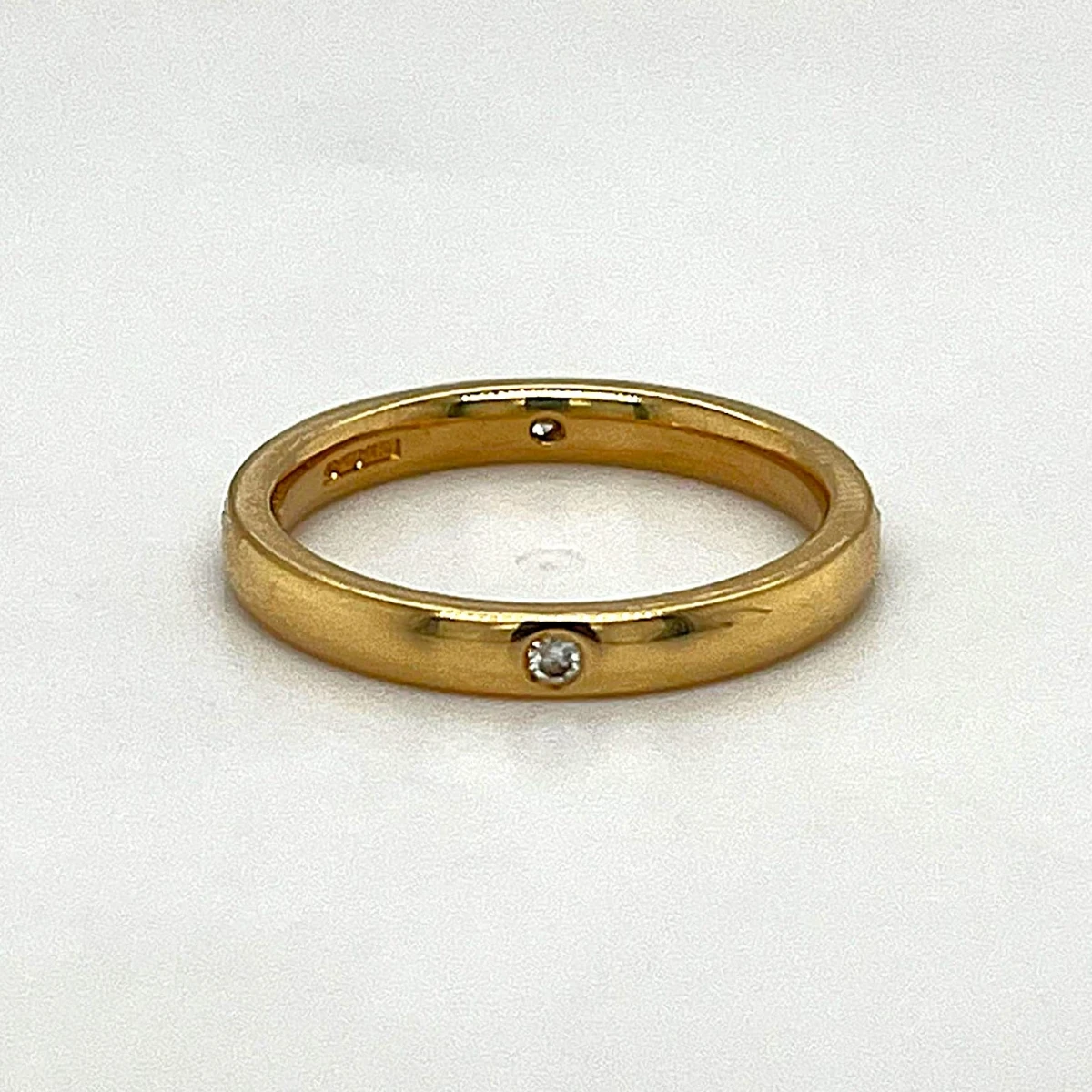 0.04ct Diamond & 18ct Gold Wedding Band – 3.2g A delicate symbol of enduring love, this 18ct gold wedding band is adorned with a total of 0.04ct of brilliant-cut diamonds, adding subtle sparkle and elegance. Its slight court profile ensures a comfortable fit, making it perfect for everyday wear while maintaining a refined, classic look. Weighing 3.2 grams, this lightweight band is ideal for those seeking a minimalist yet luxurious design. The polished finish enhances the warm glow of yellow gold, while the carefully set diamonds offer a gentle shimmer, capturing light beautifully from every angle.