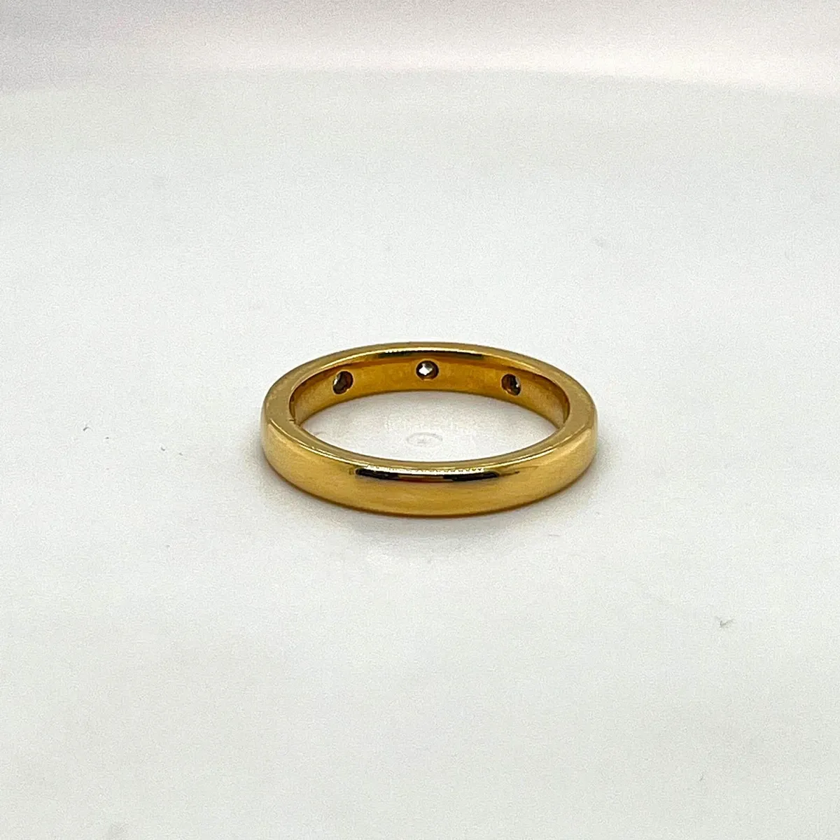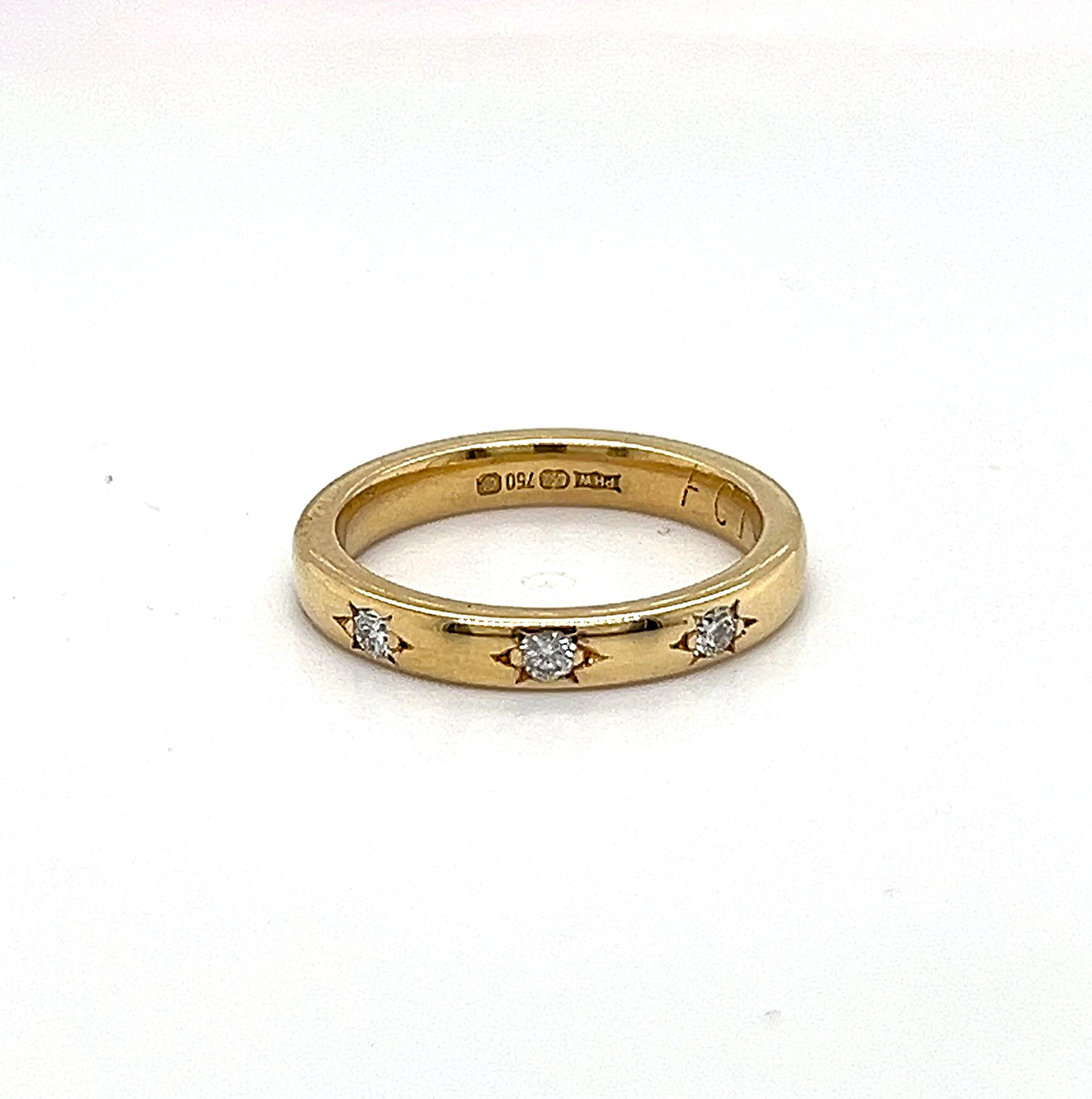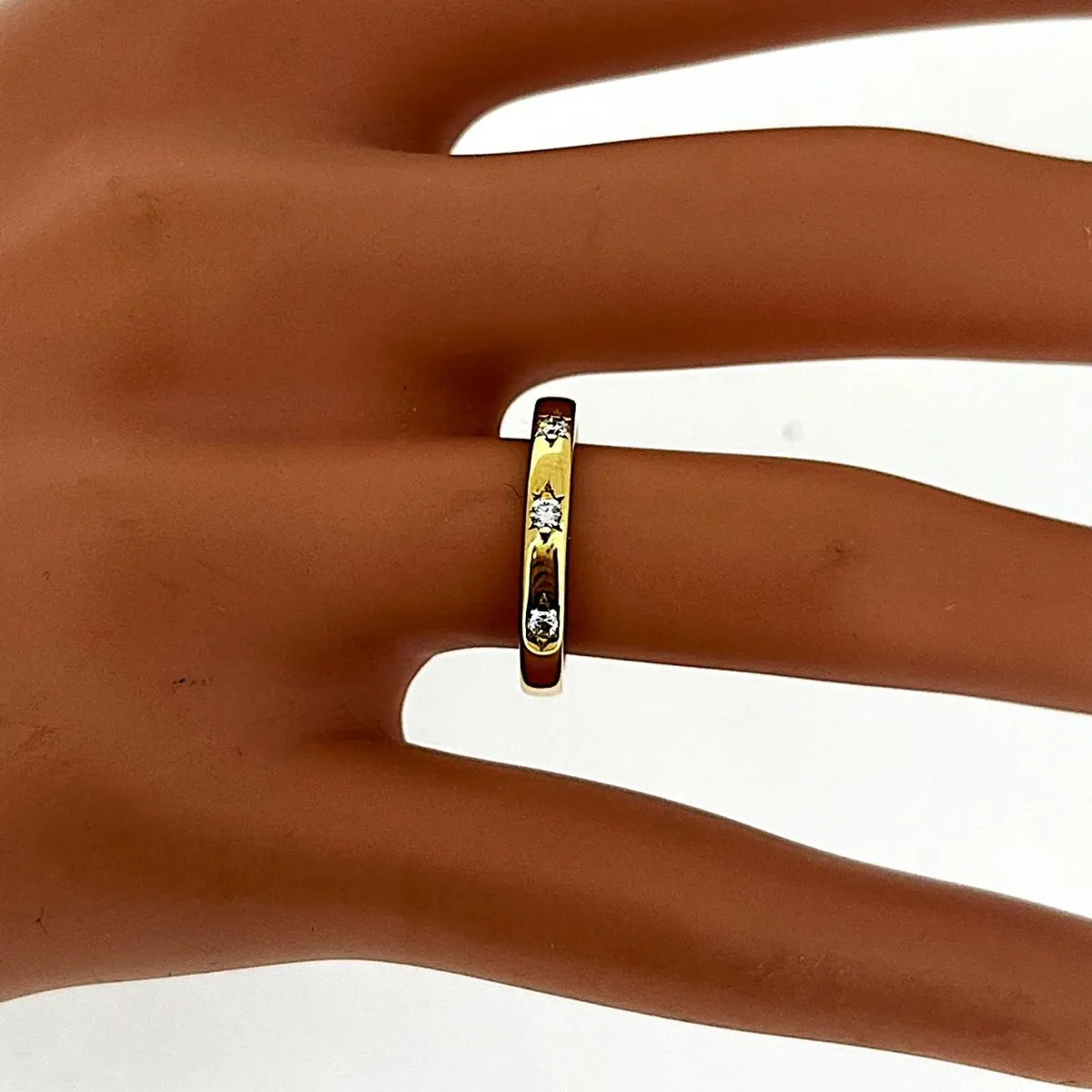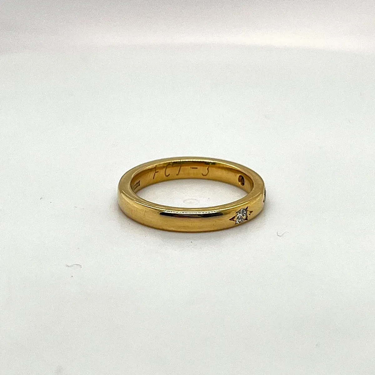 0.05ct Diamond & 18ct Gold 3mm Wedding Band – 3.7g A graceful and timeless expression of love, this 3mm wedding band is crafted from 18ct gold and adorned with a total of 0.05ct of brilliant-cut diamonds, offering a delicate sparkle. Its slight court profile ensures a comfortable fit, ideal for daily wear while maintaining an elegant, refined look. Weighing 3.7 grams, this band is lightweight yet substantial enough to convey lasting commitment. The polished finish enhances the warm glow of the gold, while the carefully set diamonds catch the light beautifully, making it perfect as a standalone band or paired with other rings.