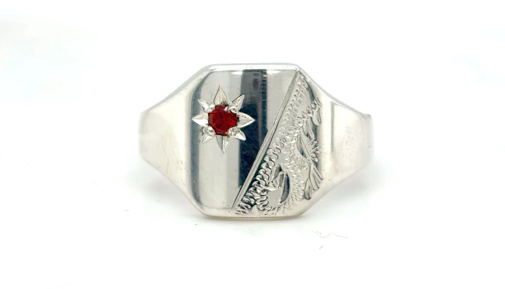 0.05ct Garnet & Silver Signet Ring – 5.0g (13.3mm) Add a touch of classic elegance with this 0.05ct Garnet Signet Ring, crafted in sterling silver. Featuring a deep red garnet set within a sleek 13.3mm signet design, this ring combines sophistication with timeless style. Weighing 5.0 grams, it offers a comfortable fit while making a subtle statement. Perfect as a personal accessory or as a distinctive gift for someone special. Details: