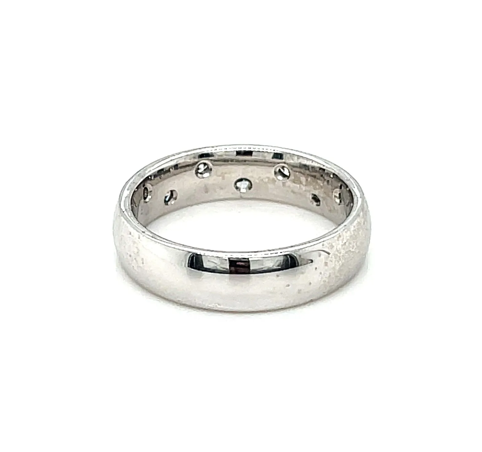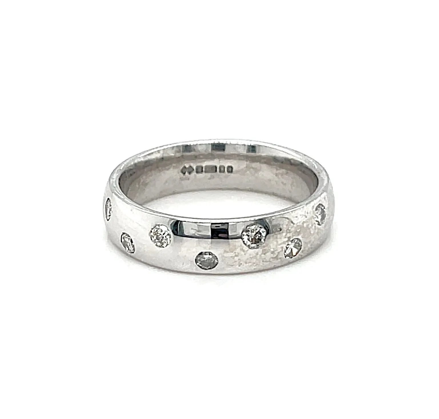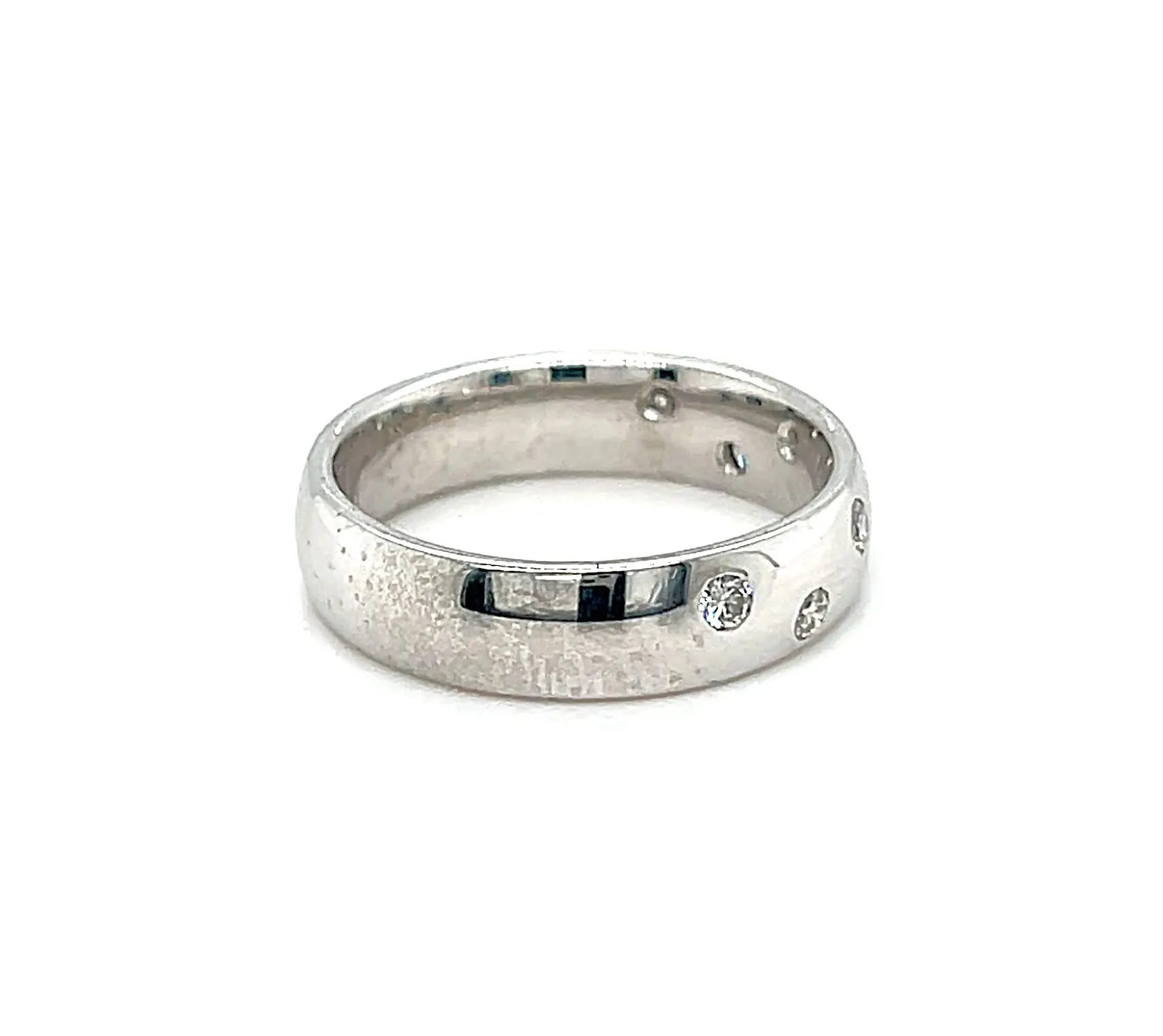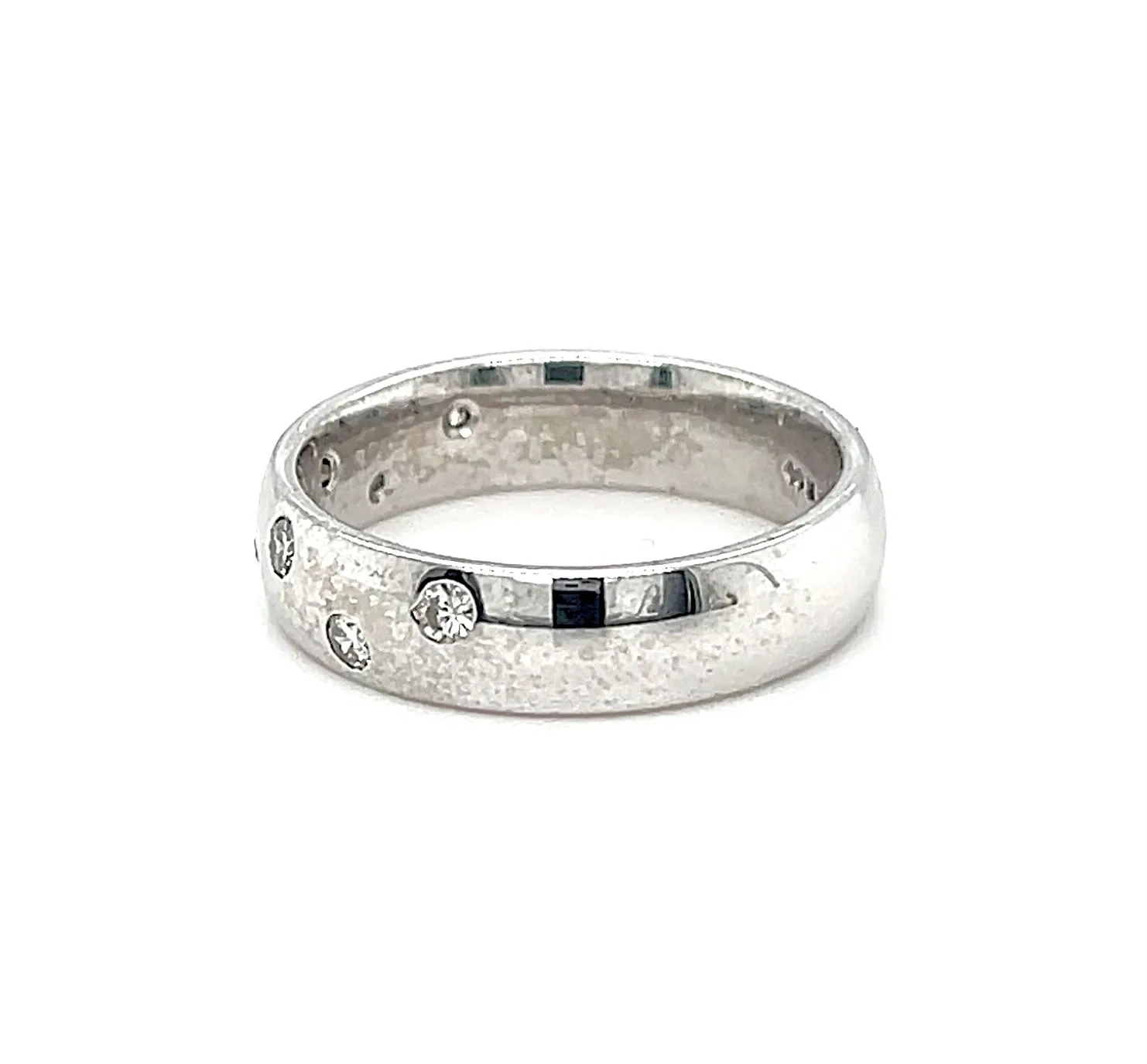 0.07ct Diamond & 18ct White Gold 5mm Court Band – 6.3g A timeless expression of elegance, this 5mm court band is crafted in 18ct white gold and set with 0.07 carats of sparkling diamonds. Weighing 6.3 grams, it combines a substantial feel with comfortable wearability. The classic court profile features gently rounded edges, ensuring a smooth fit while showcasing the subtle brilliance of the diamonds. Perfect as a wedding band, anniversary ring, or stacking piece, this band embodies sophistication, durability, and enduring style.