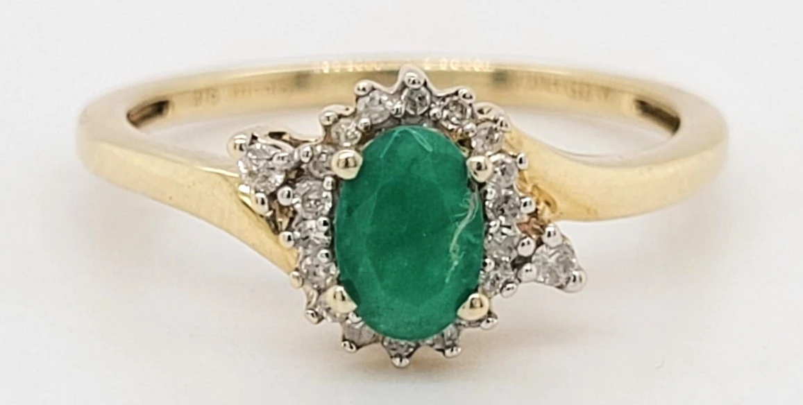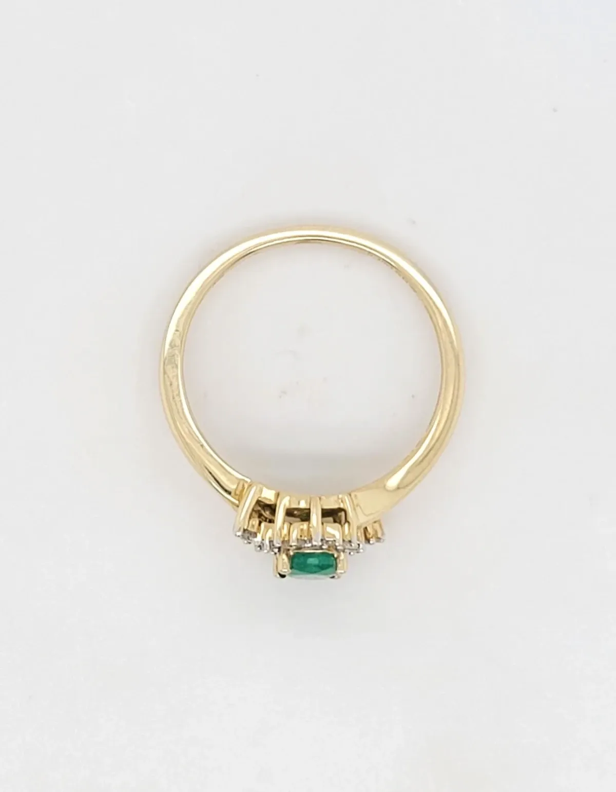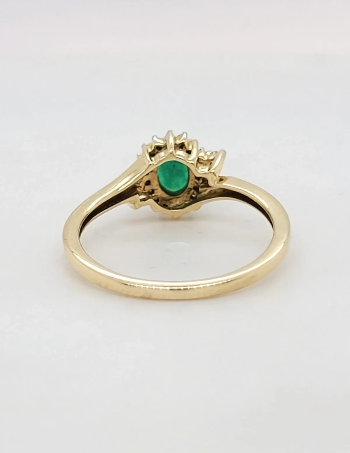 Timeless elegance meets vivid colour in this stunning emerald and diamond halo ring. Crafted from 9ct yellow gold and weighing 1.7g, this elegant piece features a 0.50ct vibrant emerald at its centre, beautifully framed by a sparkling 0.10ct diamond halo. The solitaire setting highlights the rich green hue of the emerald, while the surrounding diamonds add brilliance and sophistication. A perfect choice for a meaningful gift, engagement ring, or a striking addition to your jewellery collection.