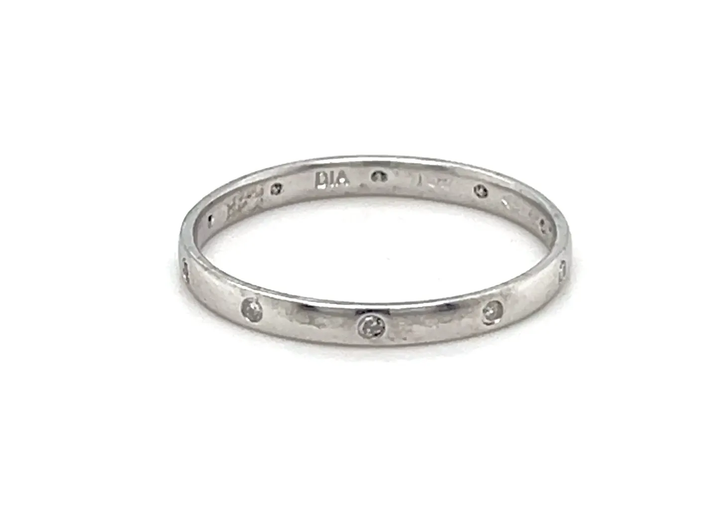 0.10ct Diamond & Platinum 2mm Wedding Band – 1.6g This delicate 2mm wedding band is expertly crafted in enduring platinum and set with a total of 0.10 carats of sparkling diamonds. Its slim profile makes it perfect for stacking with other rings or wearing alone for a subtle, elegant look. Weighing just 1.6 grams, the ring is lightweight and comfortable for daily wear. The high-quality platinum enhances the natural brilliance of the diamonds, creating a timeless piece that symbolises everlasting love. Details: