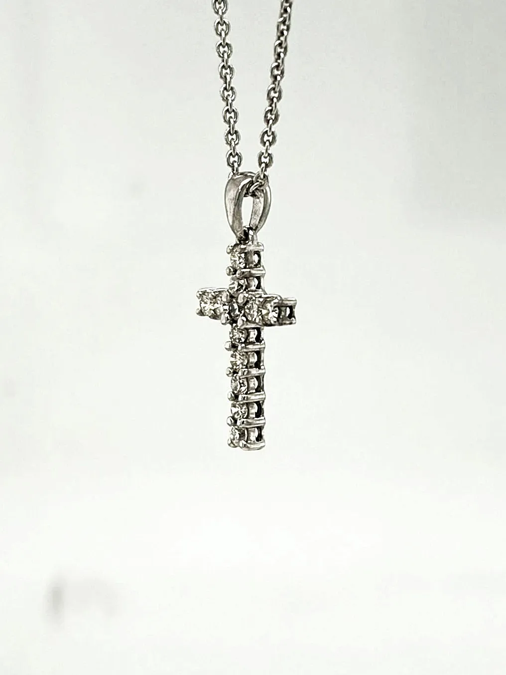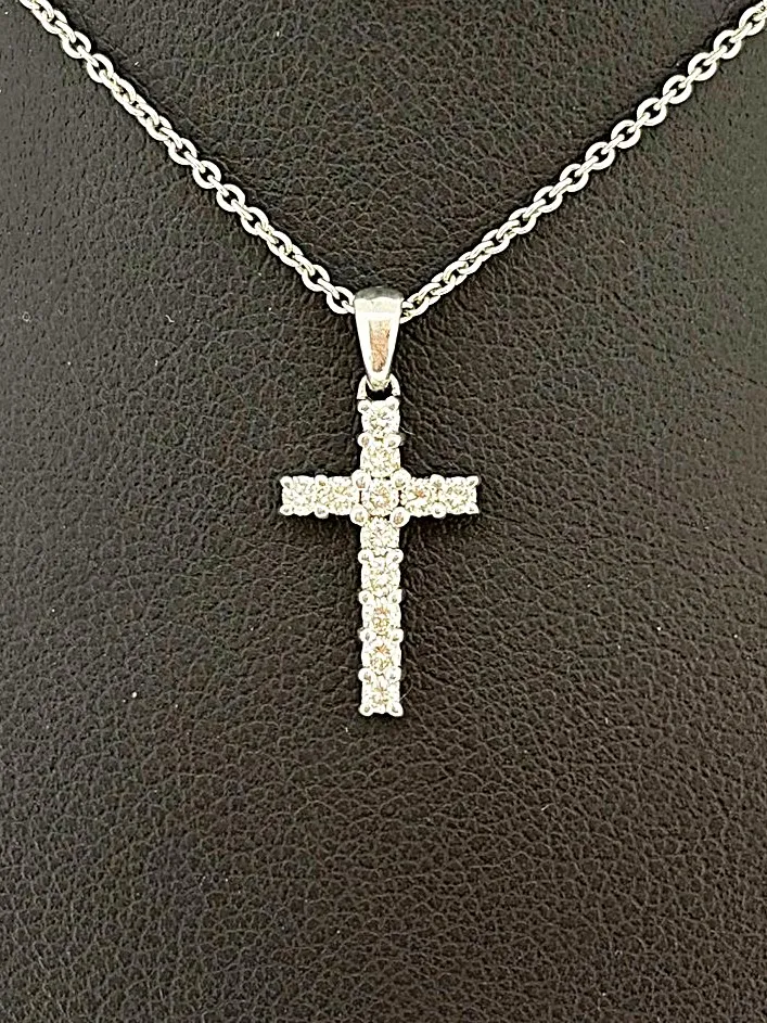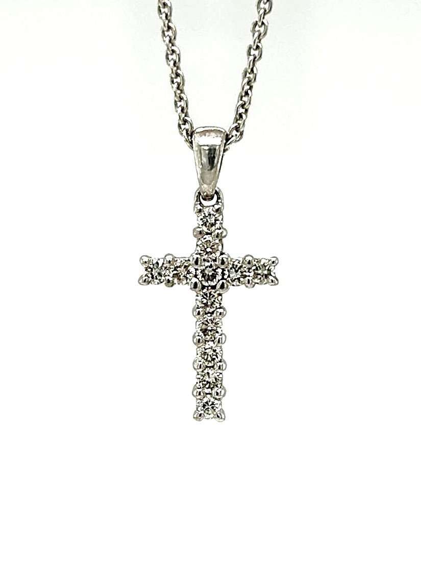 A delicate symbol of faith and elegance, this 0.15ct Diamond & 18ct White Gold Cross Pendant is a timeless piece for everyday wear or special occasions. Crafted from lustrous 18ct white gold and weighing approximately 1.0 gram, the pendant features a refined cross design measuring 20mm x 9.6mm x 2.5mm. Adorned with sparkling diamonds totalling 0.15 carats, each stone is expertly set to catch the light and enhance the pendant’s subtle sophistication. Its compact size and polished finish make it ideal for layering with other necklaces or wearing alone as a delicate statement. Perfect as a gift or a meaningful addition to your personal collection, this white gold diamond cross pendant combines elegance, quality, and timeless style. Key Features: