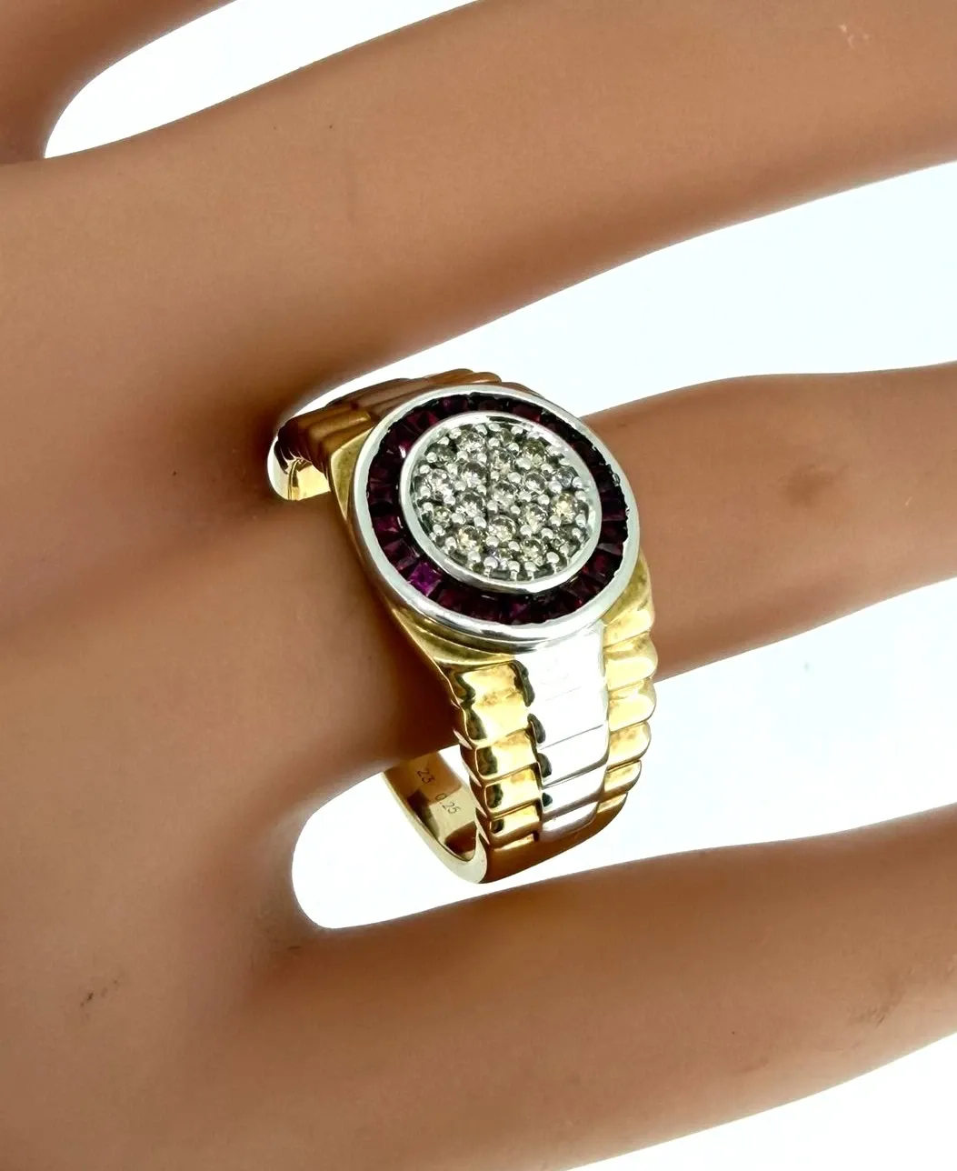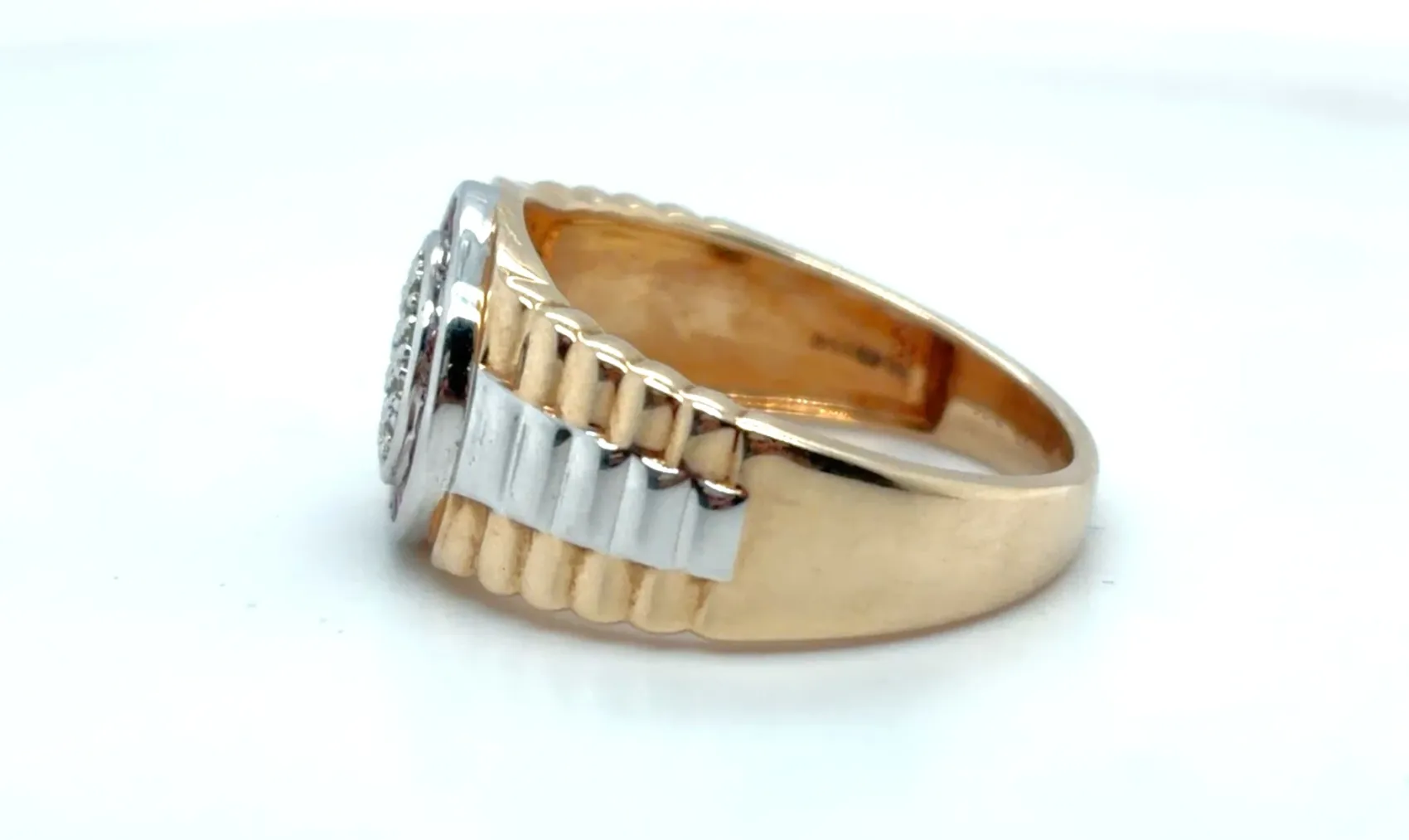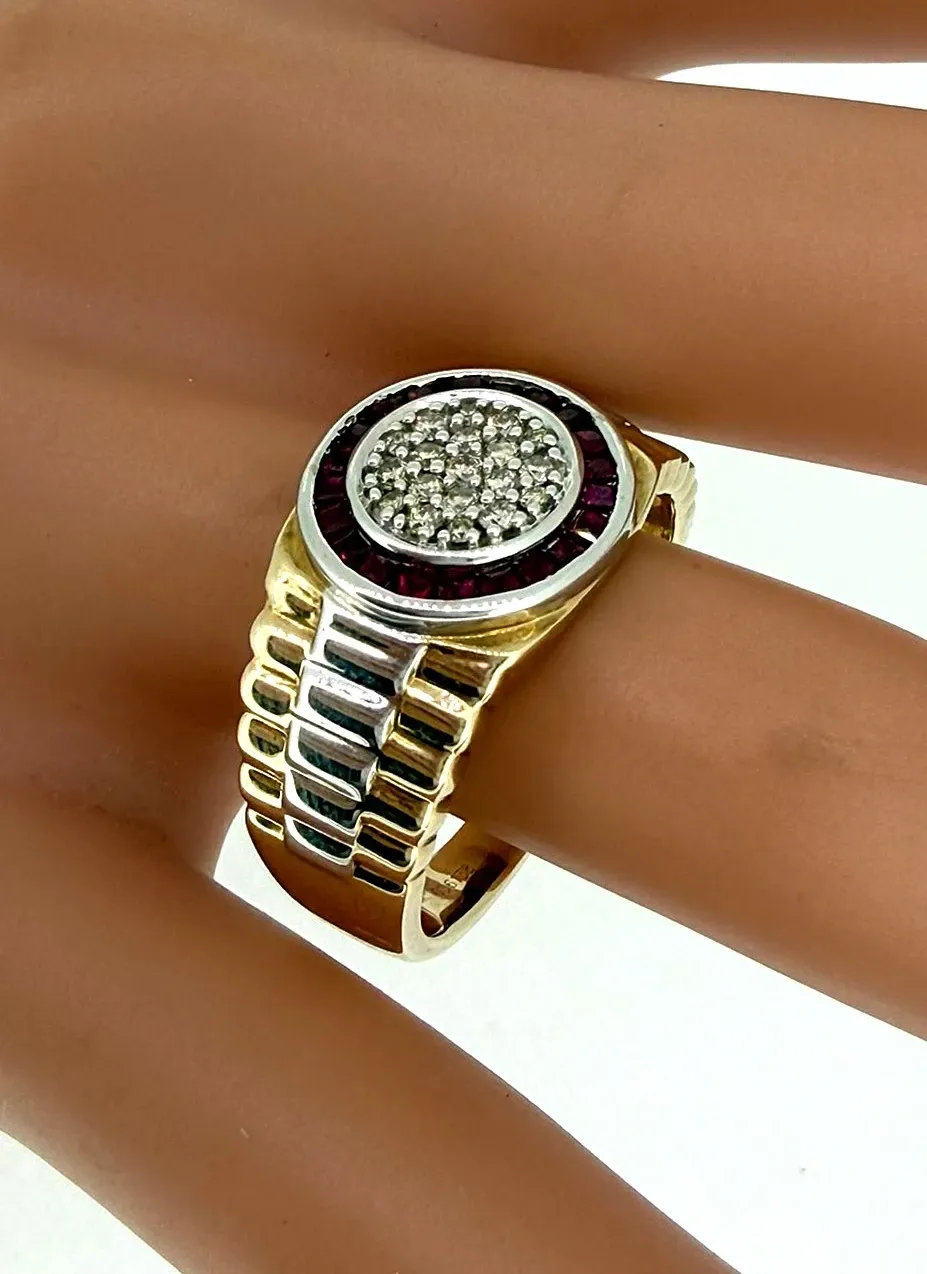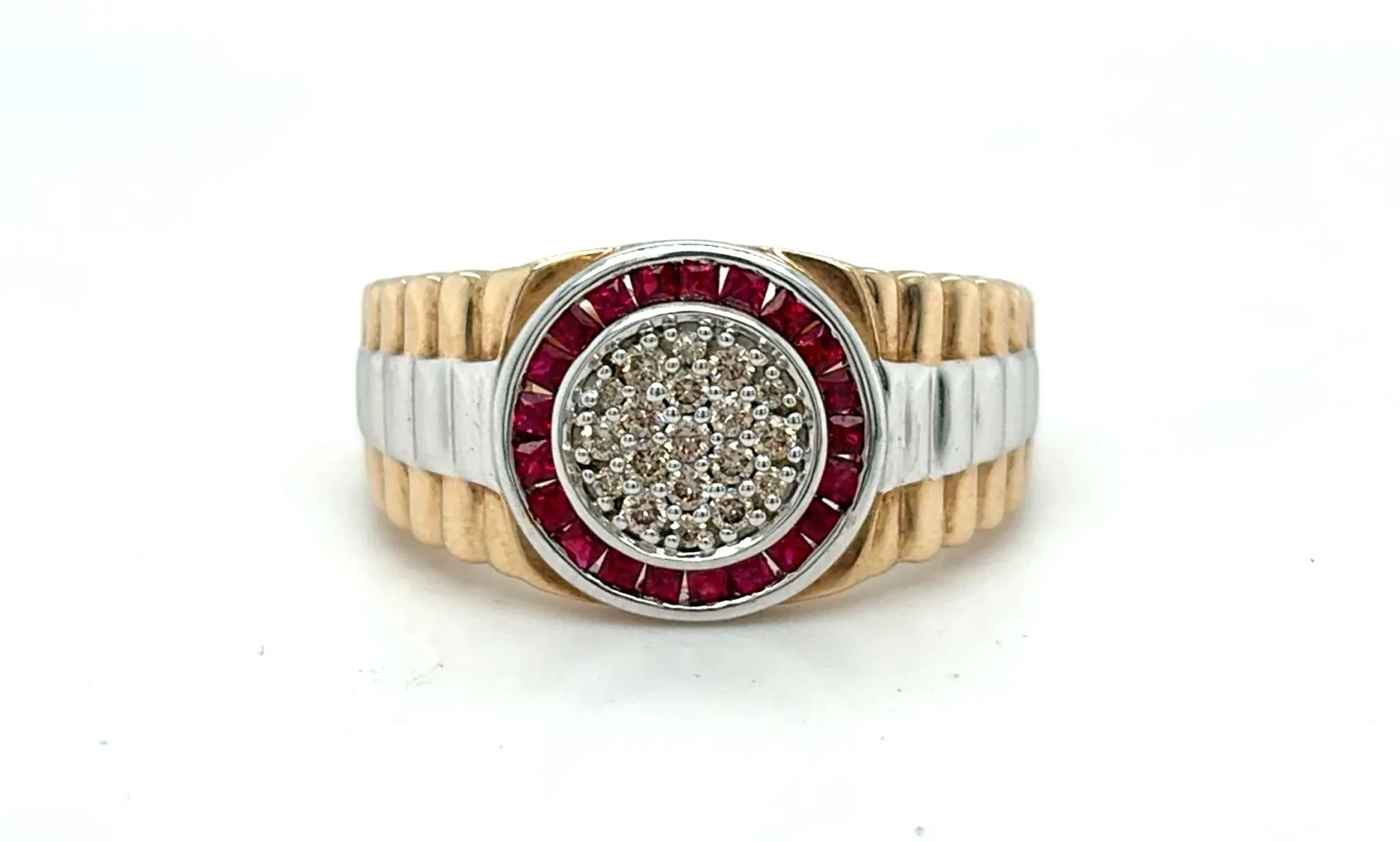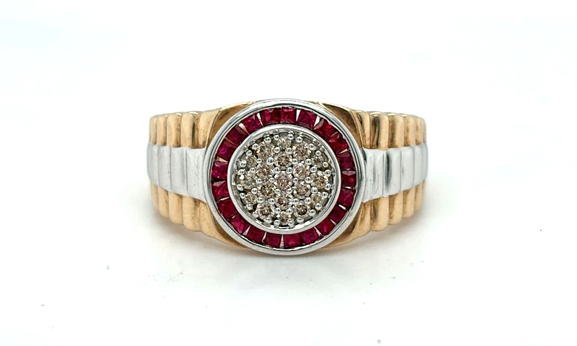 0.15ct Ruby & 0.10ct Diamond Signet Ring – 9ct Gold, 5.8g Make a sophisticated statement with this 0.15ct Ruby & 0.10ct Diamond Signet Ring, crafted in 9ct gold. Featuring a rich red ruby accented with sparkling diamonds, this ring exudes timeless elegance and classic style. Weighing 5.8 grams, it offers a comfortable yet substantial feel, perfect as a distinctive everyday accessory or a standout piece for special occasions. Ideal for those who appreciate fine craftsmanship and luxurious design. Details: