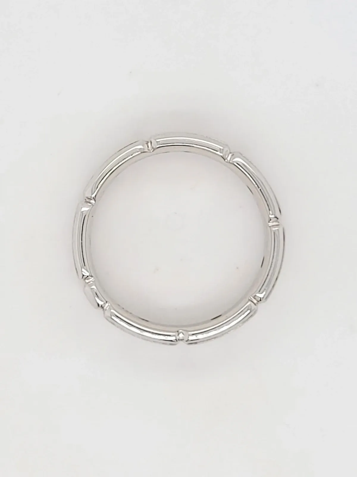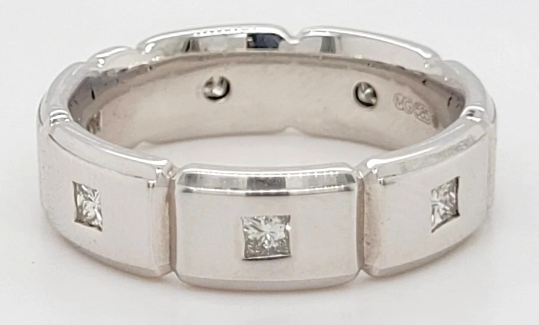 0.24ct Diamond & 14ct White Gold Gents 5.7mm Wedding Band – 7.3g This sophisticated gents wedding band combines classic elegance with a modern edge. Crafted in luxurious 14ct white gold and weighing 7.3 grams, the band measures 5.7mm in width, offering a substantial yet comfortable fit. Set with 0.24 carats of sparkling diamonds, this ring adds a refined touch of brilliance, perfect for the discerning groom who appreciates subtle sophistication. The smooth, polished finish and clean lines ensure this ring is as timeless as it is stylish. Whether as a wedding ring or a statement piece, this band is designed to be cherished for a lifetime.