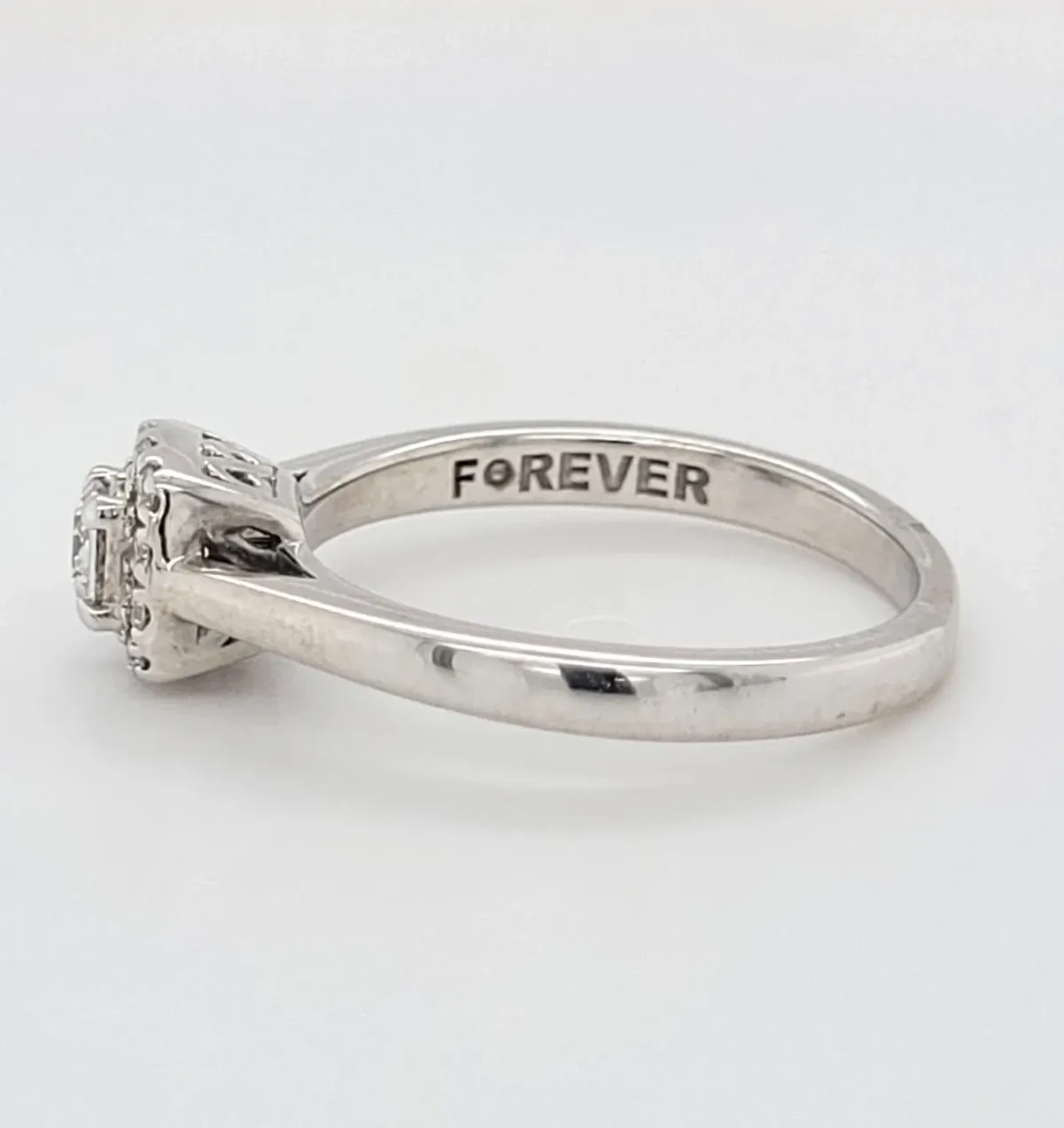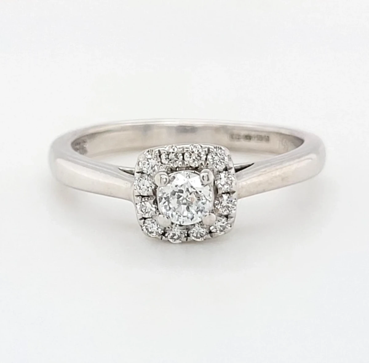 The halo setting beautifully frames the centre stone, catching light from every angle for an eye-catching sparkle. Perfect as an engagement ring or a special occasion gift, this piece combines classic elegance with contemporary charm.