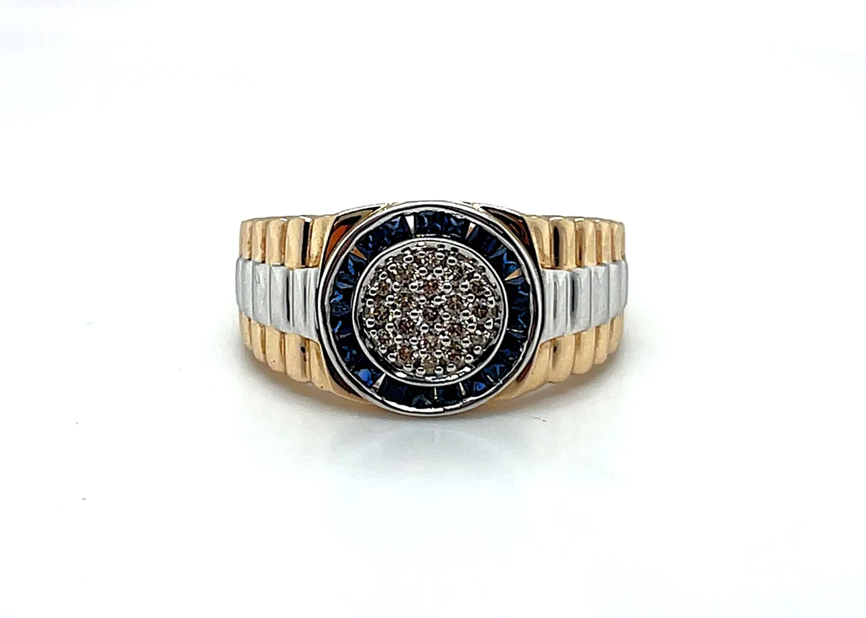 0.25ct Sapphire & 0.23ct Diamond Gents Ring – 9ct Gold 7.4g A bold and sophisticated design, this gents ring features a striking 0.25ct sapphire accented by 0.23ct of sparkling diamonds, all set in 9ct yellow gold. Weighing 7.4 grams, it combines substance with refined style, making it a distinguished choice for everyday wear or special occasions. This luxurious ring pairs the deep blue of sapphire with the brilliance of diamonds, offering a timeless piece that symbolises strength, elegance, and individuality.