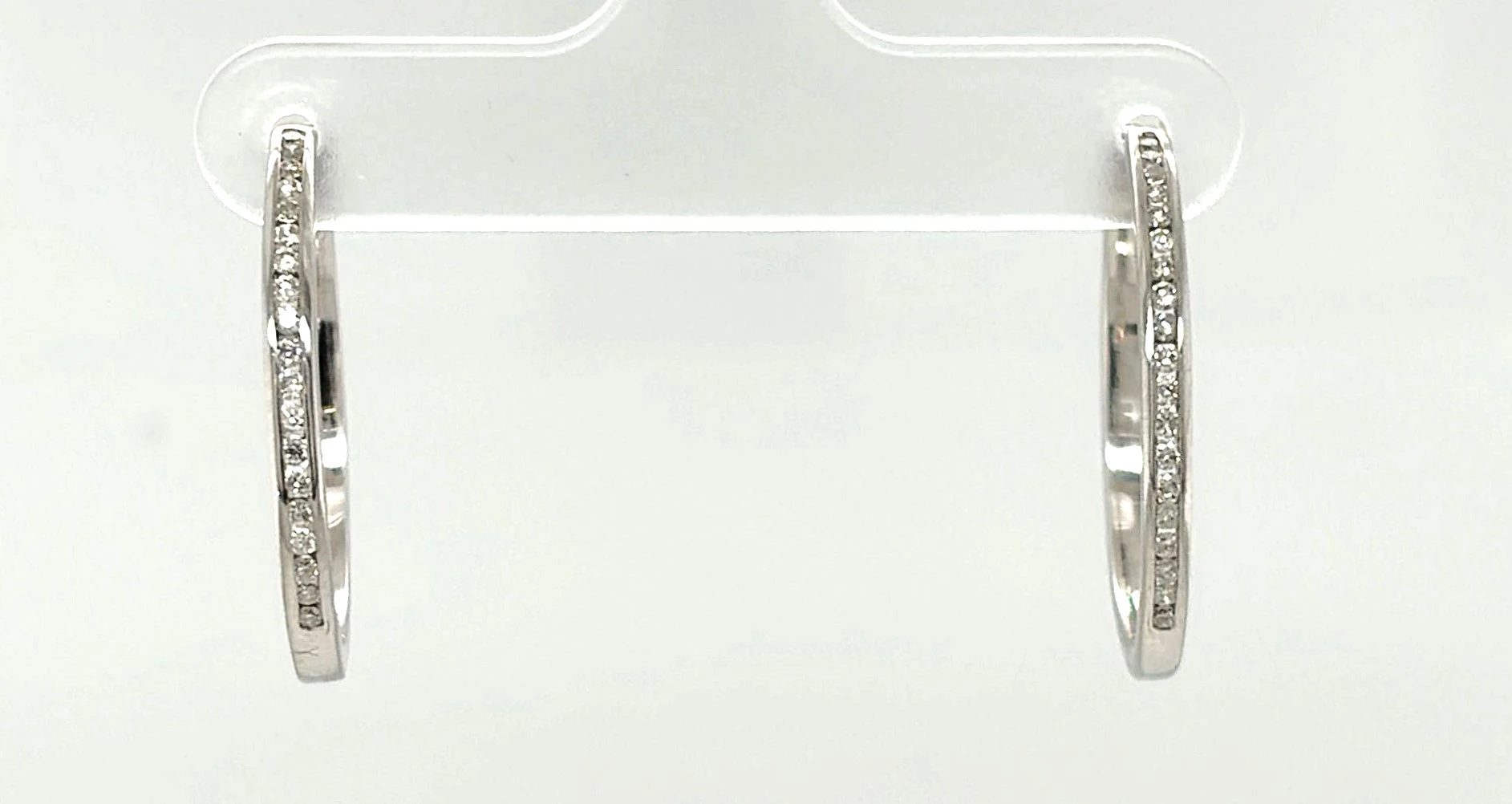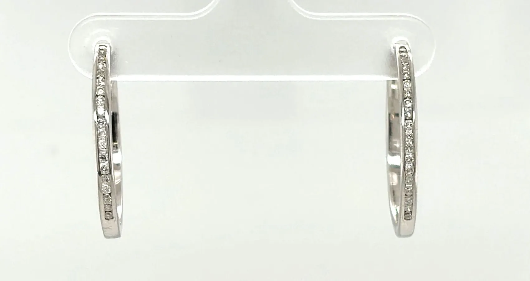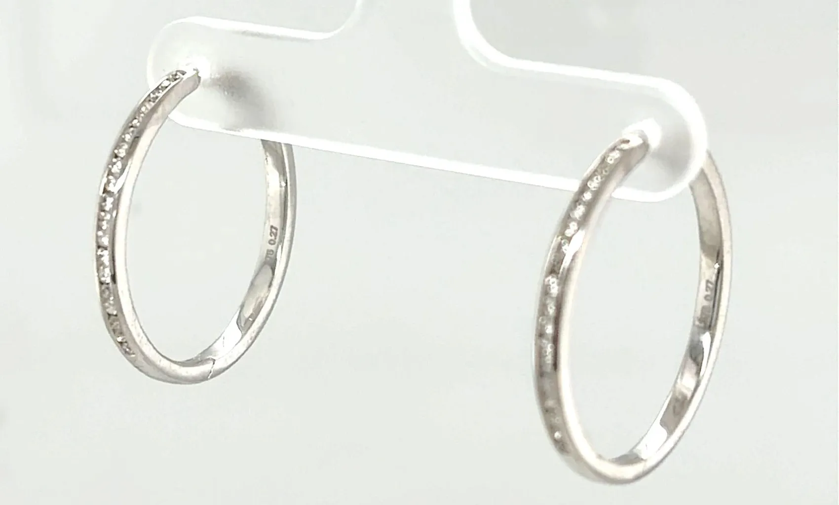 Add sparkle and sophistication to your collection with these 0.27ct diamond hoop earrings, crafted in 9ct white gold. Measuring 24mm in diameter and 2.0mm in width, these elegant hoops feature expertly set diamonds that catch the light beautifully for a brilliant shine. Weighing 4.2g, they offer a comfortable fit while retaining a luxurious feel. The secure hinged fastening ensures safe, all-day wear, making these hoops perfect for both everyday elegance and special occasions. Timeless in design, they are a versatile addition to any jewellery collection. Details: