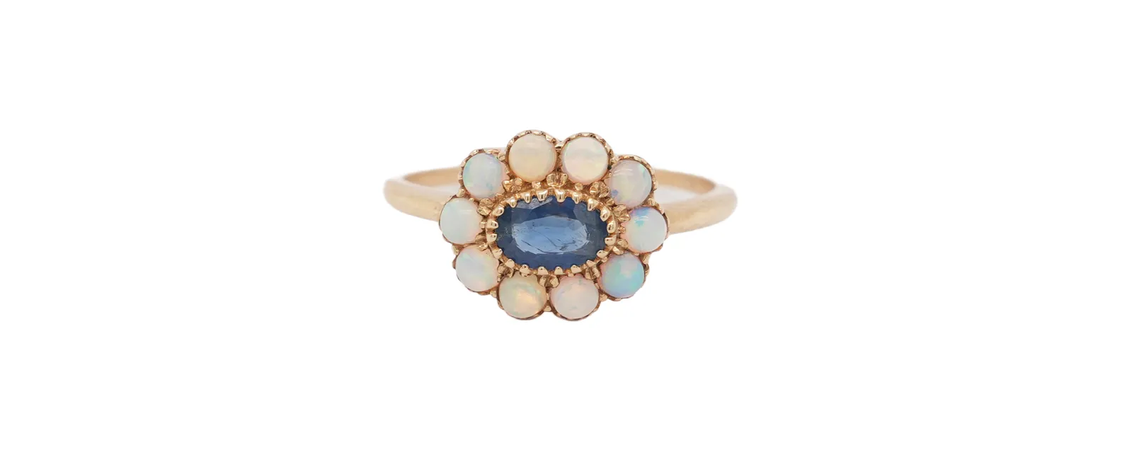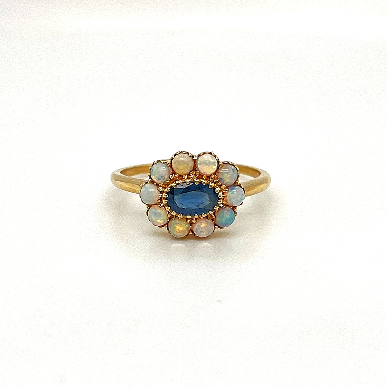 0.30ct Sapphire & Opal 9ct Gold Dress Ring – 1.8g Delicate and enchanting, this dress ring features a 0.30 carat sapphire paired with a luminous opal, set in 9ct yellow gold. Weighing just 1.8 grams, it offers a lightweight, comfortable fit while radiating elegance and colour. The deep blue of the sapphire beautifully contrasts with the opal’s iridescent play-of-colour, creating a unique and captivating design. Perfect for adding a touch of sophistication to any outfit, this ring is a charming statement piece for everyday wear or special occasions.