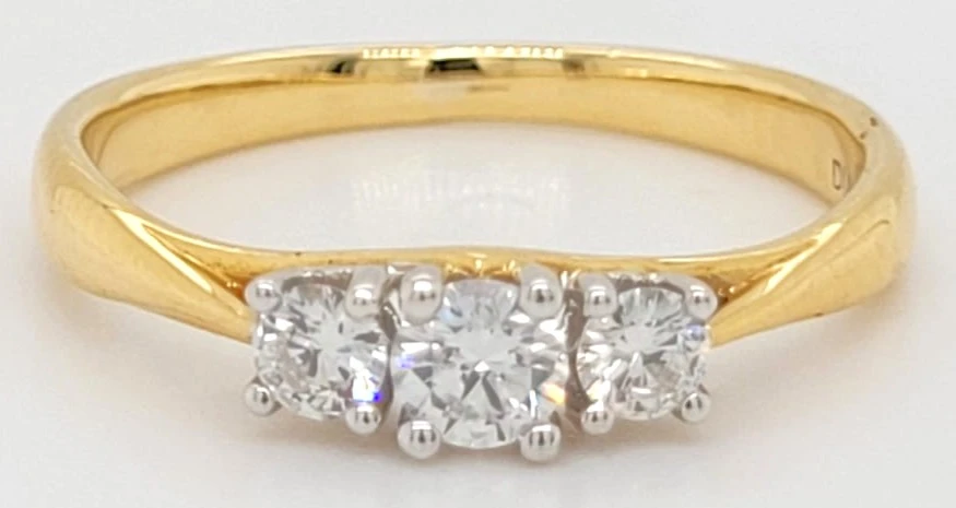 0.33ct Diamond & 18ct Gold Trilogy Ring – 2.5g, Size N Timeless in design and rich in meaning, this exquisite 18ct gold trilogy ring features 0.33 carats of brilliant-cut diamonds, beautifully symbolising the past, present, and future. Each diamond is meticulously set to create a radiant trio, offering a delicate balance of sparkle and sentiment. Crafted in luxurious 18ct yellow gold and weighing 2.5 grams, this elegant piece is perfect for marking a special moment—be it an anniversary, engagement, or personal milestone. The clean, classic design ensures enduring style, while the trilogy setting adds emotional depth. Available in Size N, this ring is a graceful expression of love, memory, and promise—perfect as a gift or a treasured addition to your own fine jewellery collection.