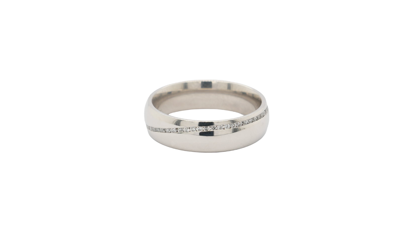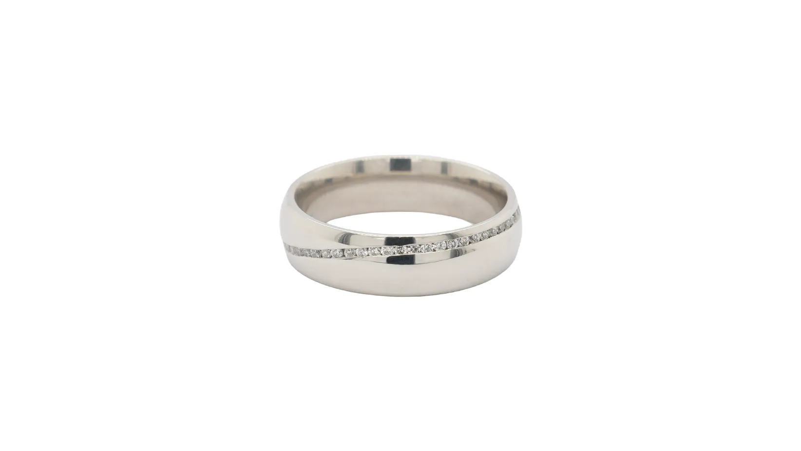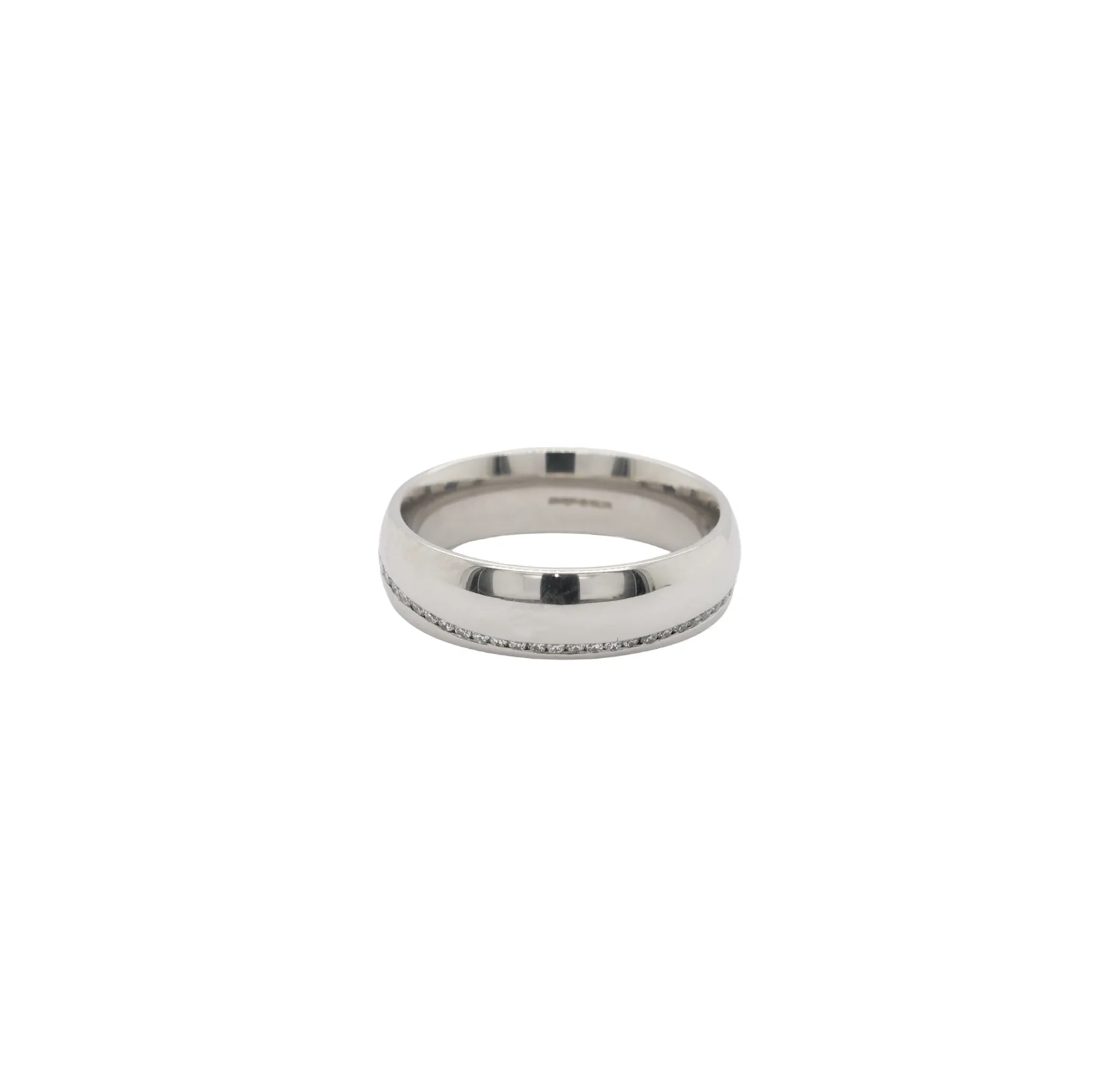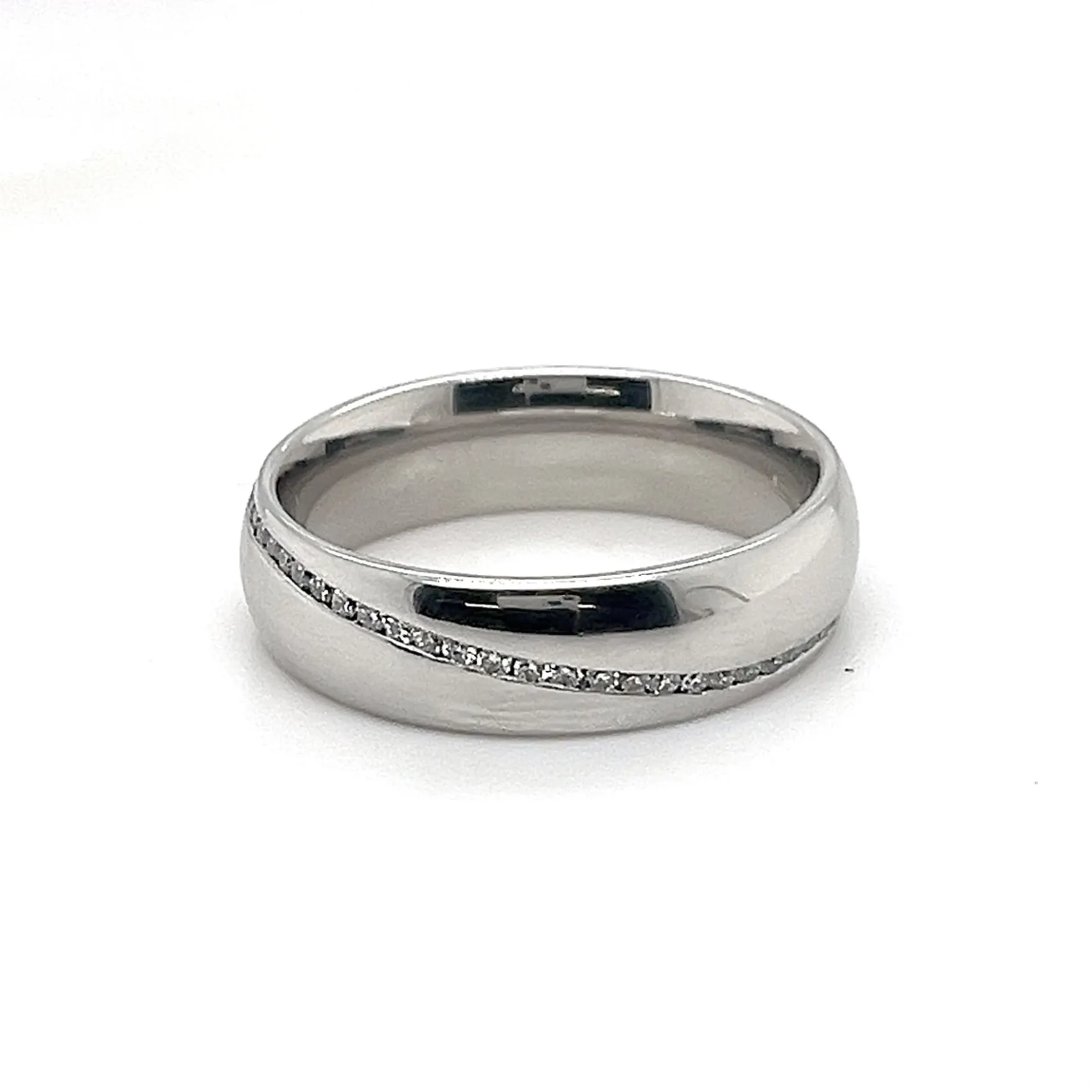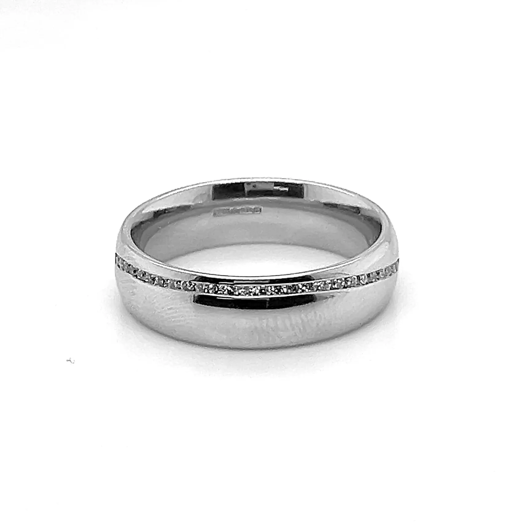 0.35ct Full Diamond & Platinum 6mm Slight Court Wedding Band – 12.3g A timeless symbol of love and commitment, this exquisite wedding band is crafted in luxurious platinum, weighing 12.3 grams for a substantial and enduring feel. Its 6mm slight court profile offers a comfortable fit with a gentle curve, blending modern elegance with classic design. Encircling the band is a full set of brilliant round-cut diamonds, totalling 0.35 carats, meticulously channel-set for a refined sparkle from every angle. The seamless design ensures durability while allowing each diamond to catch the light beautifully, symbolising everlasting unity.