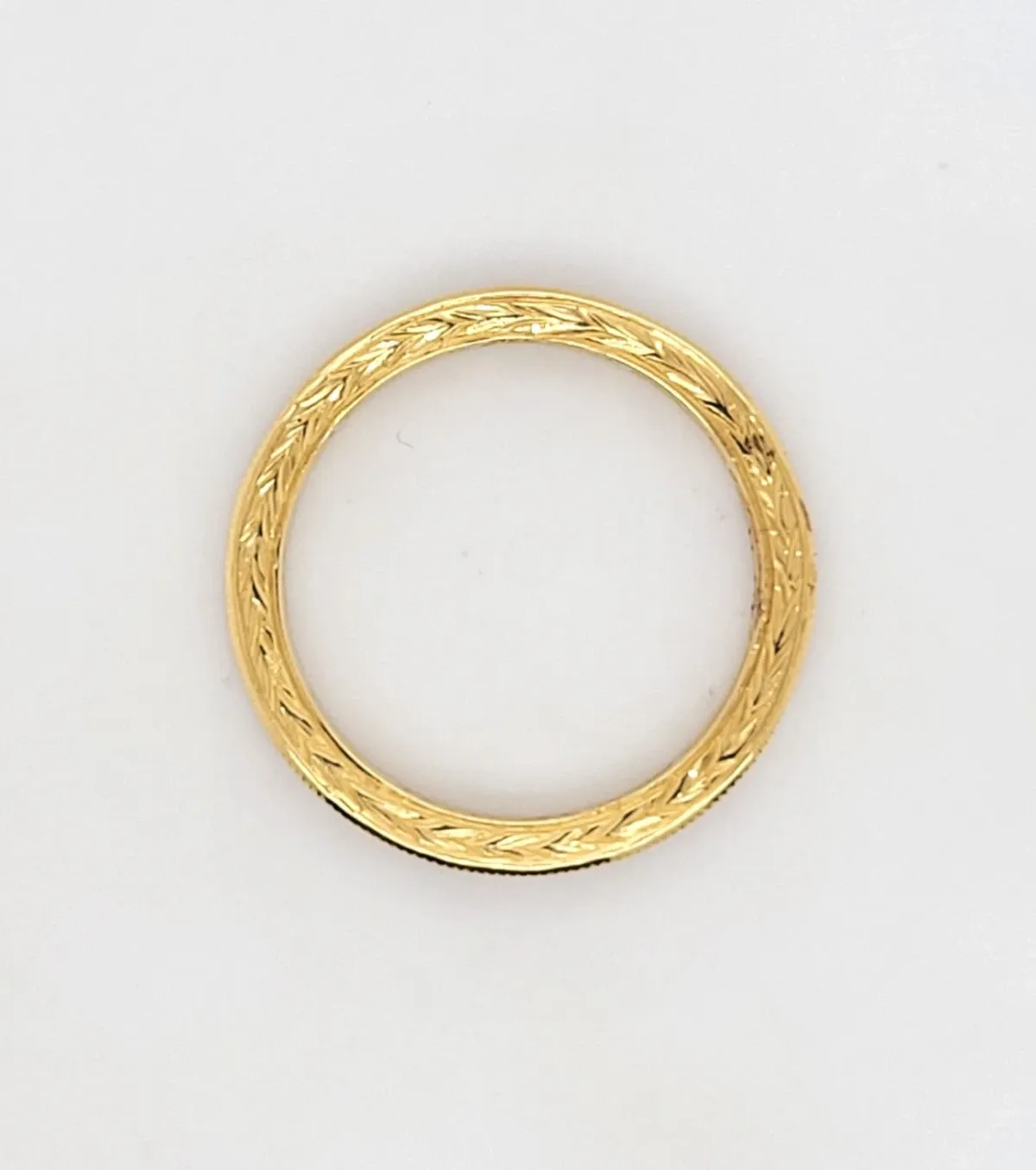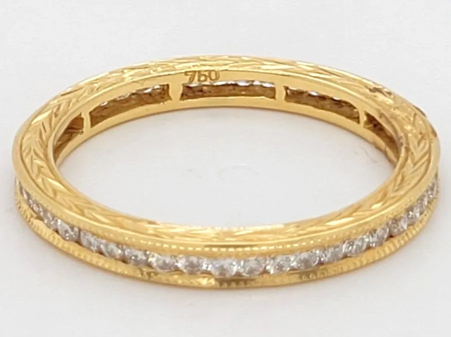 0.52ct Diamond & 18ct Gold Full Eternity / Wedding Band with Fancy Side Detail – 2.6g Delicate yet dazzling, this 0.52ct full eternity wedding band is expertly crafted in luxurious 18ct gold and set with 52 brilliant-cut diamonds around the entire band. Weighing 2.6 grams, it’s a fine, elegant piece made with exceptional attention to detail. What sets this ring apart is its intricate fancy pattern engraved along the side, adding a subtle decorative touch visible only to the wearer or those who look closely — a beautiful hidden detail symbolising love and craftsmanship. Perfect as a wedding ring, eternity band, or stacking piece, it offers timeless sparkle in a refined, lightweight design.