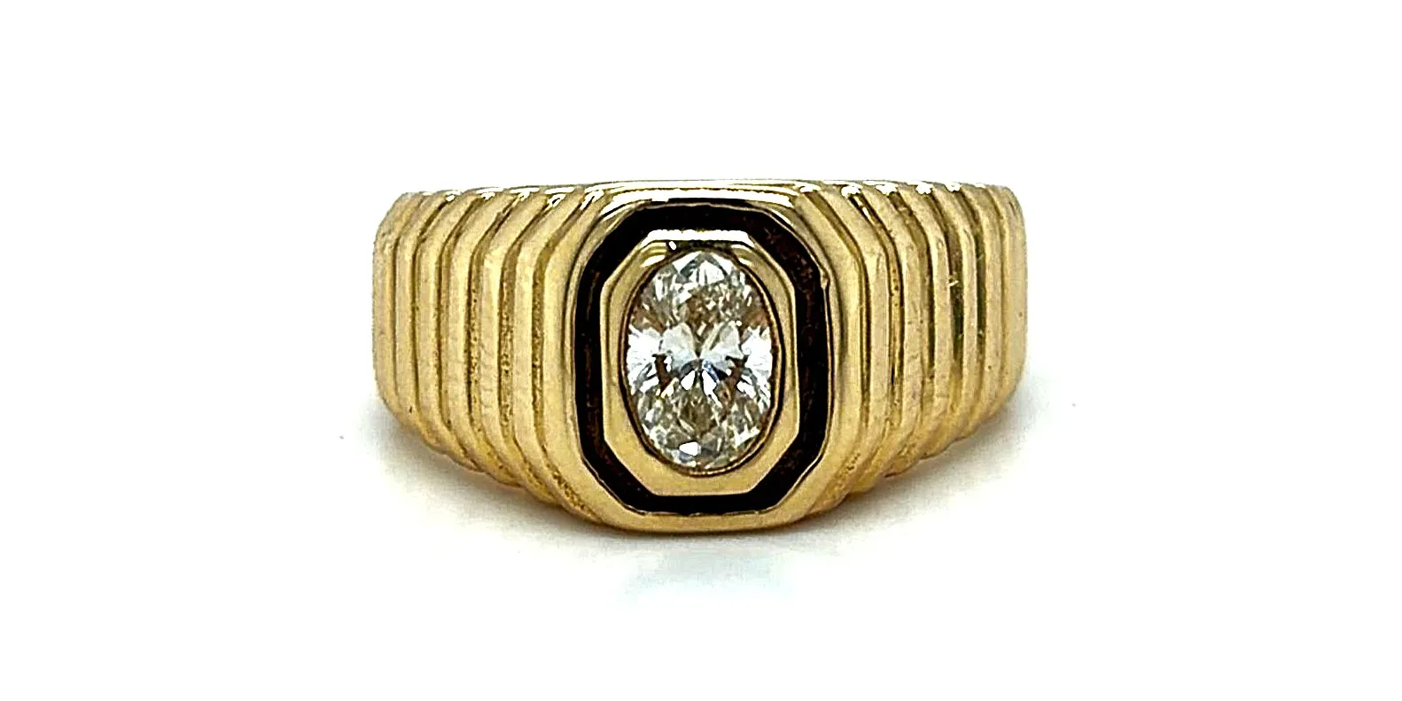Bold and refined, this oval diamond signet ring is crafted in 14ct gold and set with a striking 0.57 carat oval-cut diamond. The classic signet design is elevated with the brilliance of a centrally set diamond, creating a distinguished yet contemporary statement piece. Weighing a substantial 8.2 grams, the ring offers a solid, premium feel while maintaining comfort for everyday wear. The polished gold finish enhances the diamond’s sparkle, making this piece suitable as a gent’s dress ring, statement ring, or luxury gift. Combining traditional signet styling with modern diamond detailing, this ring is a timeless addition to any fine jewellery collection.
