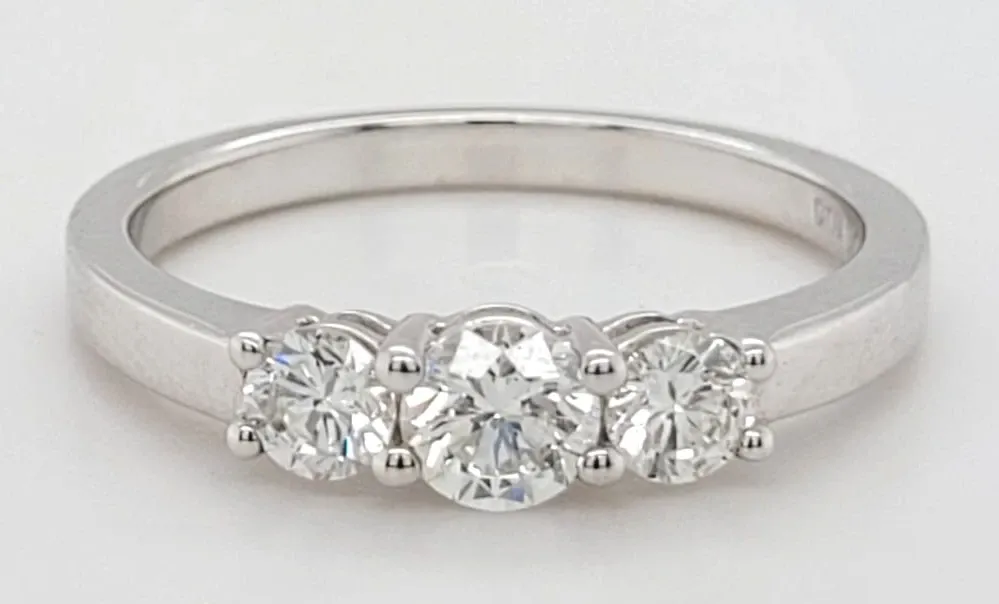 0.75ct Diamond & 18ct White Gold Trilogy Ring – 3.7g Timeless elegance meets meaningful design in this exquisite 0.75 carat diamond trilogy ring, crafted in luxurious 18ct white gold. Weighing 3.7 grams, this piece strikes a perfect balance between sophistication and wearability. Featuring three brilliant-cut diamonds, the trilogy setting symbolises your past, present, and future — a romantic gesture ideal for engagements, anniversaries, or milestone moments. Each diamond has been hand-selected for its exceptional sparkle, set in a sleek, polished band that enhances the stones' natural brilliance. Whether worn alone or paired with a wedding band, this ring is a classic statement of enduring love and style.