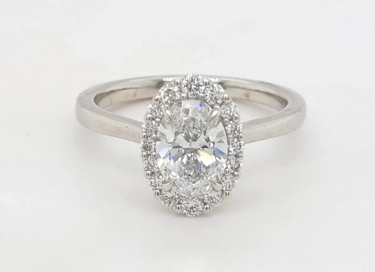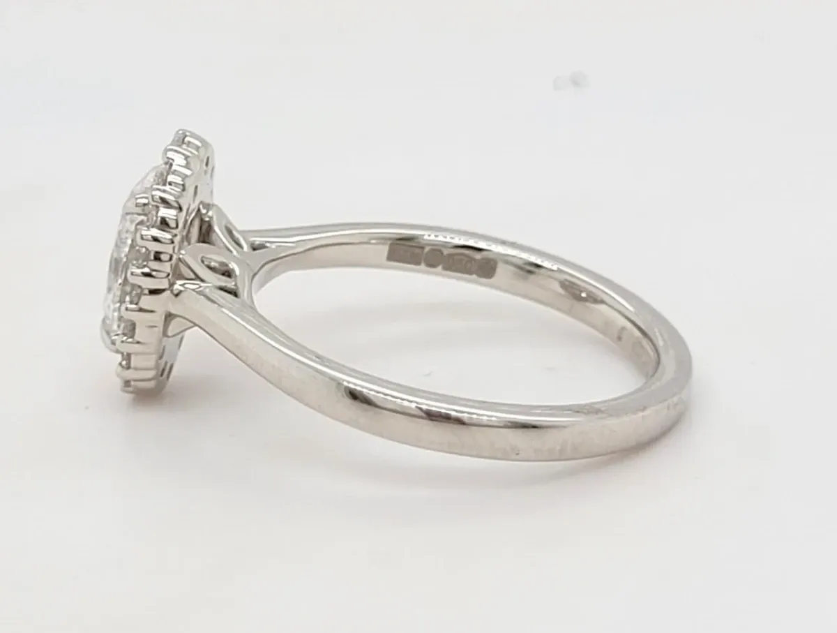 1.26ct Lab Grown Diamond Halo Solitaire Ring in Platinum (6.0g) Discover understated elegance with this exquisite 1.26 carat lab grown diamond halo solitaire ring, crafted in premium platinum. The central diamond is beautifully framed by a halo of smaller diamonds, enhancing its brilliance and creating a captivating sparkle from every angle. With a substantial weight of 6.0 grams, the durable platinum setting offers a luxurious feel and exceptional strength, perfect for daily wear or special occasions. Made with ethically sourced, conflict-free lab grown diamonds, this ring combines responsible luxury with timeless design. Details: