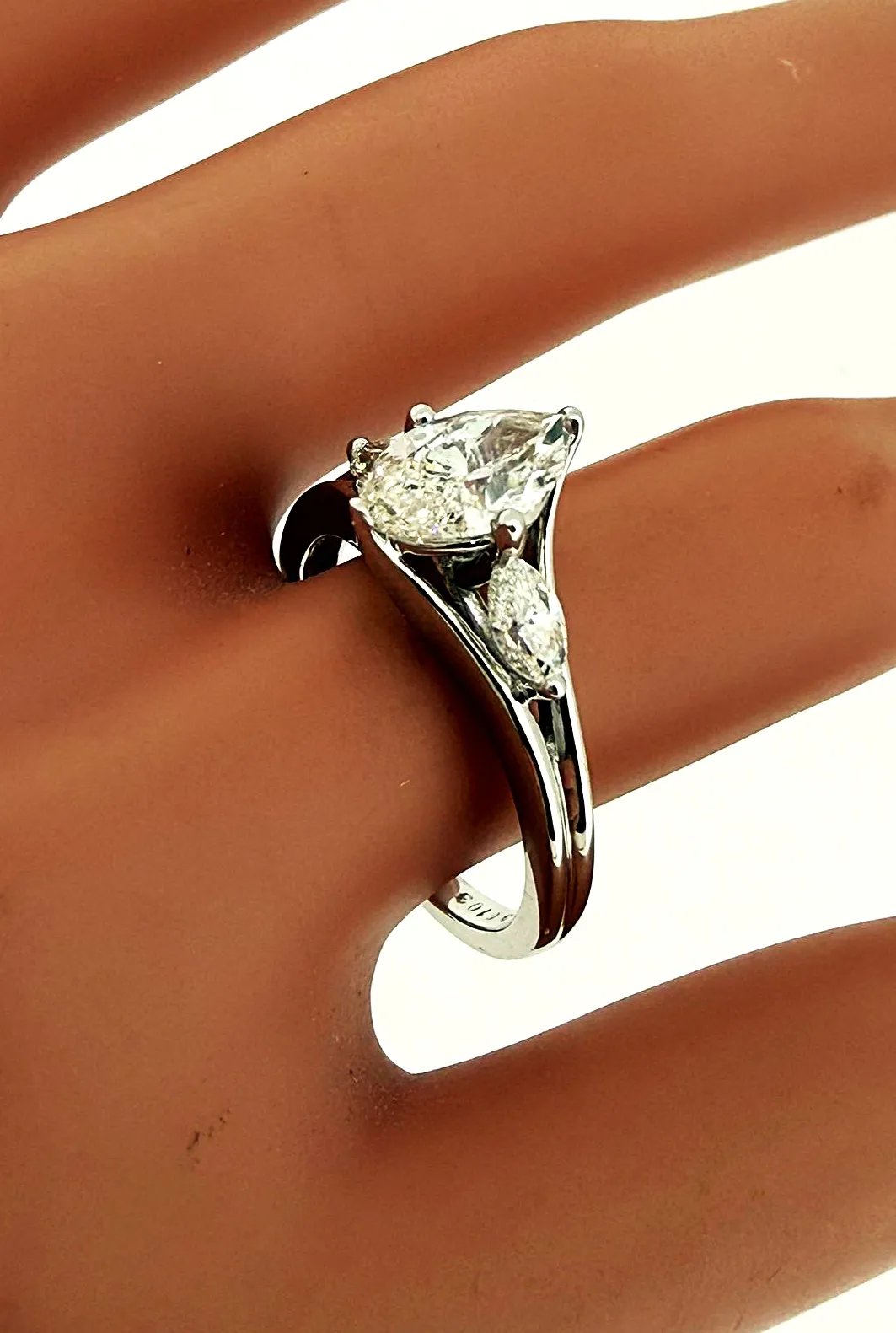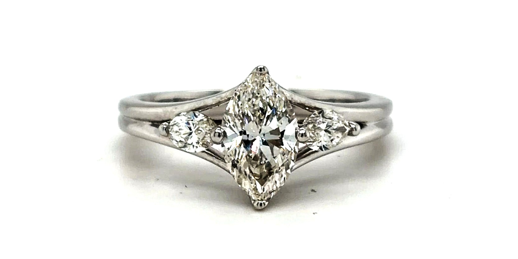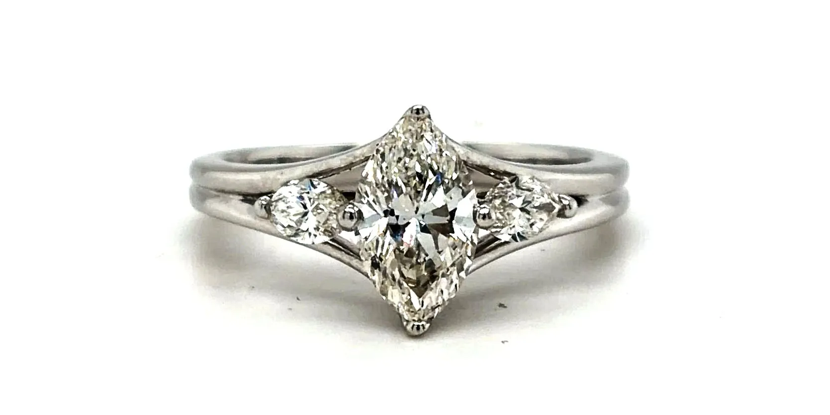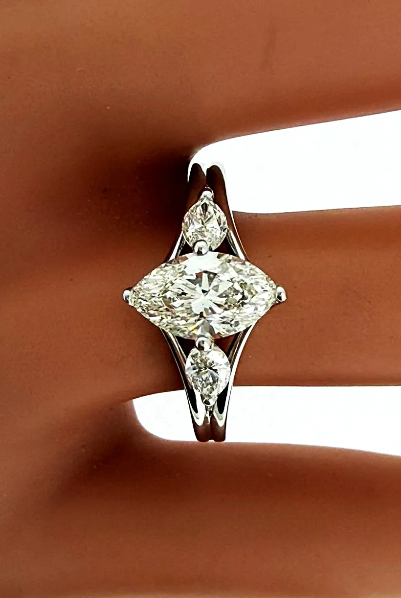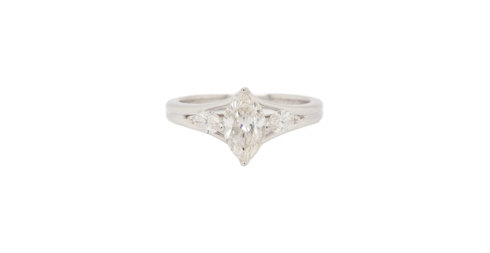 Elegant and distinctive, this beautiful marquise-cut diamond ring is crafted in 18ct white gold and features a total of 1.39 carats of diamonds. The elongated marquise centre stone creates a flattering, finger-lengthening effect, while the trilogy-inspired design enhances brilliance and presence. Weighing 4.2 grams, the polished white gold band provides both durability and refined comfort. The classic yet eye-catching setting makes this ring ideal as an engagement ring, anniversary gift, or sophisticated dress ring. Combining timeless elegance with a unique diamond shape, this marquise solitaire/trilogy ring is a striking addition to any fine jewellery collection.