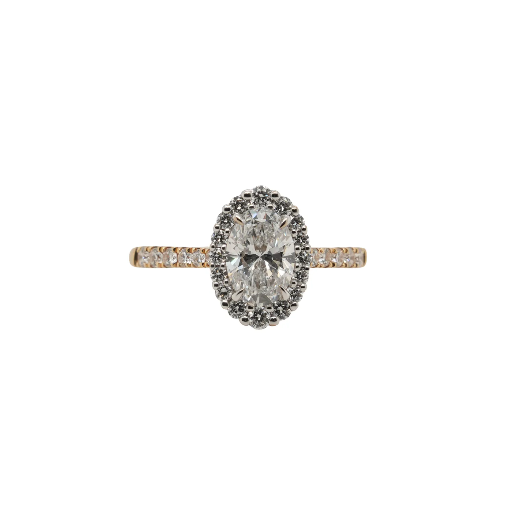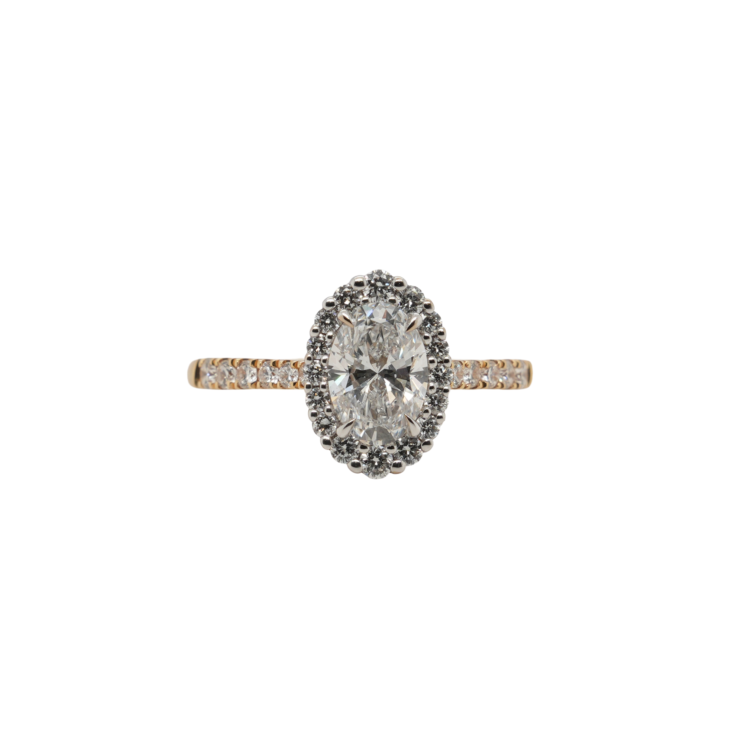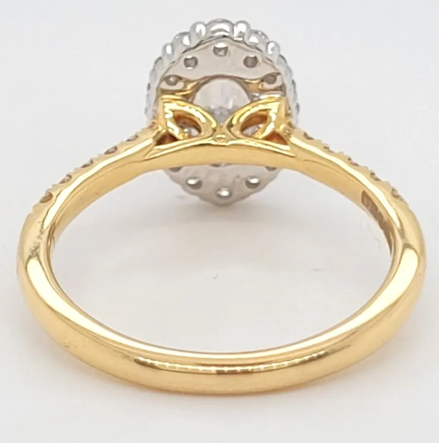 1.46ct Lab Grown Oval Diamond Halo Solitaire Ring in 18ct Gold (3.9g) Graceful and captivating, this 1.46 carat lab grown oval diamond halo solitaire ring is a perfect blend of classic elegance and modern sustainability. The striking oval-cut diamond, renowned for its elongated shape and exceptional brilliance, is beautifully encircled by a halo of smaller diamonds, enhancing its sparkle and presence. Set in rich 18ct gold and weighing 3.9 grams, the halo solitaire design exudes timeless sophistication while offering a durable and comfortable fit. This ethically sourced, conflict-free ring is an exquisite choice for engagements or special occasions, symbolising love with a conscious heart. Details: