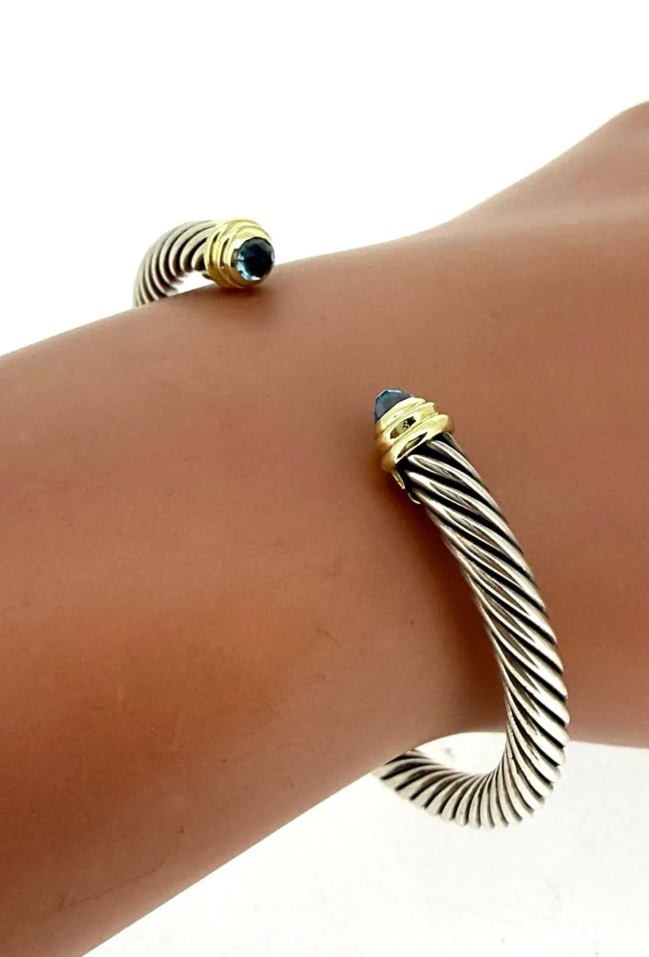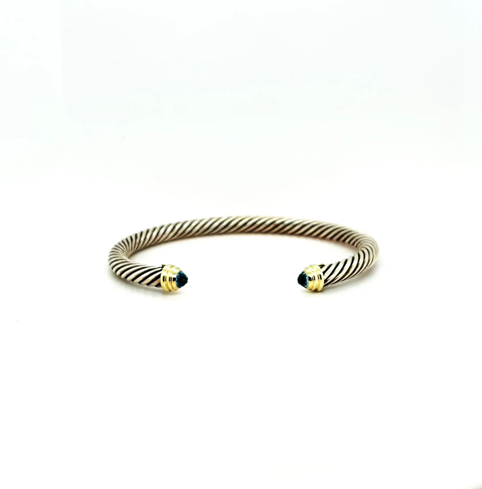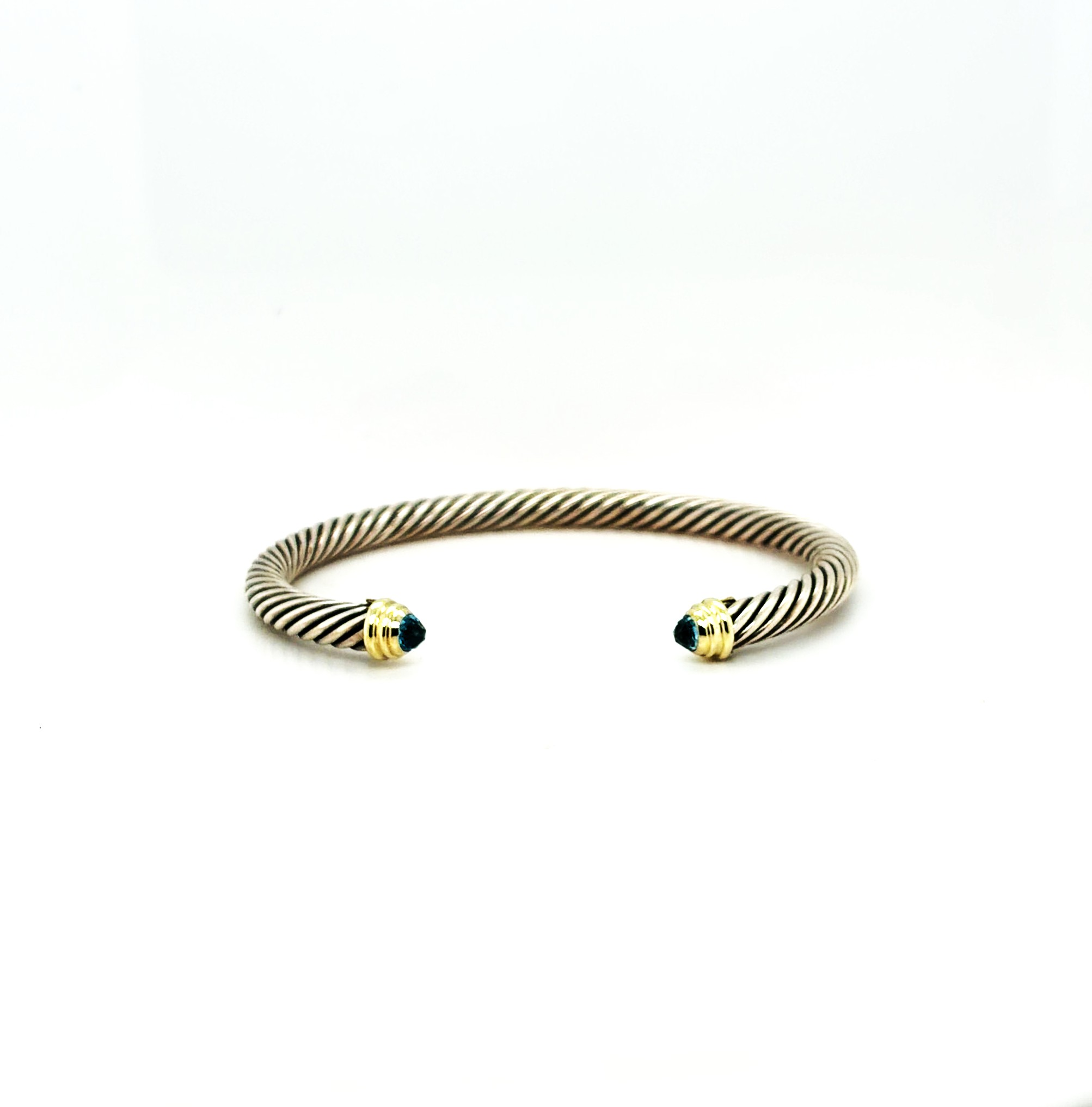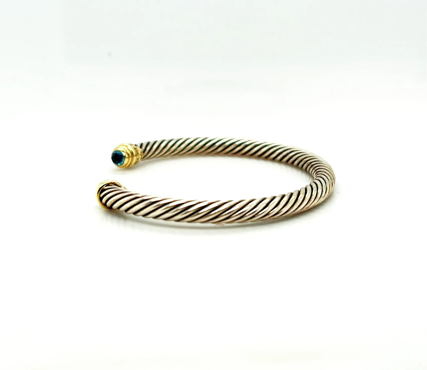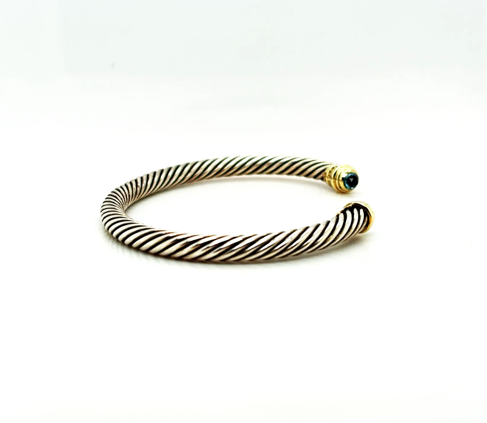 14ct Gold & Silver 6.5mm Topaz Torque Bangle – 7.5 inch, 26.0g Elevate your style with this 14ct Gold and Silver Torque Bangle, featuring a stunning 6.5mm topaz at its centre. Crafted with a harmonious blend of gold and silver, this bangle offers a sophisticated and contemporary look, perfect for adding a touch of elegance to any outfit. Measuring 7.5 inches and weighing 26.0 grams, the torque design ensures a comfortable fit while making a bold statement. Ideal as a versatile everyday accessory or a striking piece for special occasions. Details: