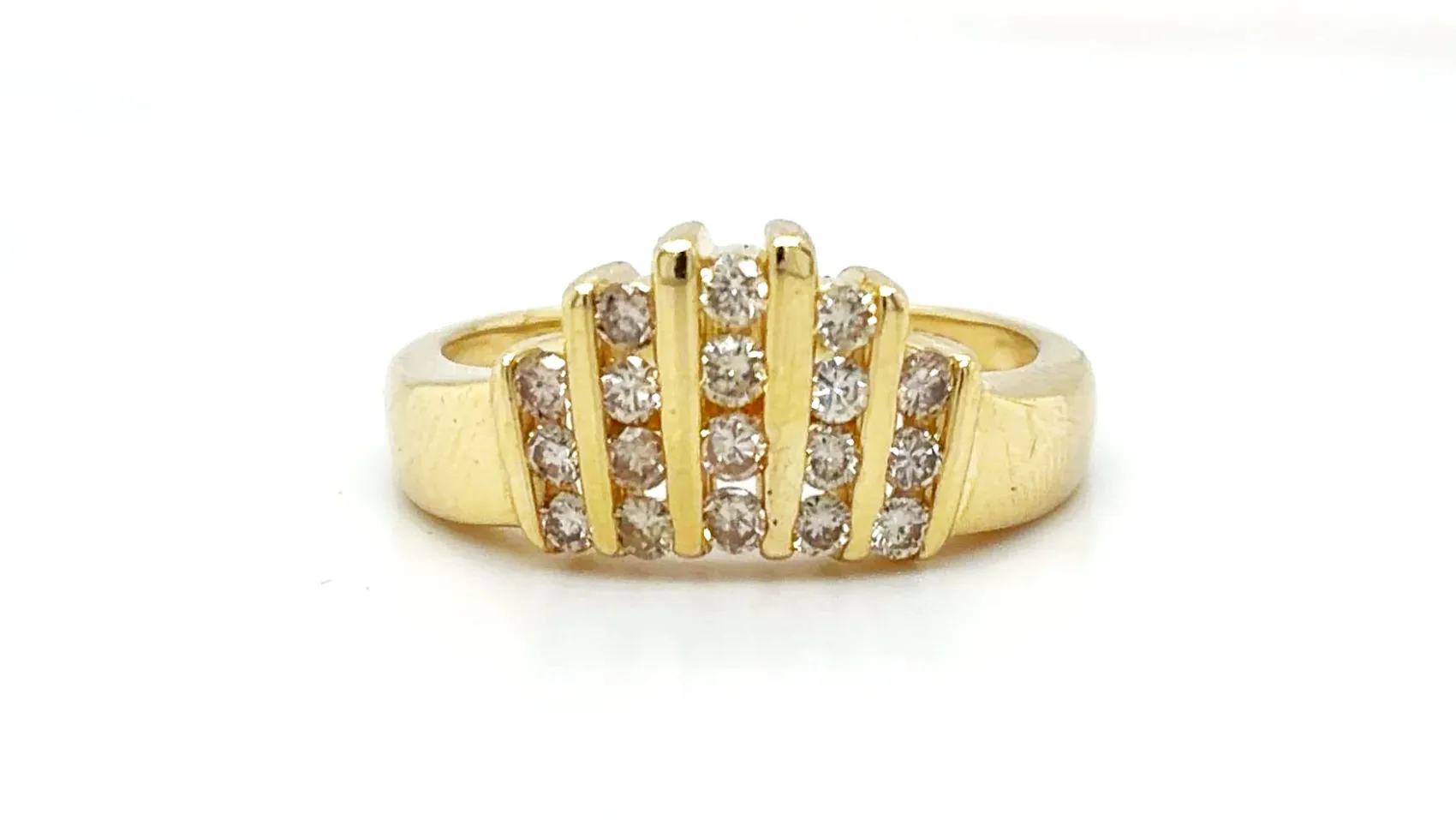 Elegant and eye-catching, this 0.48ct Diamond & 14ct Gold Dress Ring is the perfect statement piece for special occasions or evening wear. Crafted from luxurious 14ct gold and weighing approximately 4.7 grams, the ring showcases sparkling diamonds totalling 0.48 carats, carefully set to maximise brilliance and fire. The polished gold band enhances the diamonds’ natural sparkle, creating a sophisticated and timeless design. Whether worn as a cocktail ring, dress ring, or a cherished addition to your fine jewellery collection, this 14ct gold diamond ring combines classic elegance with modern style, making it a versatile and treasured piece. Key Features: