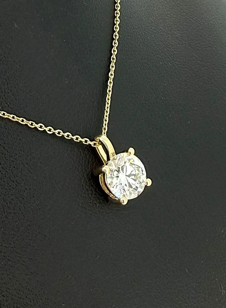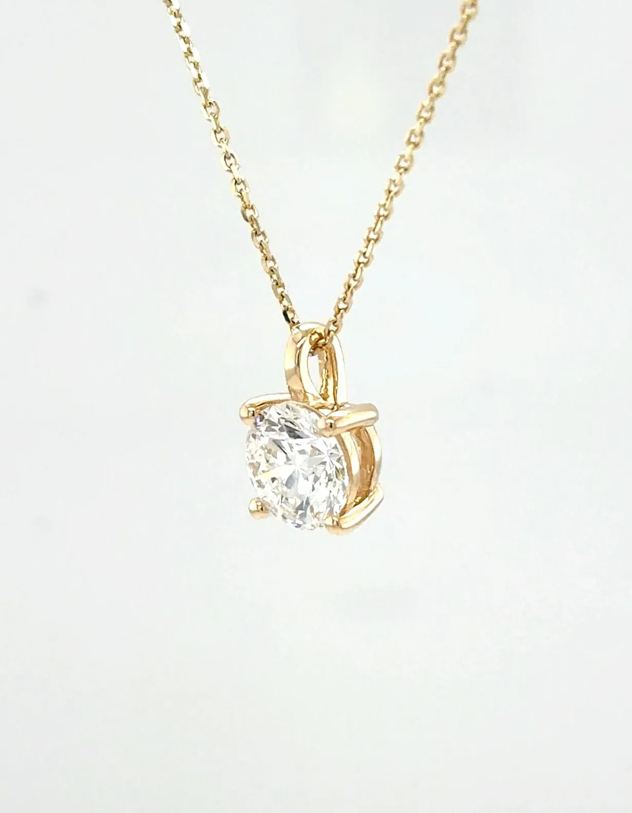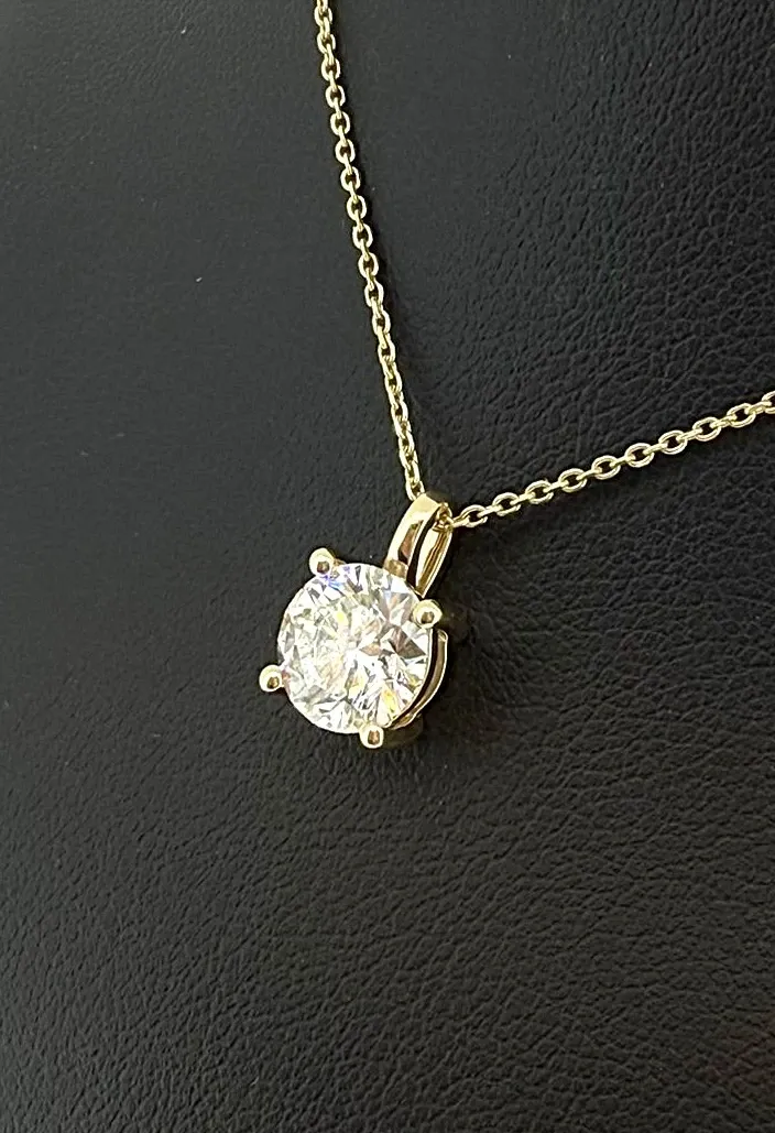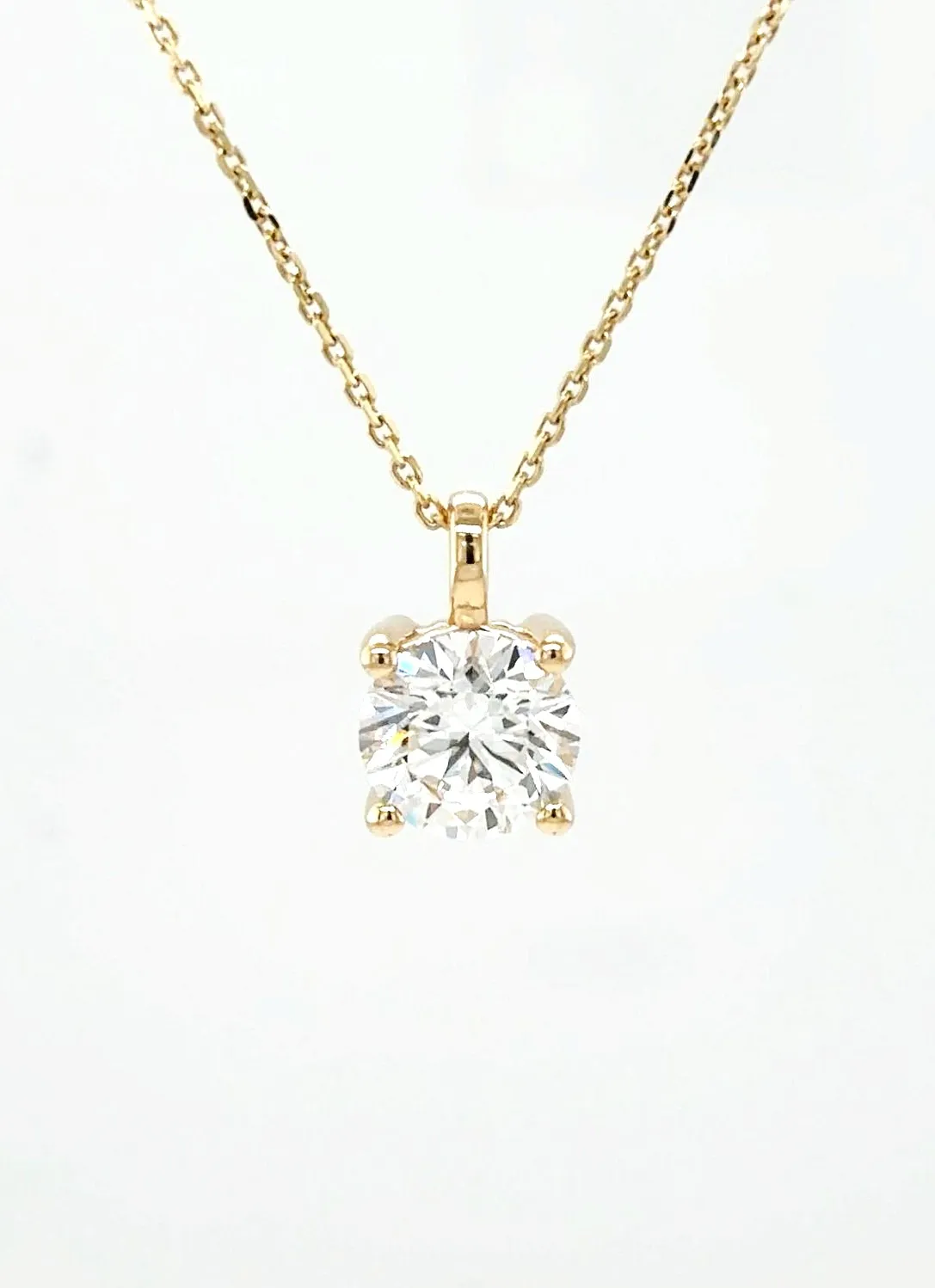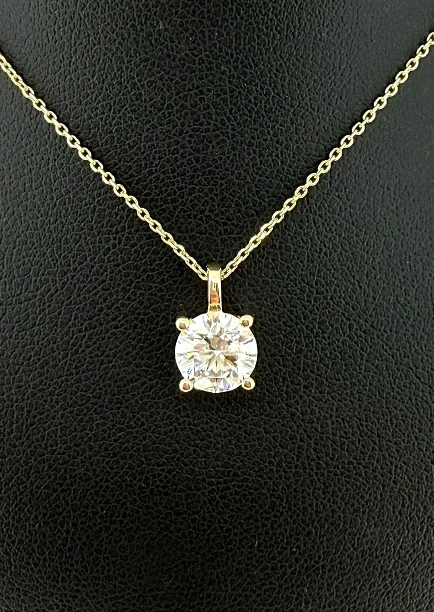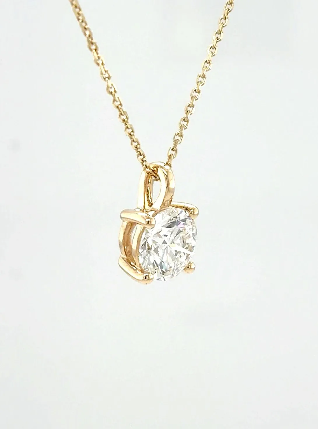 Radiate timeless elegance with this 1.50ct lab-grown diamond solitaire pendant, crafted in 9ct gold. Featuring a brilliant 1.50ct lab-grown diamond, ethically sourced for exceptional sparkle and clarity, this pendant is a sophisticated and conscious choice. The diamond is set in a classic four-claw 9ct gold setting, allowing maximum light to enhance its brilliance. Suspended on an adjustable 16/18-inch chain, the pendant sits perfectly at the neckline, making it ideal for both everyday wear and special occasions. A luxurious gift or a treasured addition to your own collection, this pendant combines refined style with ethical craftsmanship. Details: