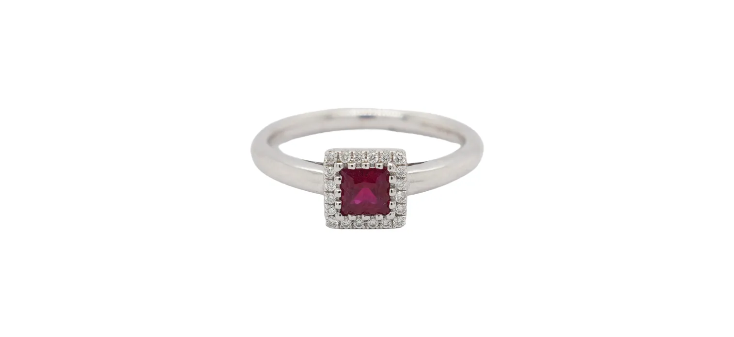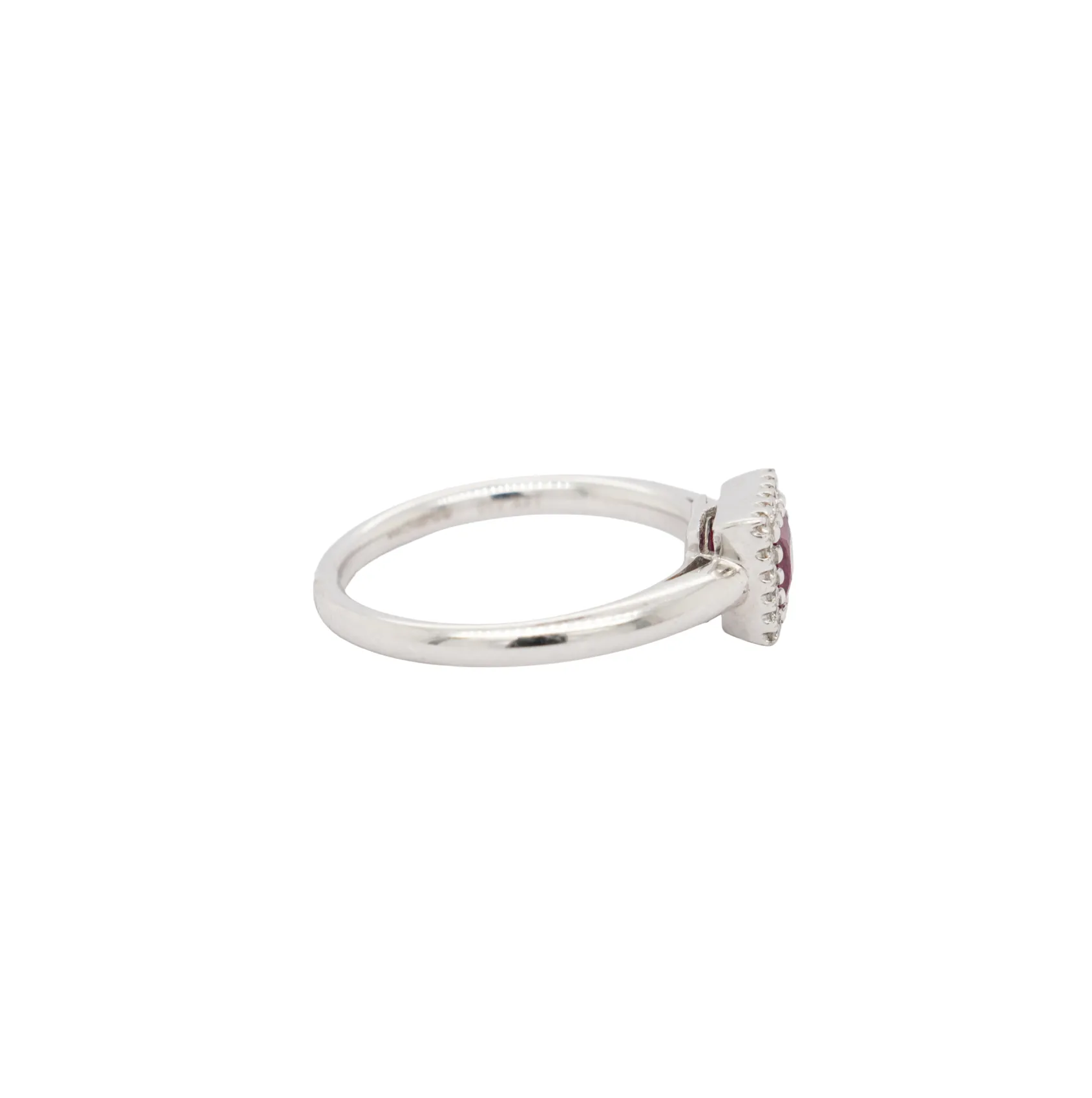 Exquisite and timeless, this halo solitaire ring is crafted in 18ct white gold and features a stunning ruby centre stone surrounded by a sparkling halo of diamonds. The halo design enhances the brilliance of the ruby, creating a luxurious and eye-catching effect. Weighing 4.0 grams, the ring combines elegance with comfort for everyday wear or special occasions. The polished white gold band beautifully complements the rich red of the ruby and the sparkle of the diamonds, making it an ideal engagement ring, anniversary gift, or statement piece. A sophisticated addition to any fine jewellery collection, this halo solitaire ring perfectly blends colour, brilliance, and classic style.