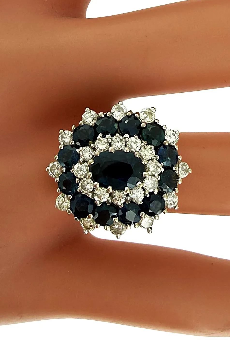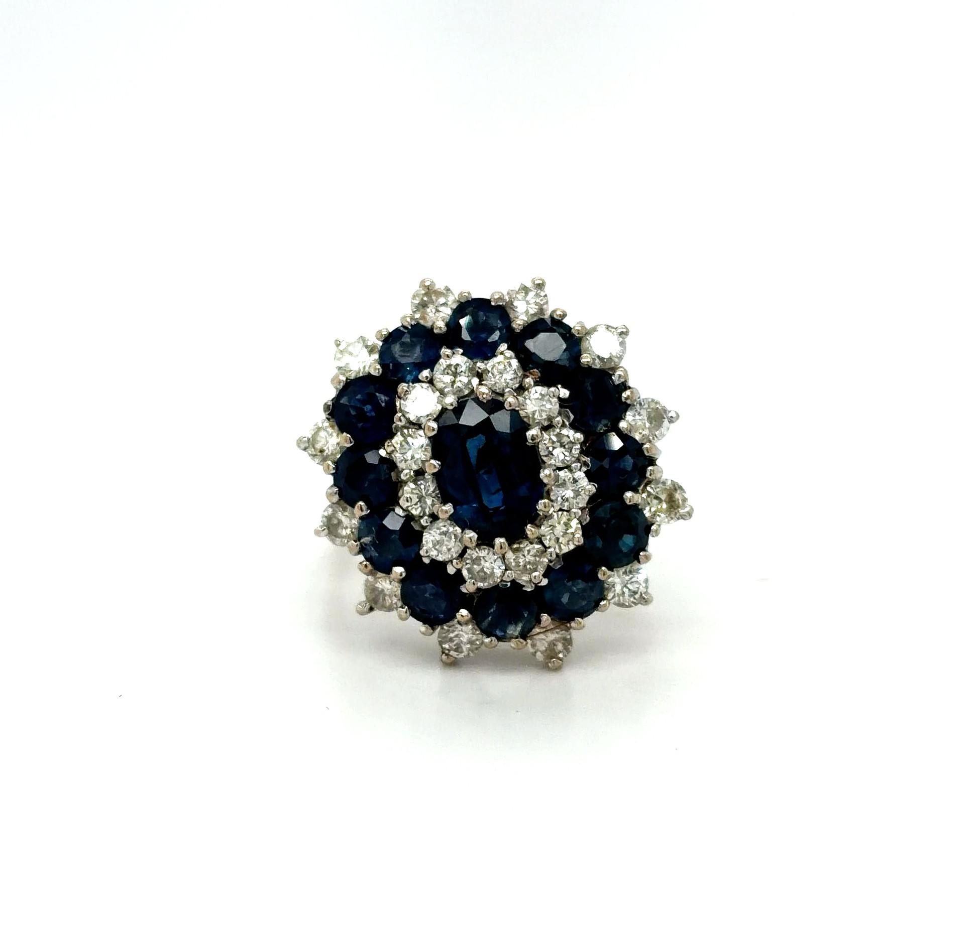 A bold and luxurious statement piece, this 18ct white gold cluster ring showcases a magnificent 3.00ct sapphire at its centre, surrounded by a dazzling 0.84ct diamond halo and cluster setting. The deep blue sapphire contrasts beautifully against the brilliance of the diamonds, creating exceptional sparkle and elegance. Crafted in premium 18ct white gold and weighing 7.0 grams, the ring offers a substantial and high-quality feel. The cluster design enhances the presence of the centre stone, making it ideal as a standout dress ring or a distinctive engagement piece. A timeless and sophisticated gemstone ring combining rich colour, radiant diamonds, and fine craftsmanship.