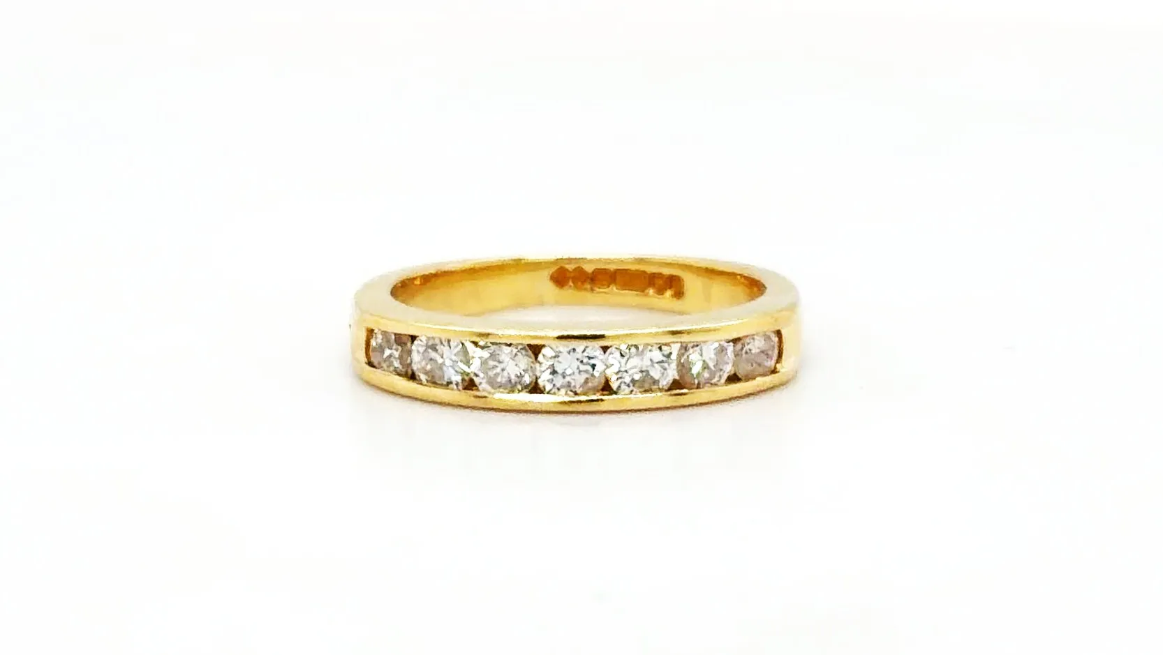 Timeless and elegant, this 0.47ct Diamond & 18ct Gold Eternity/Wedding Band is designed to celebrate love and commitment. Crafted from luxurious 18ct gold and weighing approximately 2.5 grams, this exquisite band features a continuous row of brilliant-cut diamonds totalling 0.47 carats, set to maximise sparkle and brilliance. The classic eternity design symbolises eternal love, making it a perfect choice as a wedding band, anniversary ring, or stacking ring. The polished 18ct gold band provides a warm, sophisticated backdrop to the diamonds, ensuring a refined and enduring piece that can be cherished for a lifetime. Its comfortable fit and timeless style make it suitable for everyday wear while maintaining its elegant appeal. Key Features: