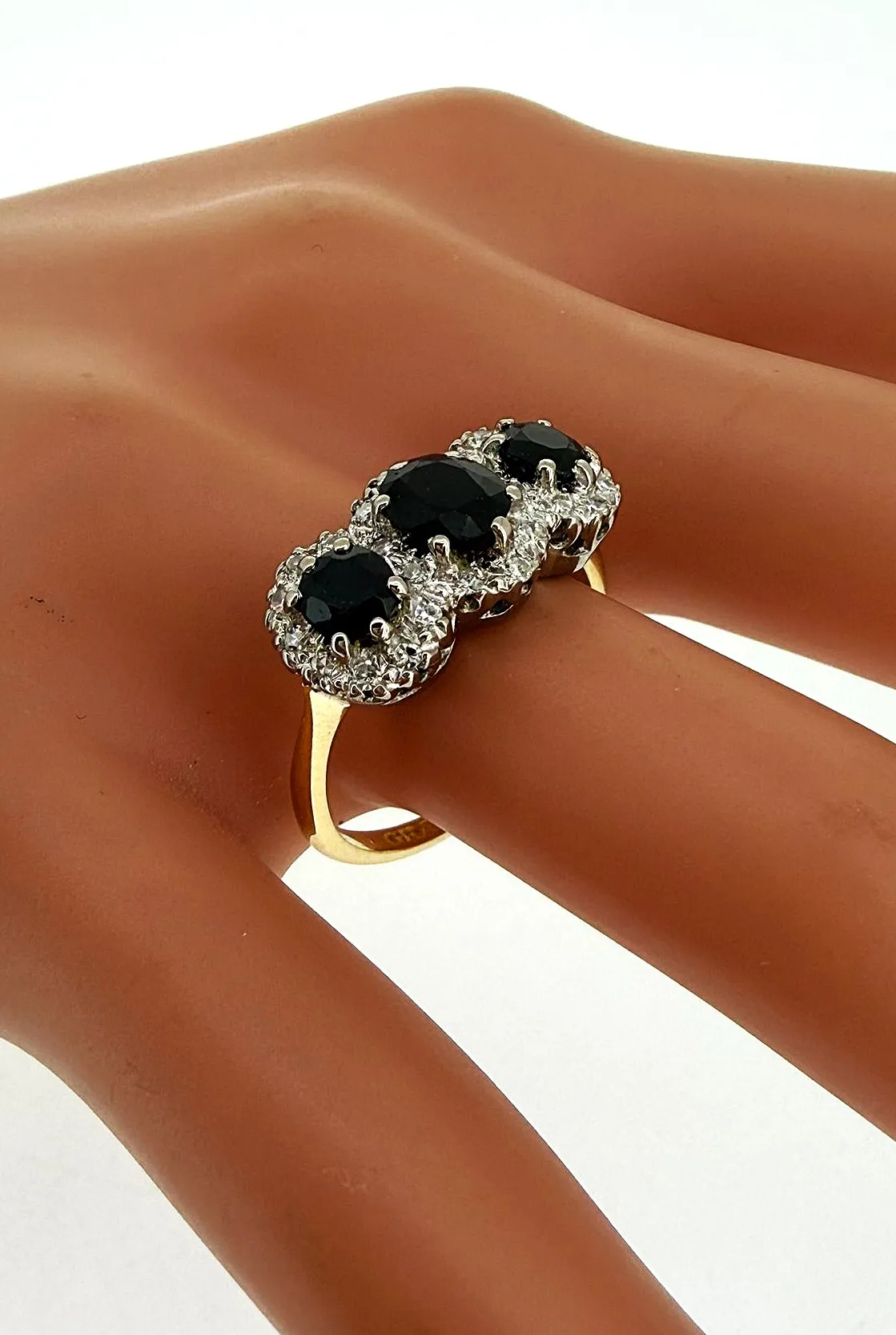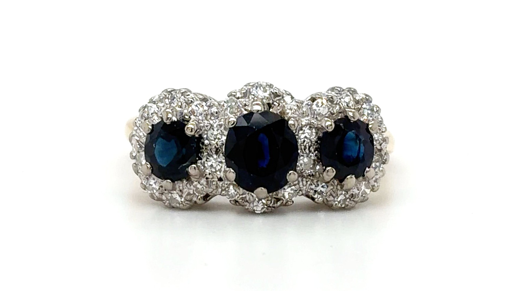 Striking and sophisticated, this 1.50ct Sapphire & 0.25ct Diamond Trilogy/Halo Ring is a timeless statement of elegance. Crafted in luxurious 18ct gold and weighing approximately 4.7 grams, this beautifully balanced design showcases a rich 1.50 carat sapphire at its centre. The deep blue hue of the sapphire is perfectly complemented by sparkling diamonds totalling 0.25 carats, arranged in a trilogy-inspired halo setting that enhances brilliance and presence. The combination of trilogy styling and halo detailing creates exceptional sparkle while symbolising past, present and future — making this ring a meaningful choice for anniversaries, engagements or special milestones. The polished 18ct gold band adds warmth and refinement, completing this classic yet eye-catching design. Key Features: