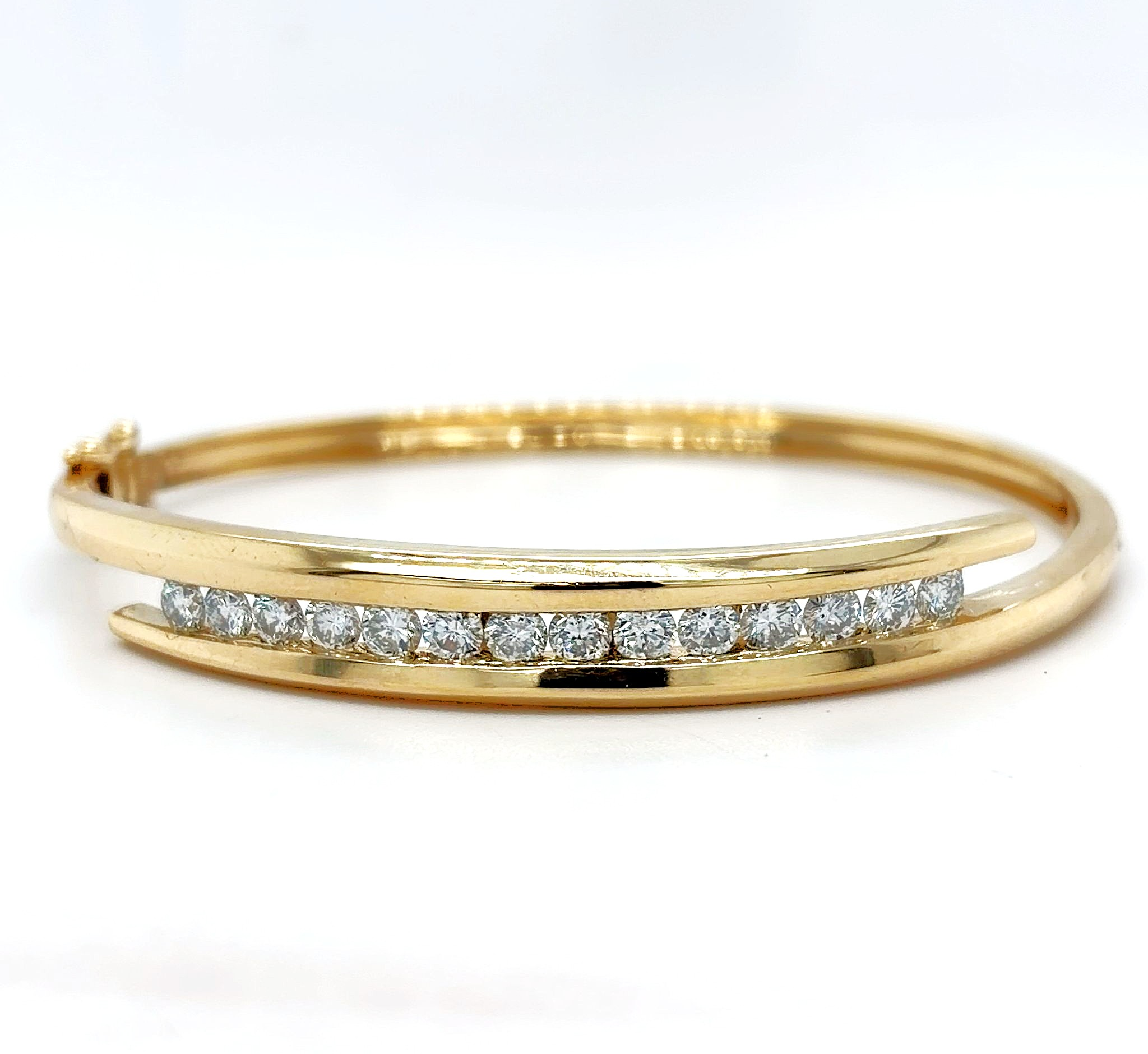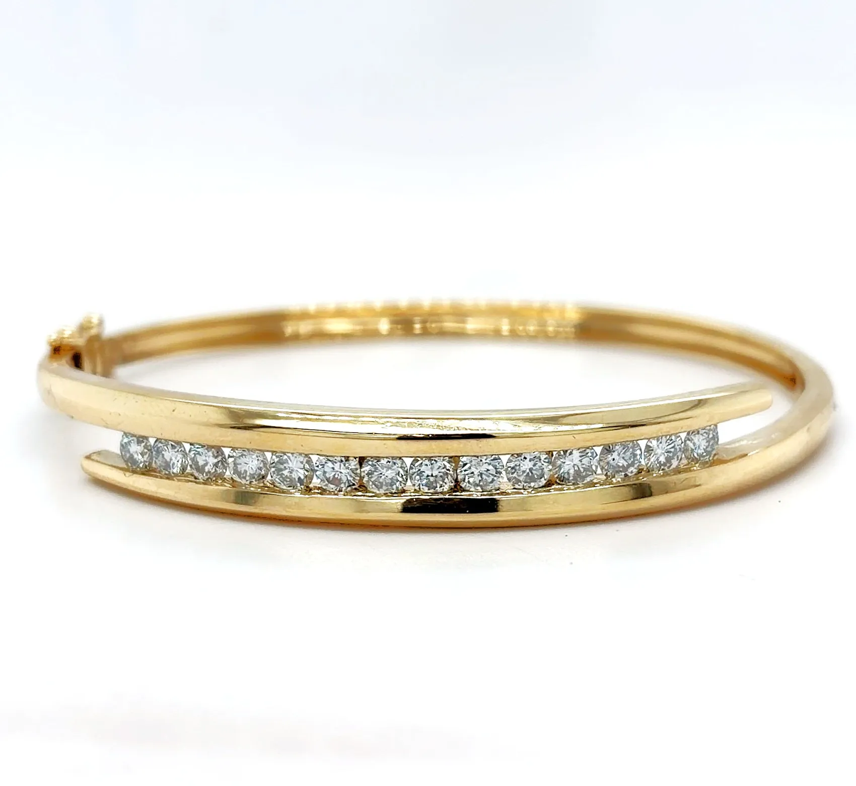 Elegant and contemporary, this stunning diamond cross-over bangle is crafted in 14ct gold and set with a total of 1.99 carats of sparkling diamonds. The flowing cross-over design creates a graceful, intertwined effect, symbolising unity and timeless style. Measuring 7.5 inches and weighing 17.4 grams, this bangle offers a substantial yet comfortable fit. The polished gold finish enhances the brilliance of the diamonds, making it perfect for formal occasions, evening wear, or as a luxurious statement piece. A sophisticated blend of modern design and classic elegance, this diamond cross-over bangle is a refined addition to any fine jewellery collection.