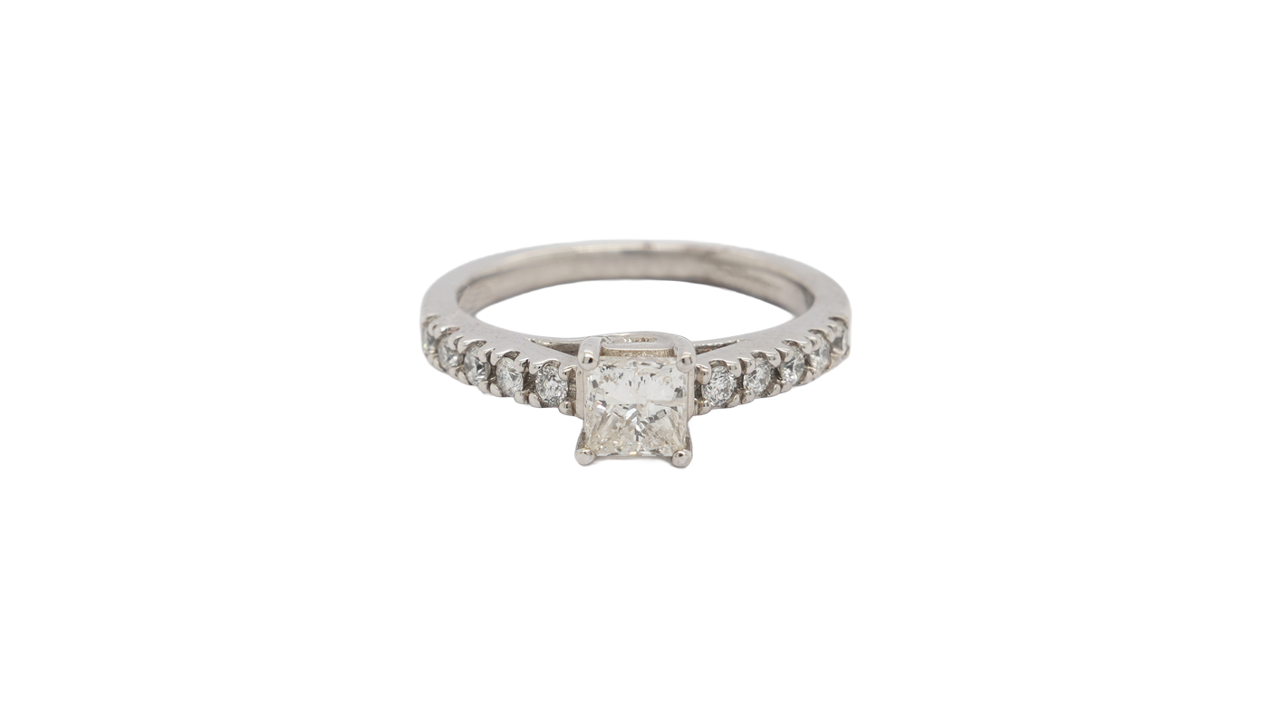 This exquisite ring features a 1 carat princess cut diamond as its centrepiece, elegantly framed by diamond-accented shoulders for added brilliance and sparkle. The modern solitaire design is enhanced with a contemporary flair, making it a striking statement of luxury and sophistication. Crafted from 14ct white gold, the band provides a sleek, luminous backdrop that complements the diamonds beautifully. With a total weight of 3.9 grams, this ring balances durability with refined elegance, making it ideal for engagements, anniversaries, or special occasions. A perfect choice for those seeking a classic yet stylish diamond ring, combining timeless beauty with modern design. Key Features: