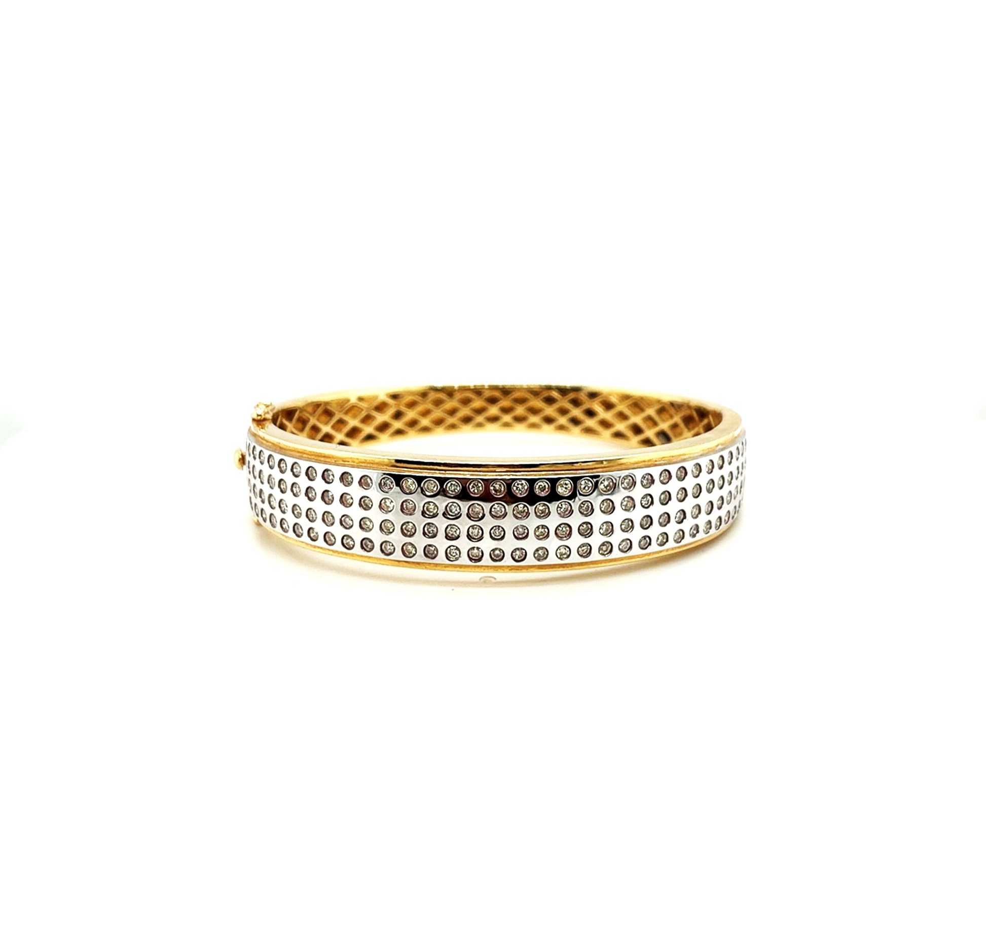 Make a statement of elegance and luxury with this stunning 18ct gold bangle, adorned with a total of 2.04ct of brilliant-cut diamonds. The generous 13.3mm width ensures a bold yet refined look, while the meticulous diamond setting adds exceptional sparkle and sophistication. Crafted in 18ct yellow gold and weighing 42.7g, this bangle combines durability with comfort, making it a perfect piece for special occasions or as a luxurious addition to your fine jewellery collection. Its classic design ensures it will remain a timeless favourite for years to come. Details: