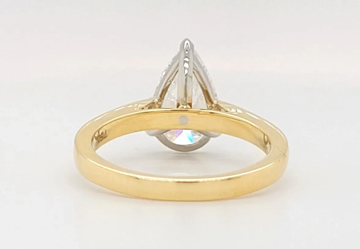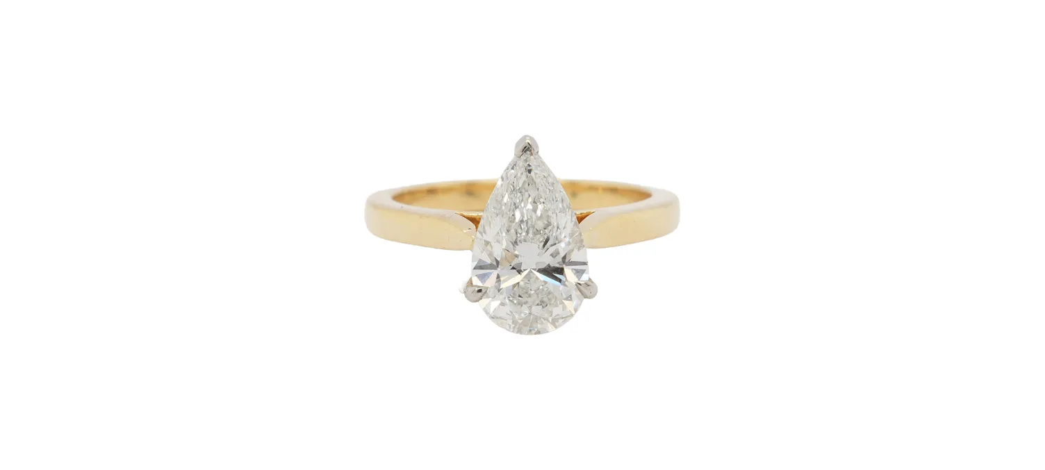 2.16ct Lab Grown Diamond & 18ct Gold Pear Cut Solitaire Ring – 4.8g, Size M Exuding elegance and unique charm, this exquisite solitaire ring features a striking 2.16ct lab-grown pear cut diamond set in a classic 18ct gold band weighing 4.8 grams. The pear shape beautifully elongates the finger, combining the brilliance of a round cut with the sophistication of a marquise. Crafted with precision and an ethical mindset, this ring is a stunning choice for engagements or a refined addition to any fine jewellery collection. Available in Size M, it balances timeless style with modern sustainability. Celebrate your special moments with a piece that shines with conscious luxury and flawless craftsmanship.