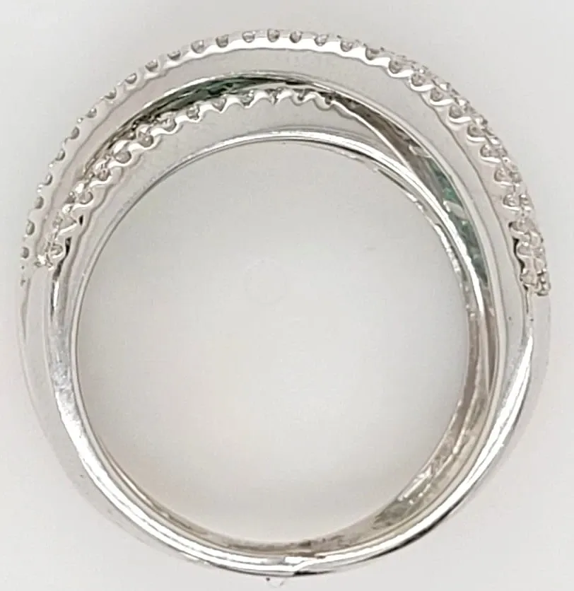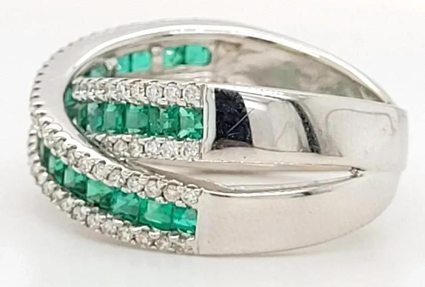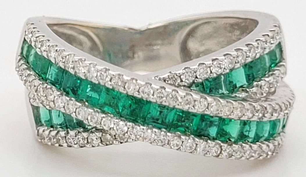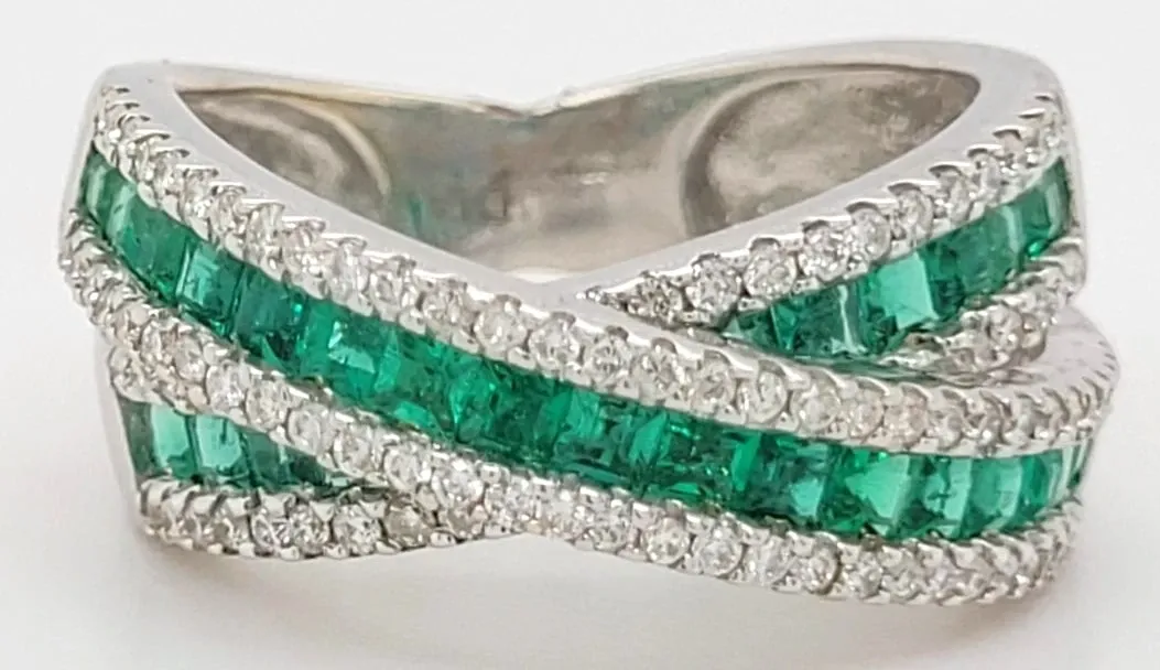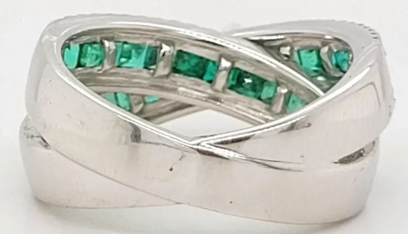 2.39ct Emerald & Diamond Cross Over Ring – 18ct White Gold, Size N (8.1g) Make a striking statement with this exquisite 2.39ct emerald and diamond cross over ring, beautifully crafted in 18ct white gold. Featuring a vibrant, rich emerald at its centre, this design is enhanced by sparkling diamonds that gracefully cross over the band, creating a dynamic and elegant look. Weighing 8.1 grams and sized at N, this ring combines classic luxury with contemporary style. The emerald’s deep green hue contrasts brilliantly with the dazzling diamonds and sleek white gold setting, making it a perfect choice for special occasions or a sophisticated everyday accessory.