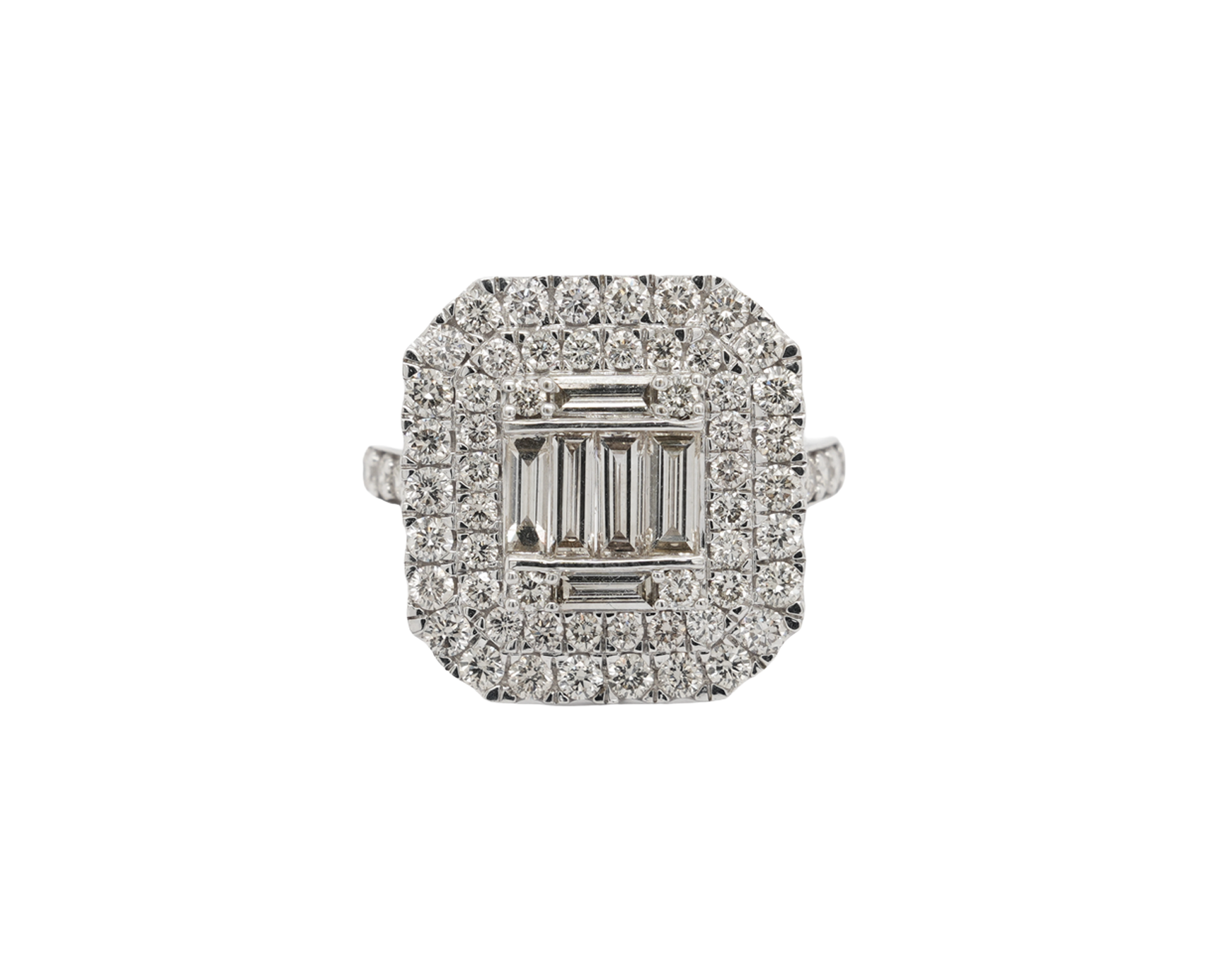 2.55ct Diamond & 9ct White Gold Halo Cluster Dress Ring – 6.1g Turn heads with this stunning halo cluster dress ring, expertly crafted in 9ct white gold. The centrepiece features an impressive 2.55 carats of dazzling diamonds, arranged in a timeless cluster design that exudes elegance and sophistication. Weighing 6.1 grams, this ring offers a luxurious feel while remaining comfortable for extended wear. Perfect for special occasions or adding a touch of glamour to everyday outfits.