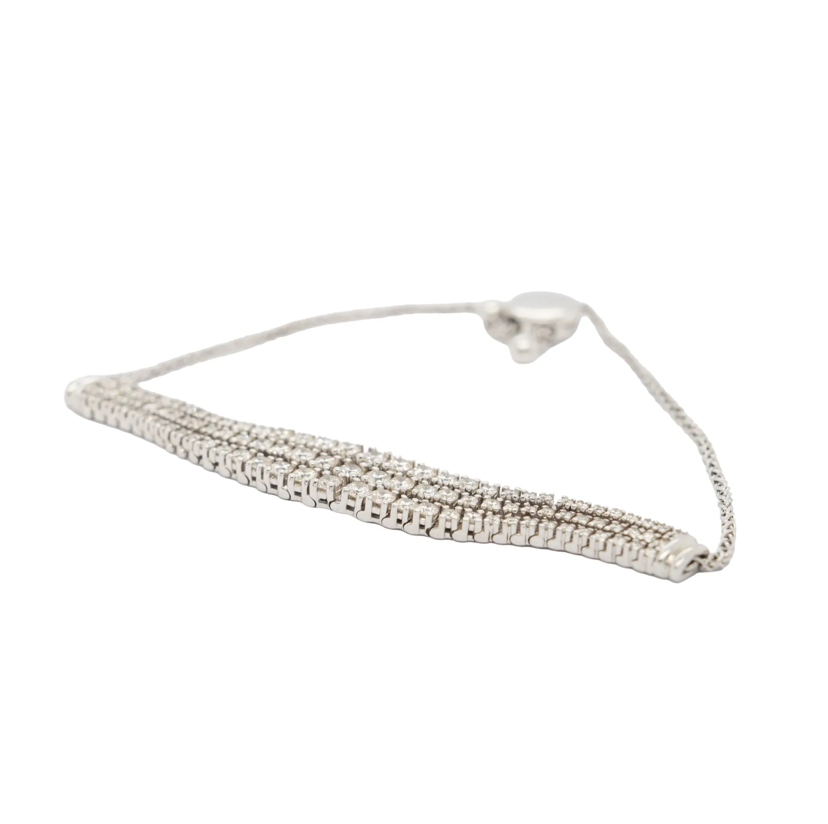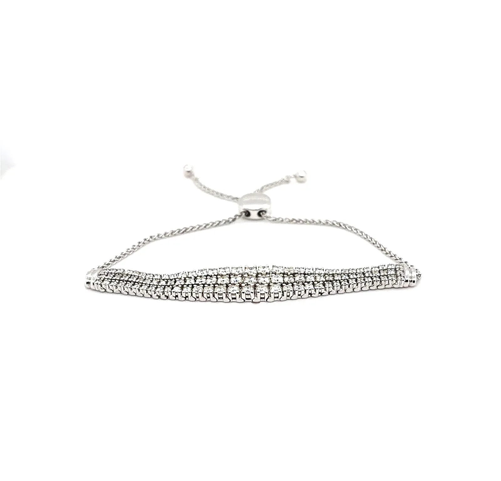 Elevate your jewellery collection with this exquisite triple row tennis bracelet, expertly crafted in luminous 10ct white gold. Showcasing a total of 3.00 carats of sparkling diamonds, each stone is carefully set to maximise brilliance and create a seamless flow of light across the wrist. The elegant triple row design offers a bold yet refined look, perfect for both special occasions and everyday luxury. Finished with an adjustable clasp, the bracelet ensures a secure and comfortable fit while maintaining its sophisticated silhouette. With a substantial weight of 14.9 grams, this bracelet reflects exceptional craftsmanship and enduring quality. A timeless statement piece that embodies classic glamour with a contemporary edge. Features: