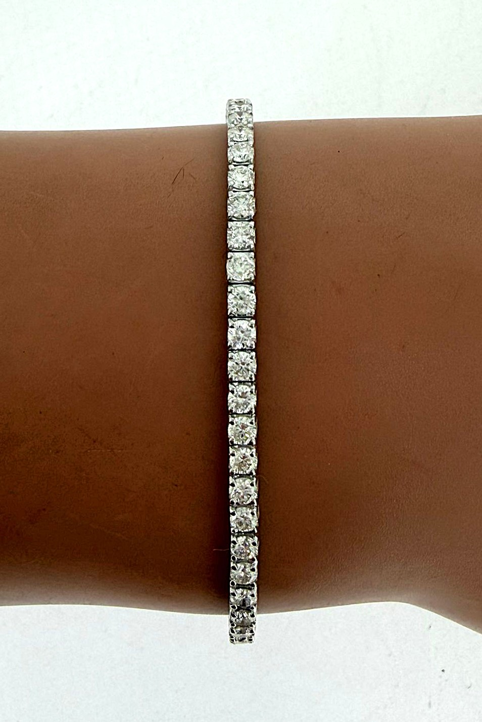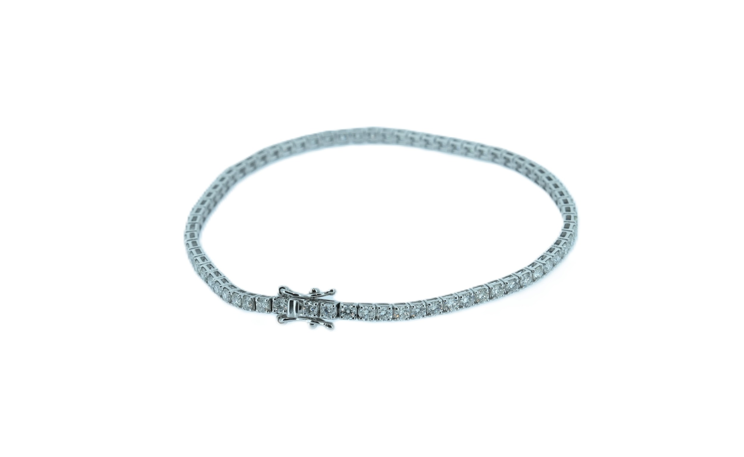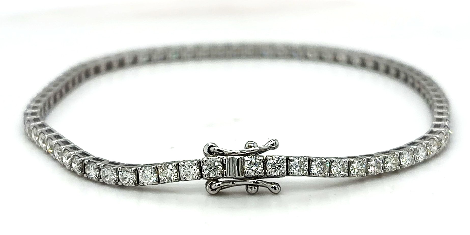 Elegant and timeless, this beautiful diamond tennis bracelet is crafted in 18ct white gold and set with a total of 3.11 carats of sparkling diamonds. Designed in the classic tennis style, the diamonds are precisely aligned to create a seamless row of brilliance around the wrist. Measuring 7.5 inches in length and weighing 6.9 grams, this bracelet offers a refined and comfortable fit while maintaining a luxurious presence. The polished white gold setting enhances the diamonds’ fire and clarity, making it perfect for formal occasions, anniversaries, or everyday elegance. A sophisticated addition to any fine jewellery collection, this 3.11ct diamond tennis bracelet embodies classic style and enduring luxury.