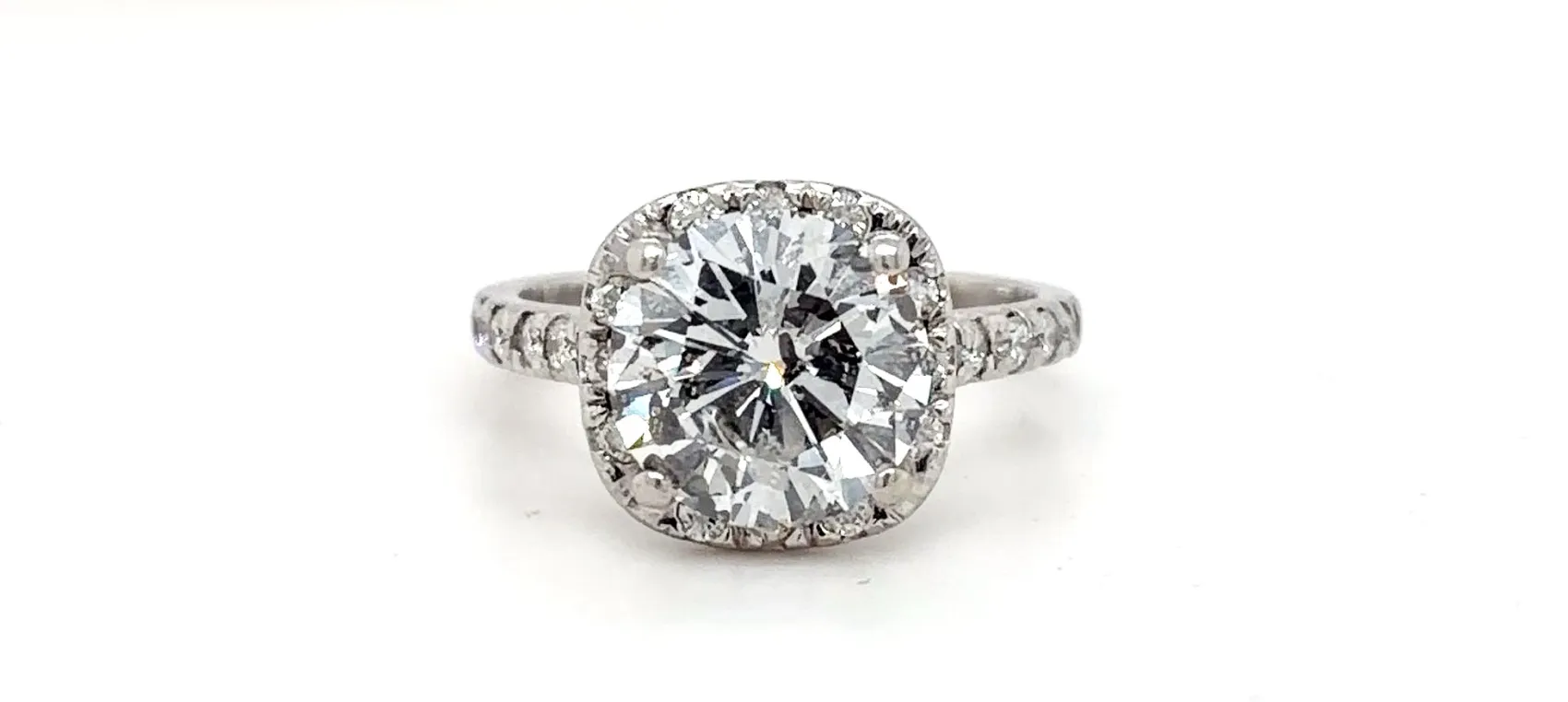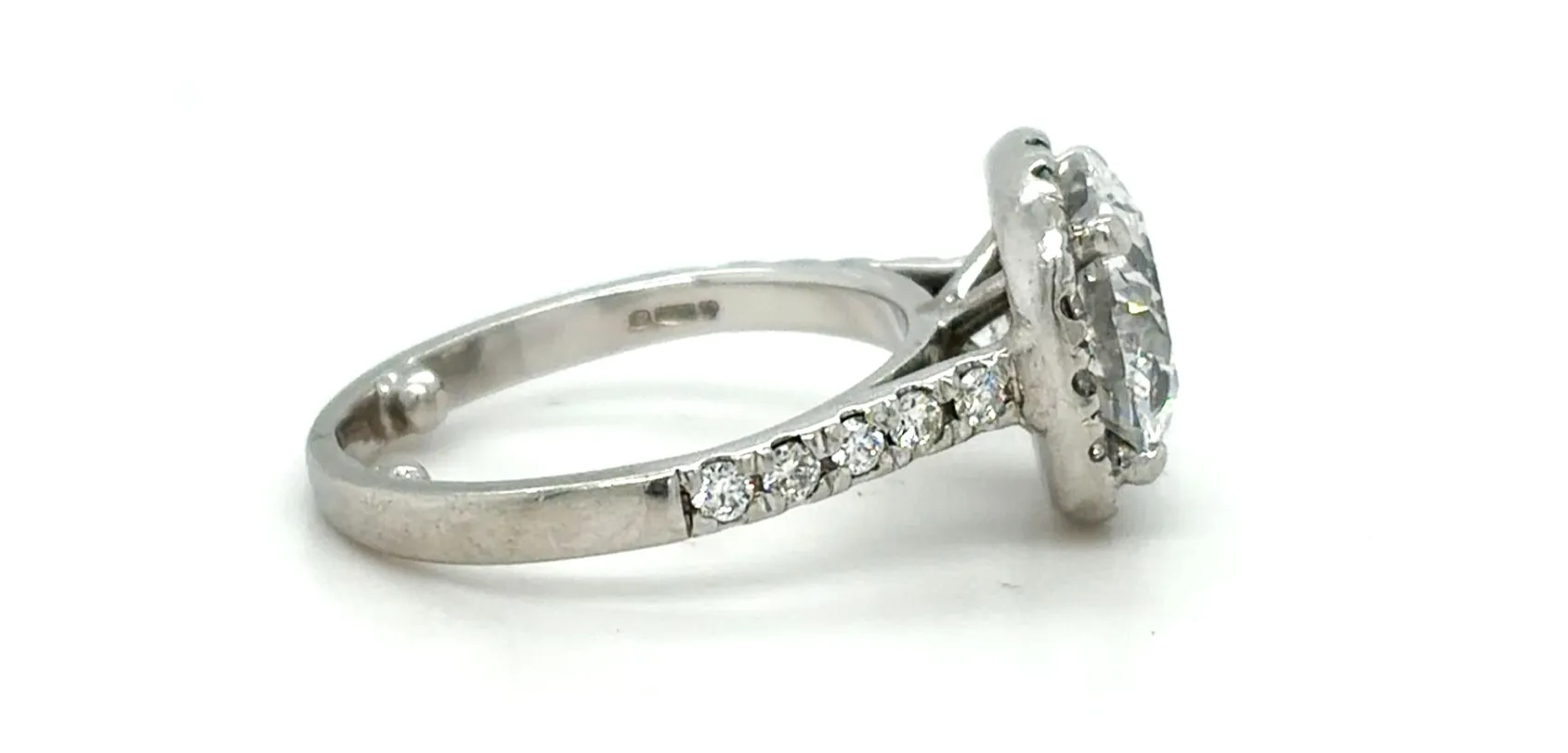 A show-stopping statement of luxury, this 3.41-carat diamond is magnificently showcased in a platinum halo solitaire setting, designed to maximise brilliance and sparkle. The halo design enhances the central diamond’s size and fire, while the sleek platinum band provides enduring elegance and strength. With a total weight of 6.2 grams, this ring balances substantial presence with comfortable wear. Perfect for a spectacular engagement ring or a milestone jewellery gift, this piece embodies timeless sophistication and unparalleled craftsmanship. Details: