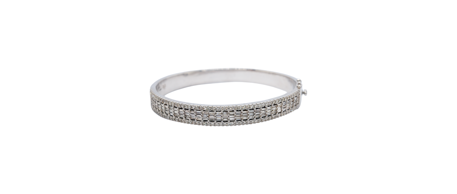Exude luxury and elegance with this striking diamond bangle, expertly crafted from 9ct white gold and set with a total of 4.35 carats of diamonds. The sleek and sophisticated design ensures that each diamond catches the light beautifully, offering remarkable sparkle and brilliance. With an approximate weight of 30.9 grams and a 7.5-inch circumference, this bangle combines a substantial, luxurious feel with comfortable wearability. Perfect as a wedding gift, anniversary present, or statement piece, it exemplifies timeless style and exceptional craftsmanship. Key Features: