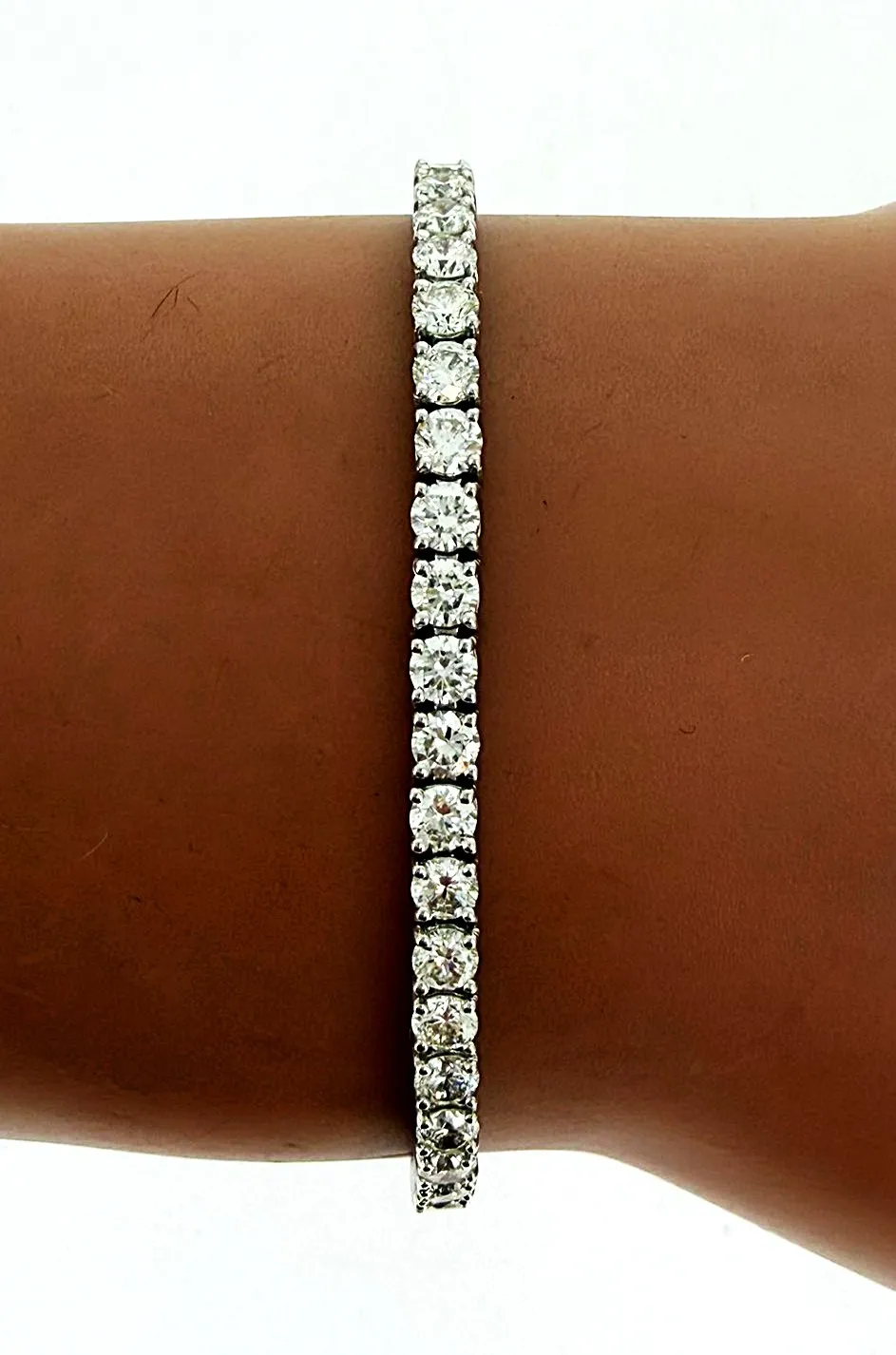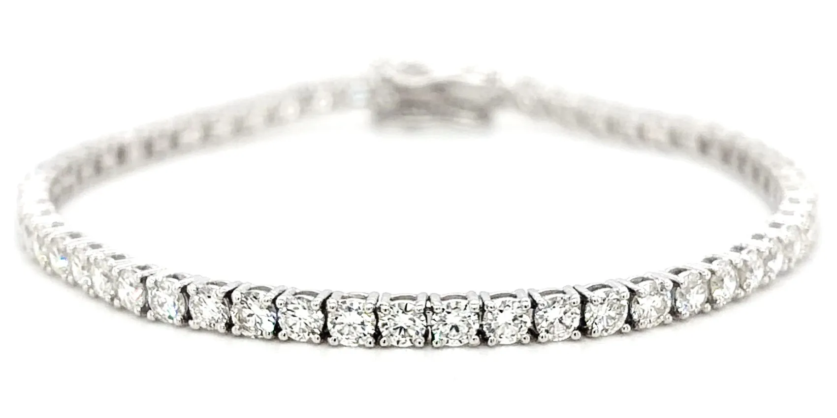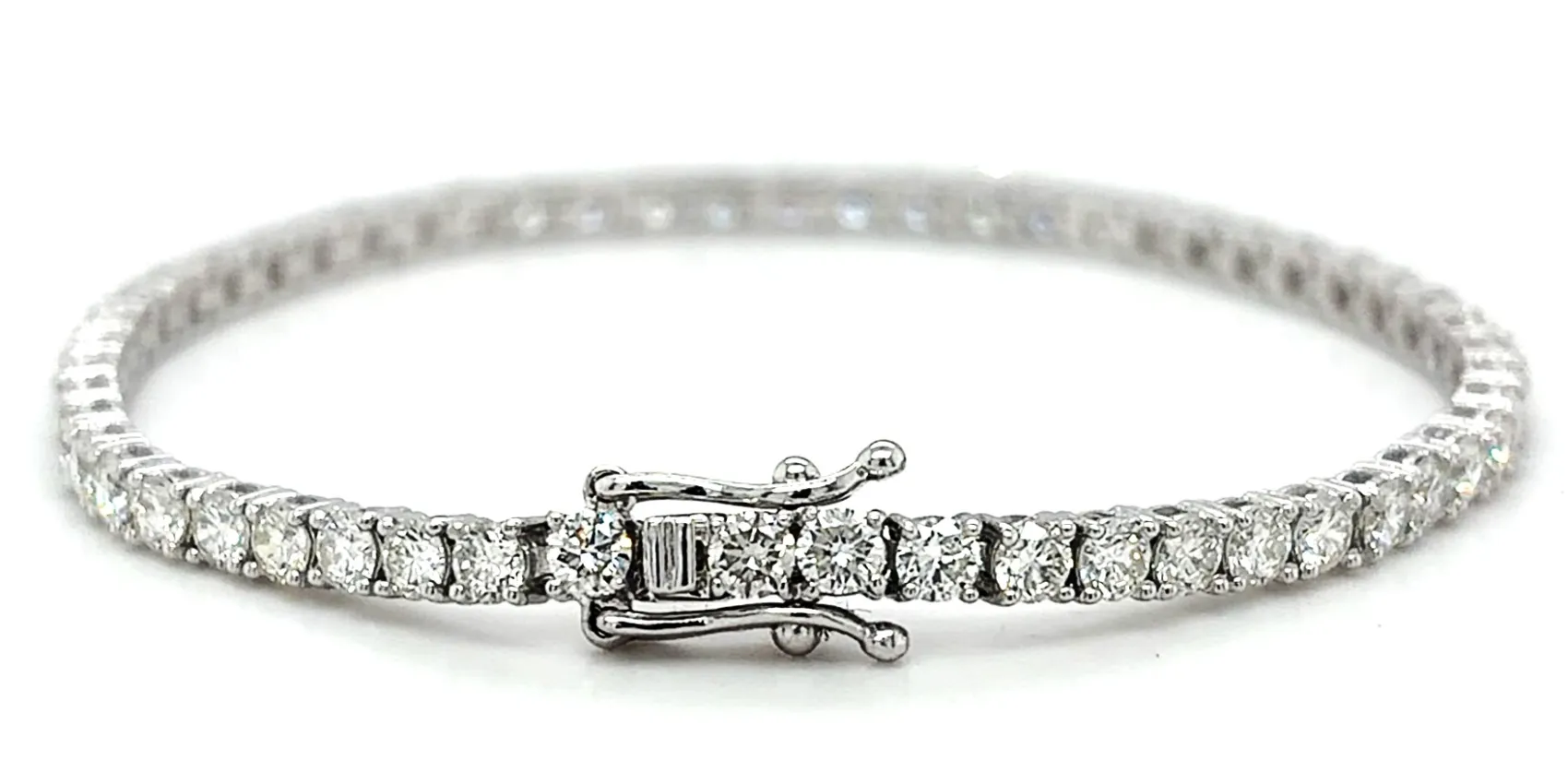 Timeless and elegant, this diamond tennis bracelet is crafted in 18ct white gold and set with a total of 4.57 carats of brilliant-cut diamonds. Its classic design features a continuous line of diamonds, creating uninterrupted sparkle from every angle. Weighing 8.0 grams and measuring 7.5 inches, the bracelet offers a comfortable and secure fit. The polished white gold setting enhances the diamonds’ brilliance, making this piece perfect as a gift for special occasions, anniversaries, or a luxury addition to any fine jewellery collection. A sophisticated combination of elegance, luxury, and timeless style, this tennis bracelet is designed to shine on every occasion.