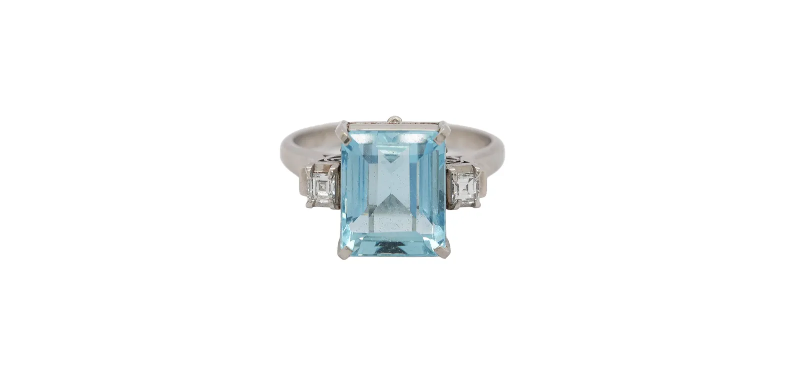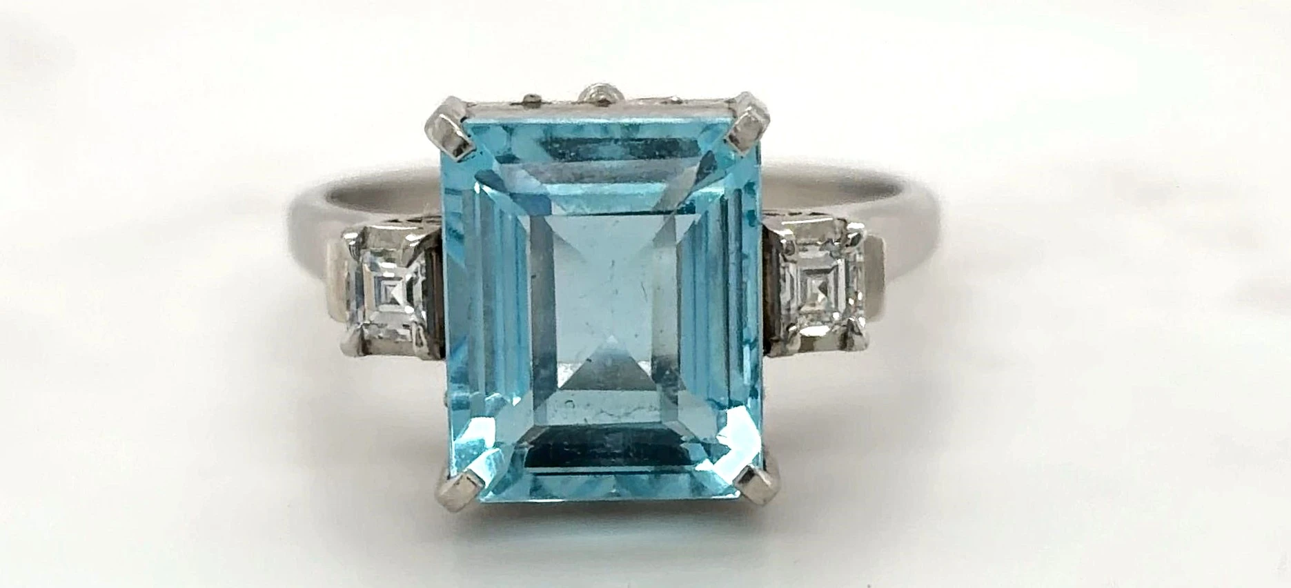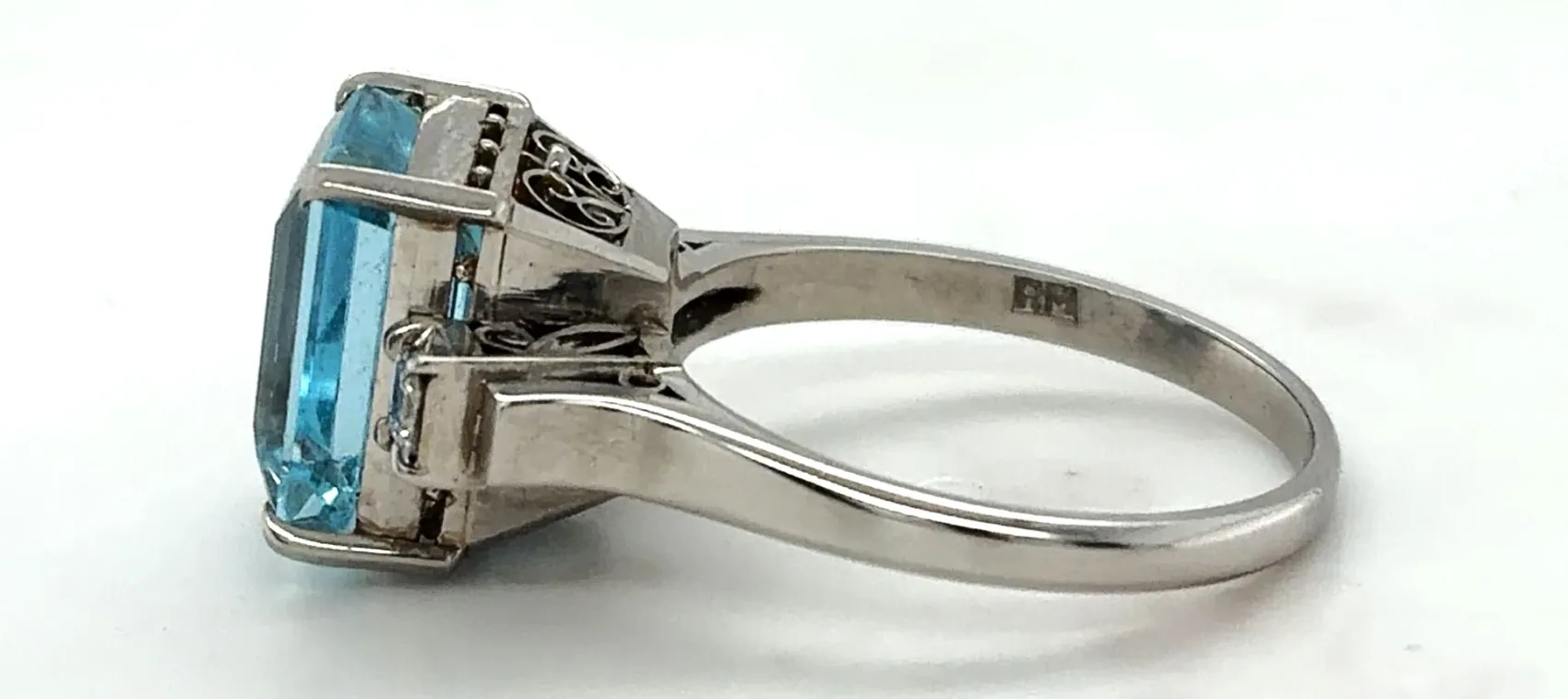 A refined statement piece, this dress ring features a 4.61ct aquamarine centre stone, complemented by 0.16ct of natural diamonds, all set in luxurious platinum. Weighing 6.5g, this ring combines subtle sophistication with a touch of sparkle, perfect for special occasions or elevating any fine jewellery collection. The oval-cut aquamarine showcases a serene blue hue, while the accent diamonds enhance its brilliance and elegance. Crafted in platinum, the ring offers enduring quality and timeless style. Details: