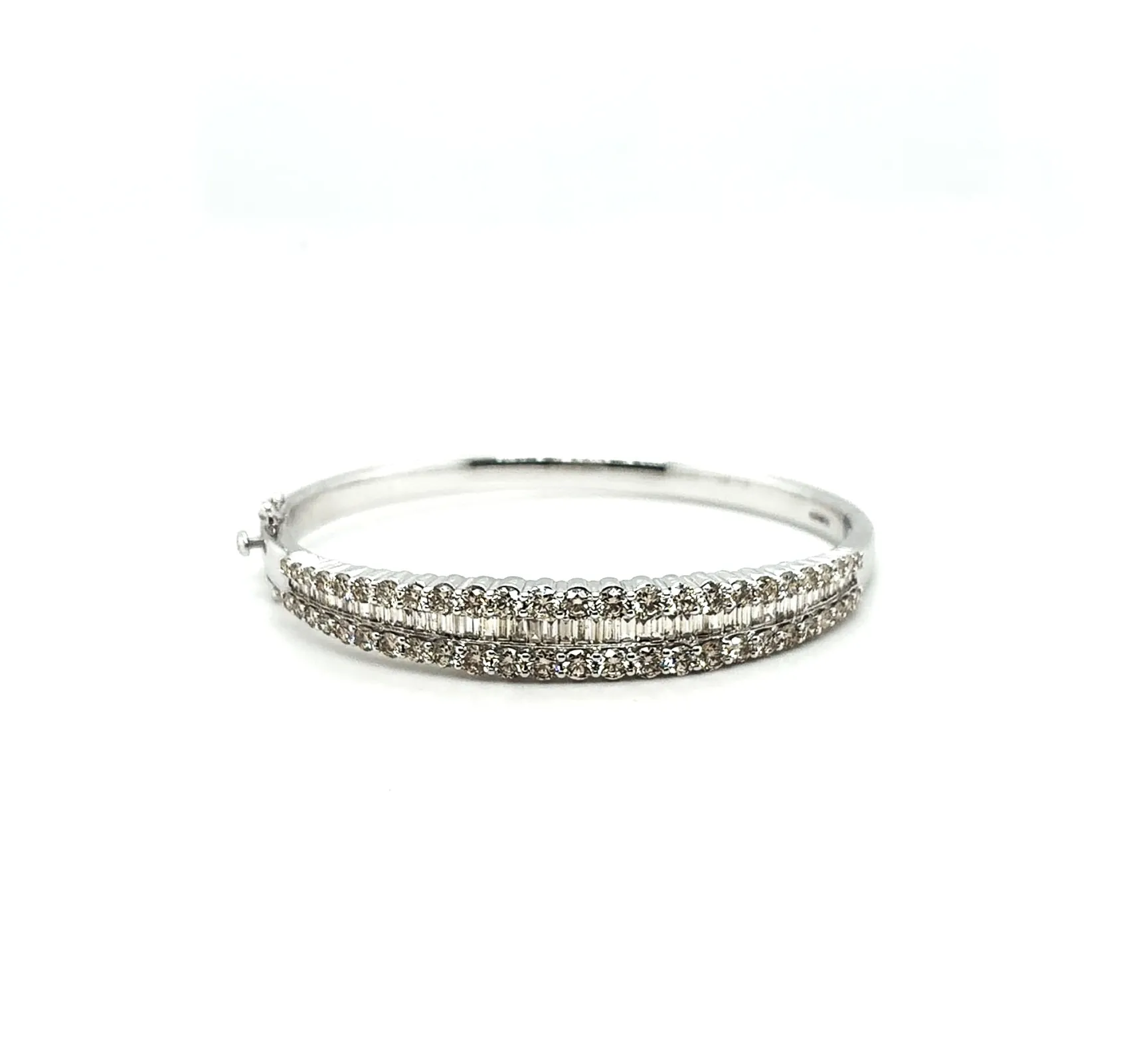 Make a bold statement of luxury with this stunning diamond bangle, crafted from 9ct white gold and featuring a total of 5.22 carats of diamonds. Each diamond is expertly set to maximise brilliance, ensuring a dazzling display from every angle. Weighing approximately 19.8 grams and measuring 7.5 inches, this bangle combines a substantial, high-quality feel with comfortable wear. Ideal for weddings, anniversaries, or as a statement piece, it embodies timeless elegance and sophisticated craftsmanship. Key Features: