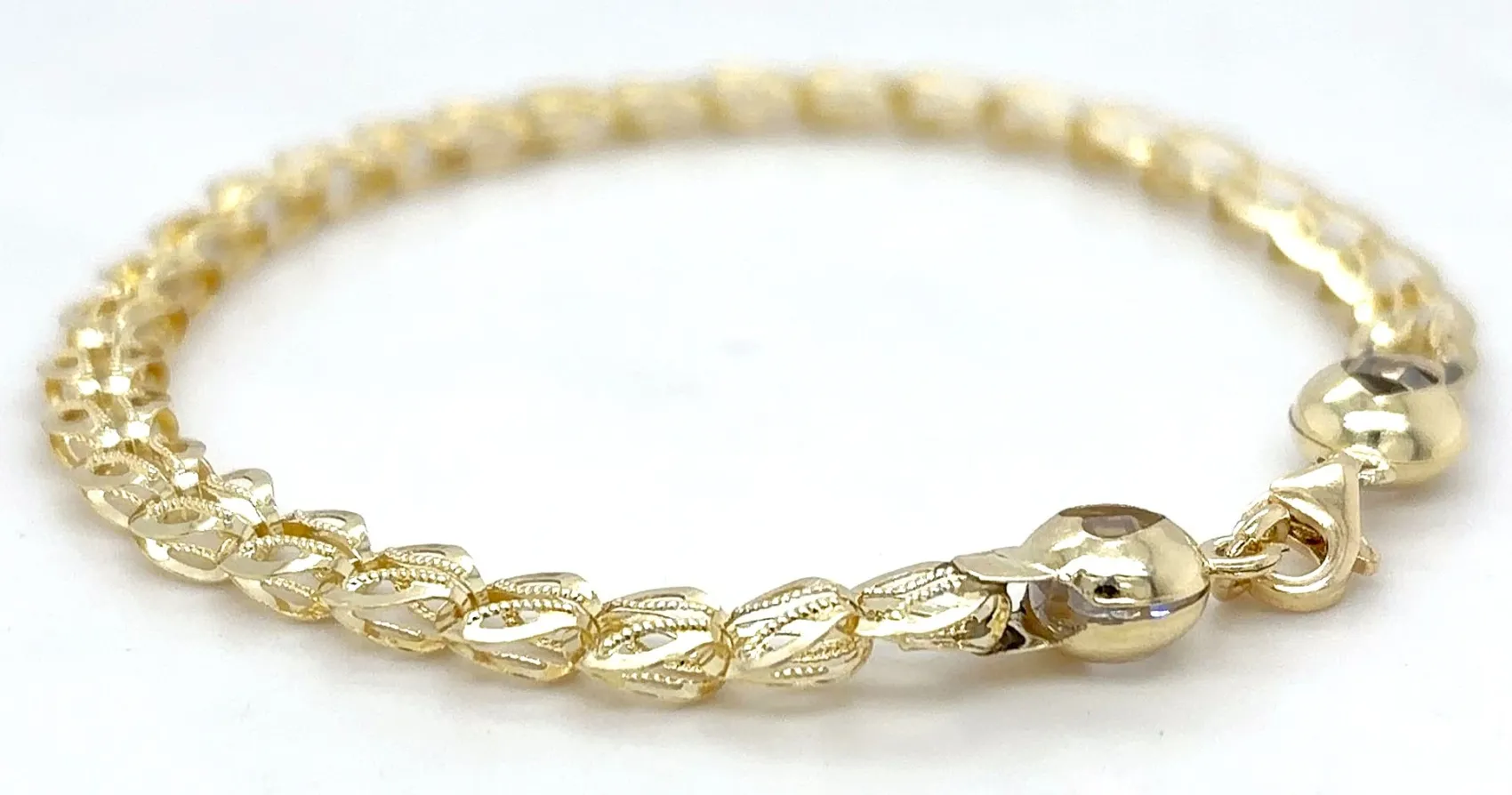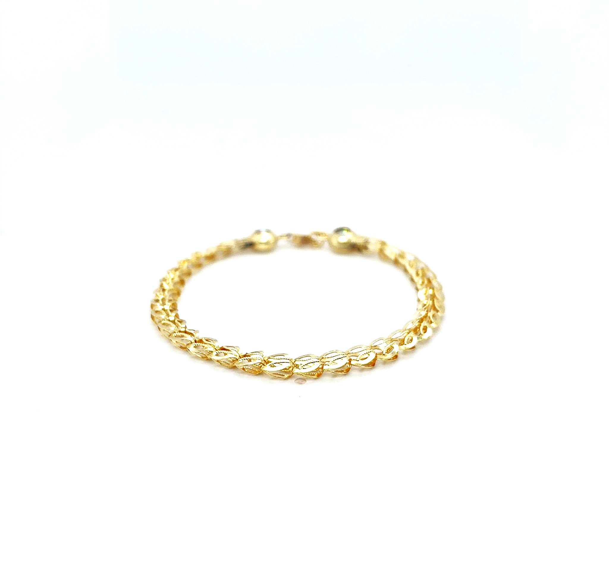 Add a touch of timeless elegance to your collection with this exquisite 9ct Gold Fancy Bracelet. Expertly crafted from solid 9 carat yellow gold, this piece showcases a 5.5mm wide intricate design that beautifully catches the light from every angle. Measuring 7.5 inches in length, it offers a comfortable and secure fit, making it perfect for everyday wear or special occasions. The bracelet fastens with a durable lobster clasp, ensuring both style and security. Whether worn alone for understated sophistication or layered with other gold pieces for a modern look, this bracelet is a versatile and luxurious addition to any jewellery box. Features: