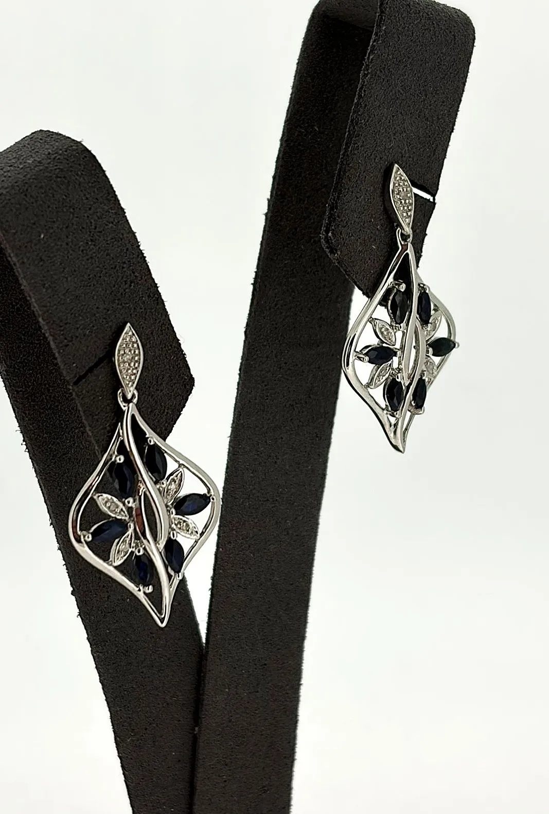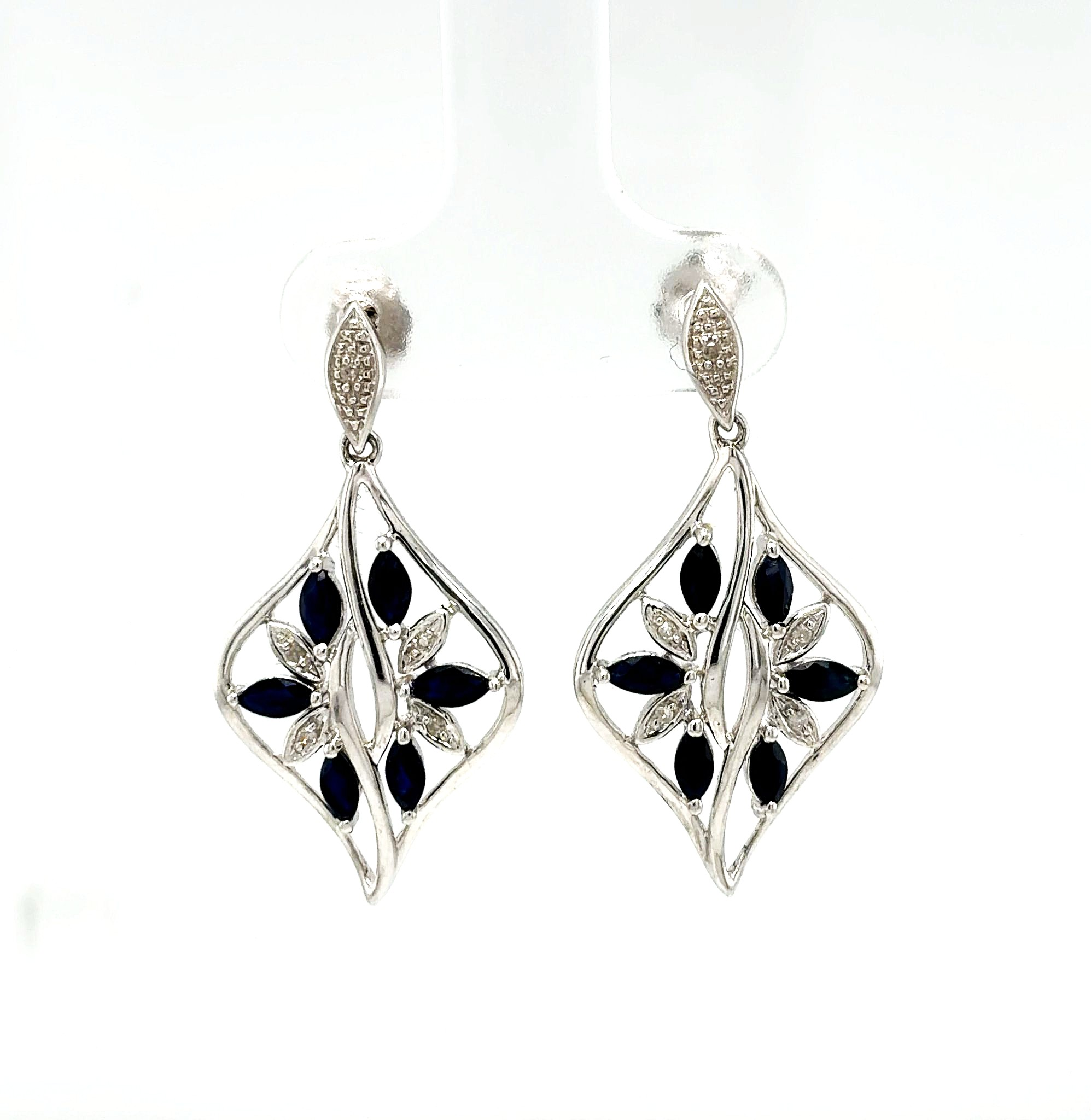 Elegant and refined, these 9ct white gold drop earrings feature a total of 0.72ct sapphires beautifully complemented by 0.10ct diamonds. The combination of deep blue sapphires and sparkling diamonds creates a sophisticated and eye-catching design, perfect for both day and evening wear. Crafted in 9ct white gold and weighing 3.37 grams, the earrings offer a delicate yet luxurious feel. Their classic drop style adds graceful movement and enhances the brilliance of the gemstones. Ideal as a gift, special occasion jewellery, or a timeless addition to any collection. A perfect combination of colour, sparkle, and elegance in a wearable, stylish design.