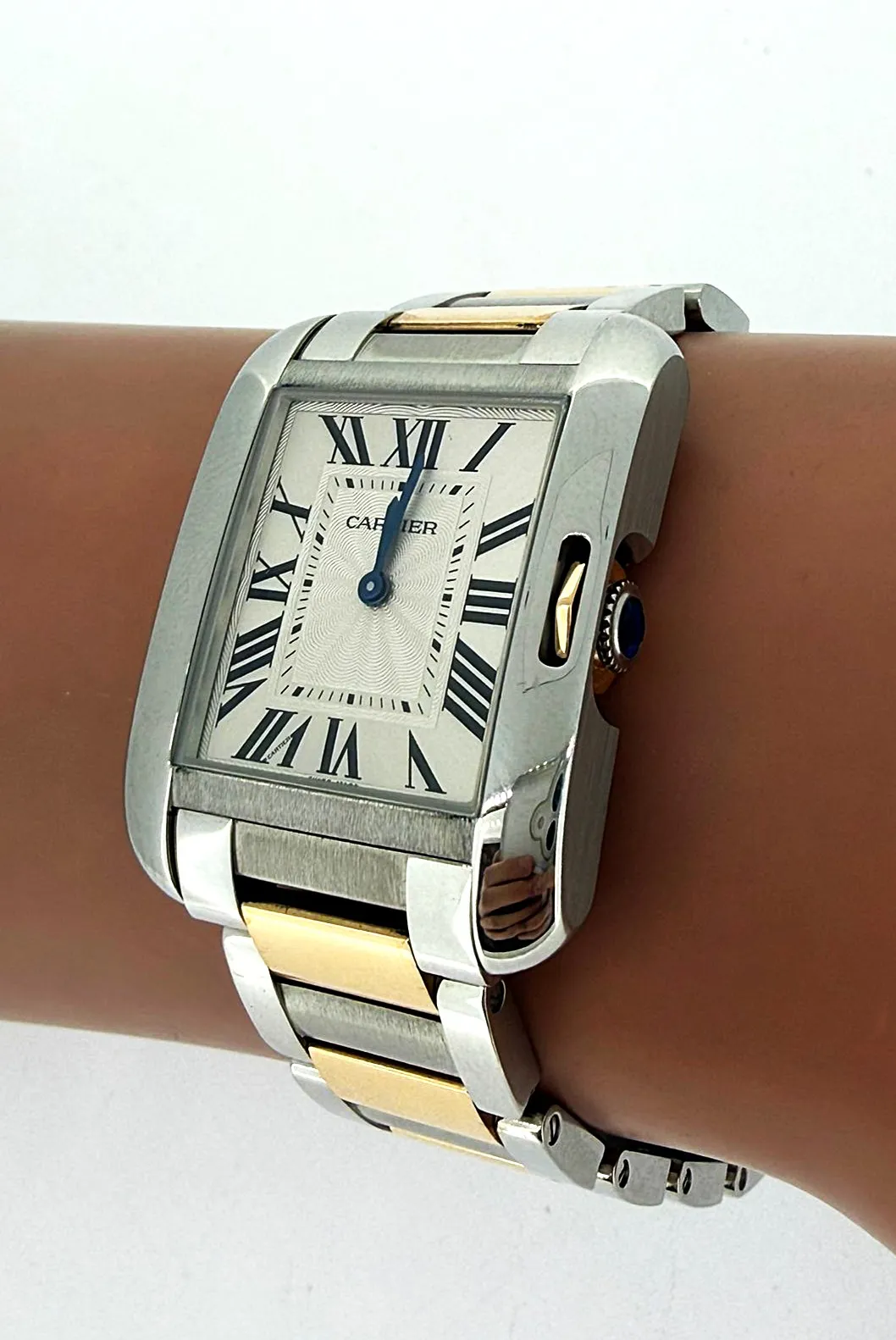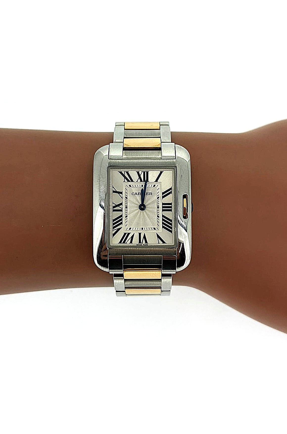 A luxurious and timeless piece from Cartier Tank Anglaise, this 27mm watch (Ref. 3704) combines the elegance of 18ct gold with the durability of stainless steel for a sophisticated bi-metallic look. The Anglaise’s signature integrated crown design is seamlessly set into the case, giving the watch its iconic architectural style. Featuring a silvered dial with Roman numerals, blued steel hands, and sapphire cabochon crown, this 2016 model exudes Cartier’s signature refinement. Supplied complete with original box and papers, it offers both authenticity and collectability for discerning buyers. Ideal for formal occasions or daily wear, the Cartier Tank Anglaise 27mm in gold and steel is a statement of luxury, heritage, and enduring style