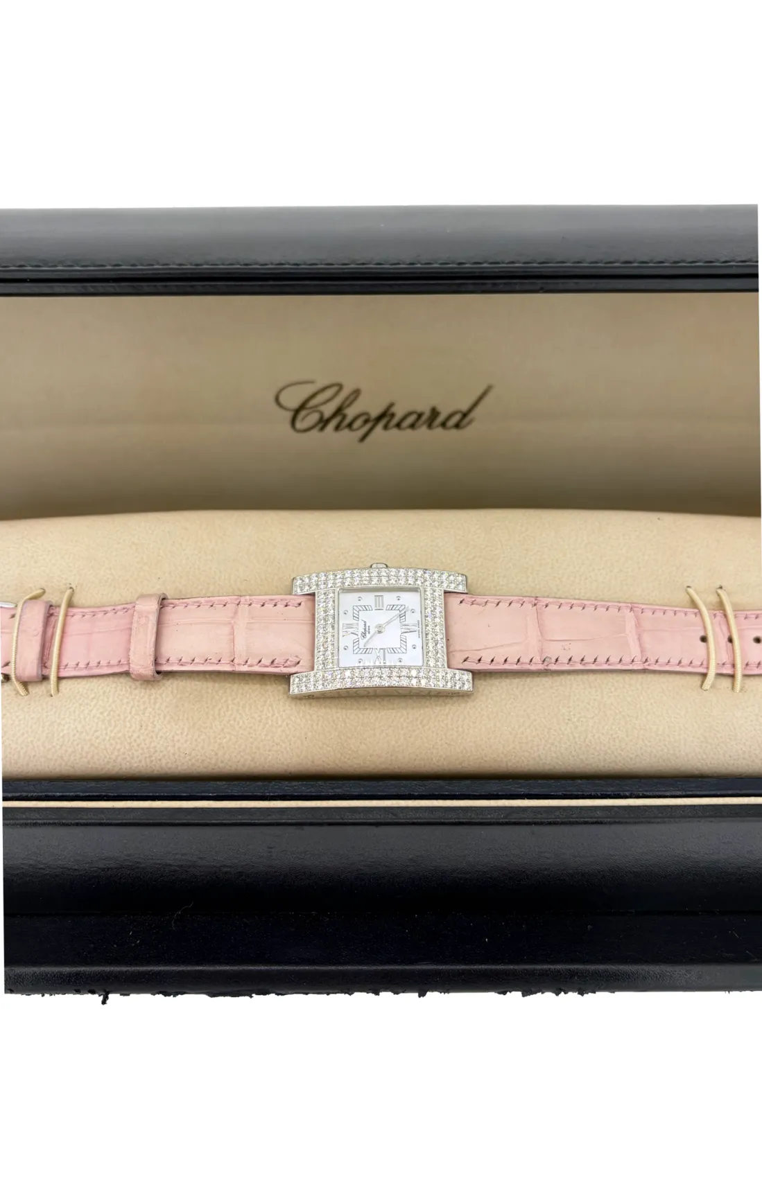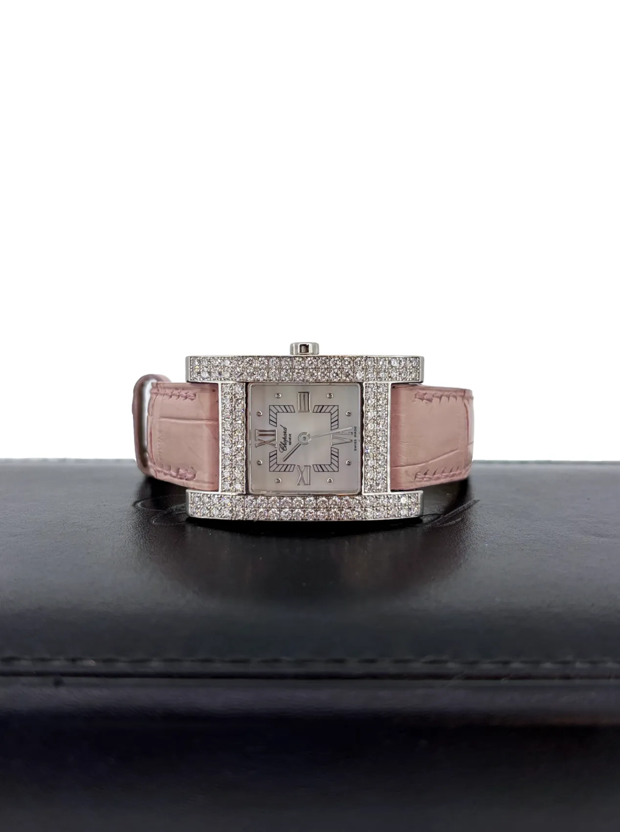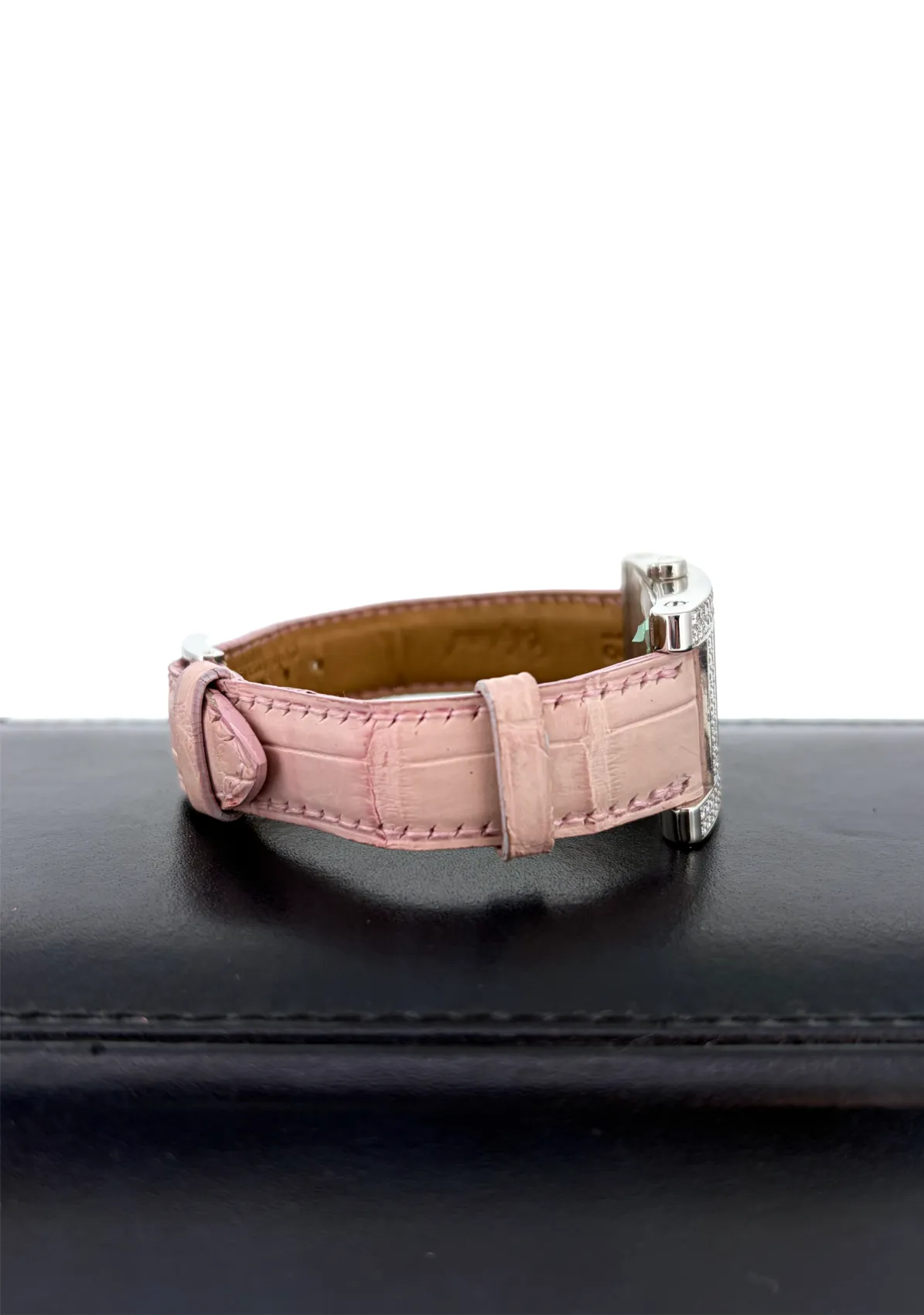 Elegant and distinctive, this Chopard Your Hour timepiece is a refined expression of modern luxury and timeless femininity. Crafted in lustrous 18ct White Gold and adorned with brilliant-cut Diamonds, it embodies Chopard’s signature blend of sophistication, craftsmanship, and jewellery-inspired design. The iconic Your Hour silhouette features soft, flowing lines that wrap elegantly around the wrist, creating a graceful and comfortable fit. The diamond-set detailing enhances its radiant presence, adding a subtle yet captivating sparkle suitable for both day and evening wear. Dating from circa 2015–2023, this piece reflects contemporary Chopard design while maintaining the enduring appeal of a true luxury classic. It is supplied with its SVC service card, offering added assurance of authenticity and care history. The bracelet is fully adjustable, ensuring a secure and tailored fit for the wearer. A beautifully feminine and versatile creation, this Chopard Your Hour watch is a standout addition to any fine watch or jewellery collection.