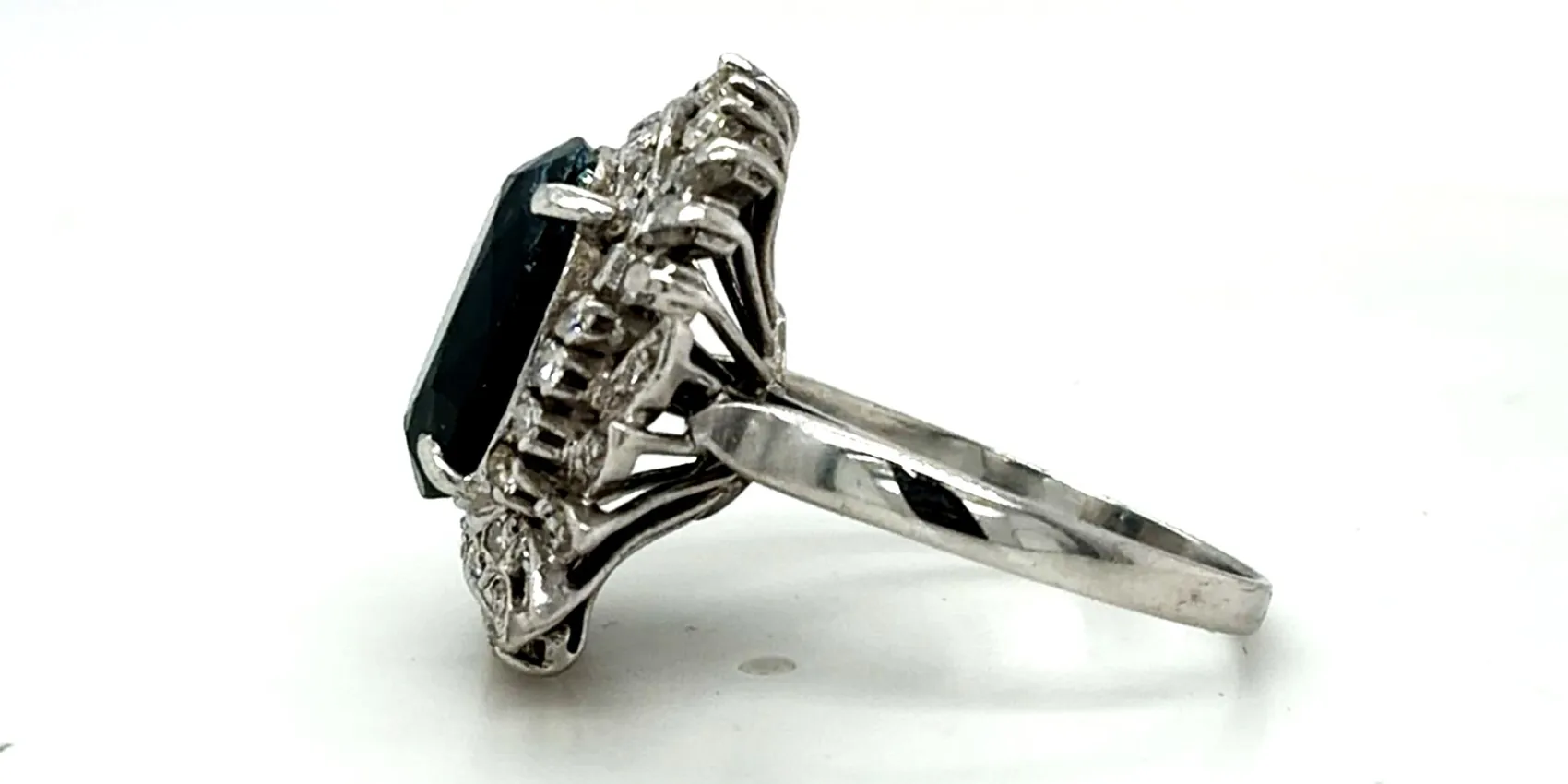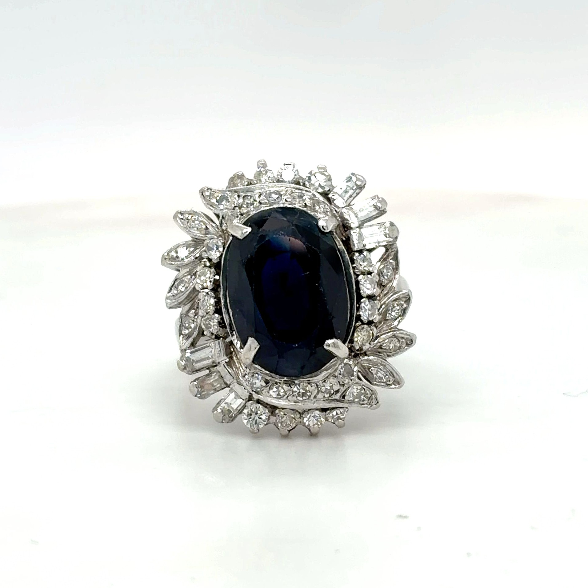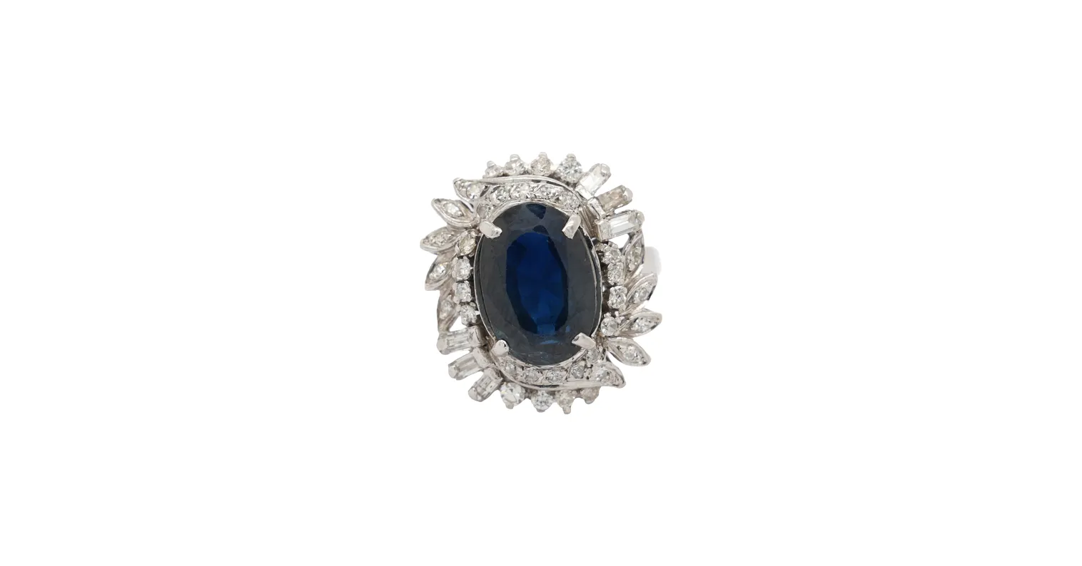 A striking and luxurious statement piece, this 18ct white gold dress ring features a captivating 3.00ct sapphire at its centre, beautifully enhanced by an impressive 1.25ct of surrounding diamonds. The deep blue sapphire contrasts elegantly with the brilliance of the diamonds, creating exceptional sparkle and visual impact. Crafted in premium 18ct white gold and weighing 8.2 grams, this ring offers a substantial, high-quality feel on the hand. The generous diamond setting enhances the overall presence, making it ideal as a bold dress ring or standout occasion piece. A timeless combination of vibrant colour and dazzling brilliance, designed for those who appreciate fine craftsmanship and elegant statement jewellery.