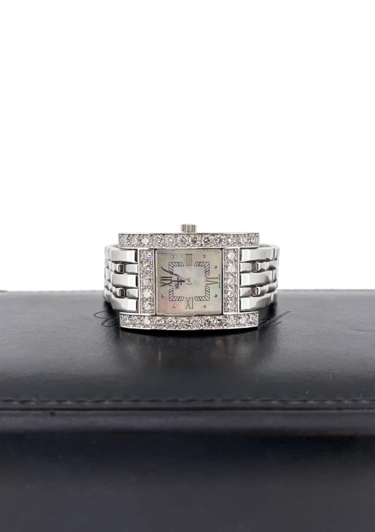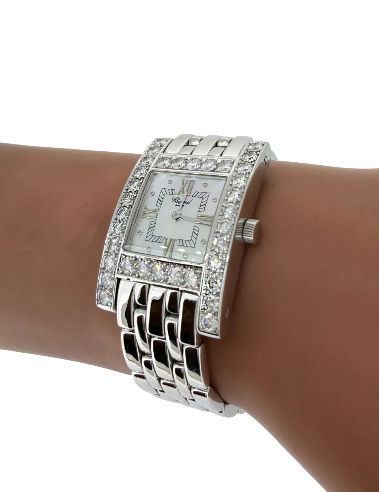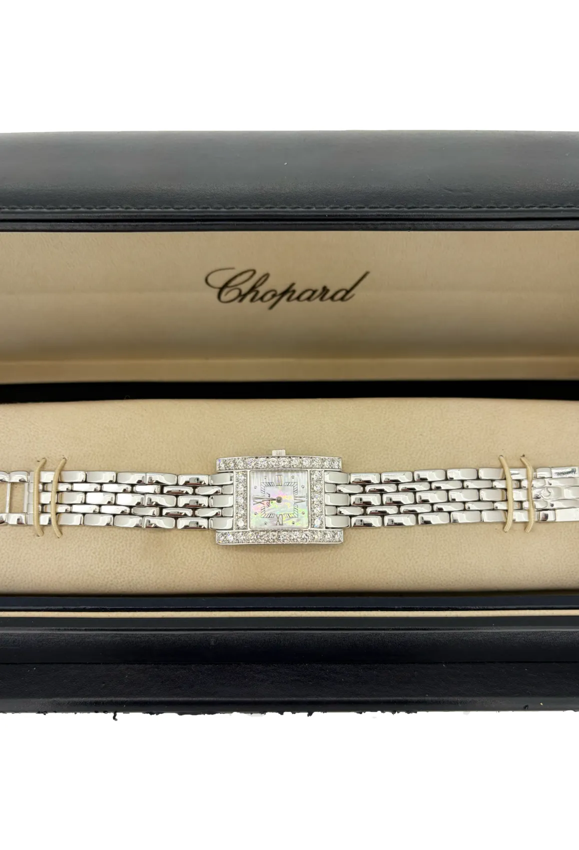 Elegant and sculptural, this Chopard YOUR Hour Solid 18ct White Gold & Diamond Watch (Ref. 13/6621) is a stunning example of haute horlogerie blended with fine jewellery design. Crafted entirely in luxurious 18ct White Gold, it embodies Chopard’s signature elegance and exceptional attention to detail. The distinctive YOUR Hour silhouette features flowing, organic curves that gracefully wrap around the wrist, creating a beautifully feminine and contemporary profile. Set with brilliant-cut Diamonds, the design radiates refined sparkle, enhancing its luxurious and eye-catching appeal without overwhelming its understated sophistication. Powered by a precise Swiss movement, this timepiece offers reliable performance while maintaining its focus on artistry and elegance. The bracelet is fully adjustable, ensuring a secure and comfortable fit tailored to the wearer. A true statement of luxury, this Chopard watch is more than a timepiece—it is a piece of wearable art, ideal for collectors or those seeking an exceptional and timeless addition to their Jewellery collection.