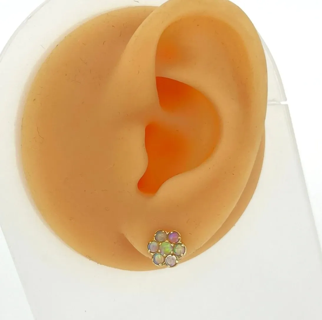 Delicately crafted in 9ct gold, these charming cluster stud earrings feature luminous opal gemstones that catch the light with every movement. The cluster design enhances the opals’ natural fire, creating a subtle yet captivating sparkle. Weighing just 1.4 grams, these earrings are lightweight and comfortable for everyday wear, while their classic design ensures they remain a timeless addition to any jewellery collection. Perfect for gifting or adding a touch of elegance to your own ensemble, these opal cluster studs combine sophistication with enduring style.