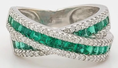 2.39ct Emerald & Diamond Cross Over Ring, 18ct White Gold 8.1g Size N