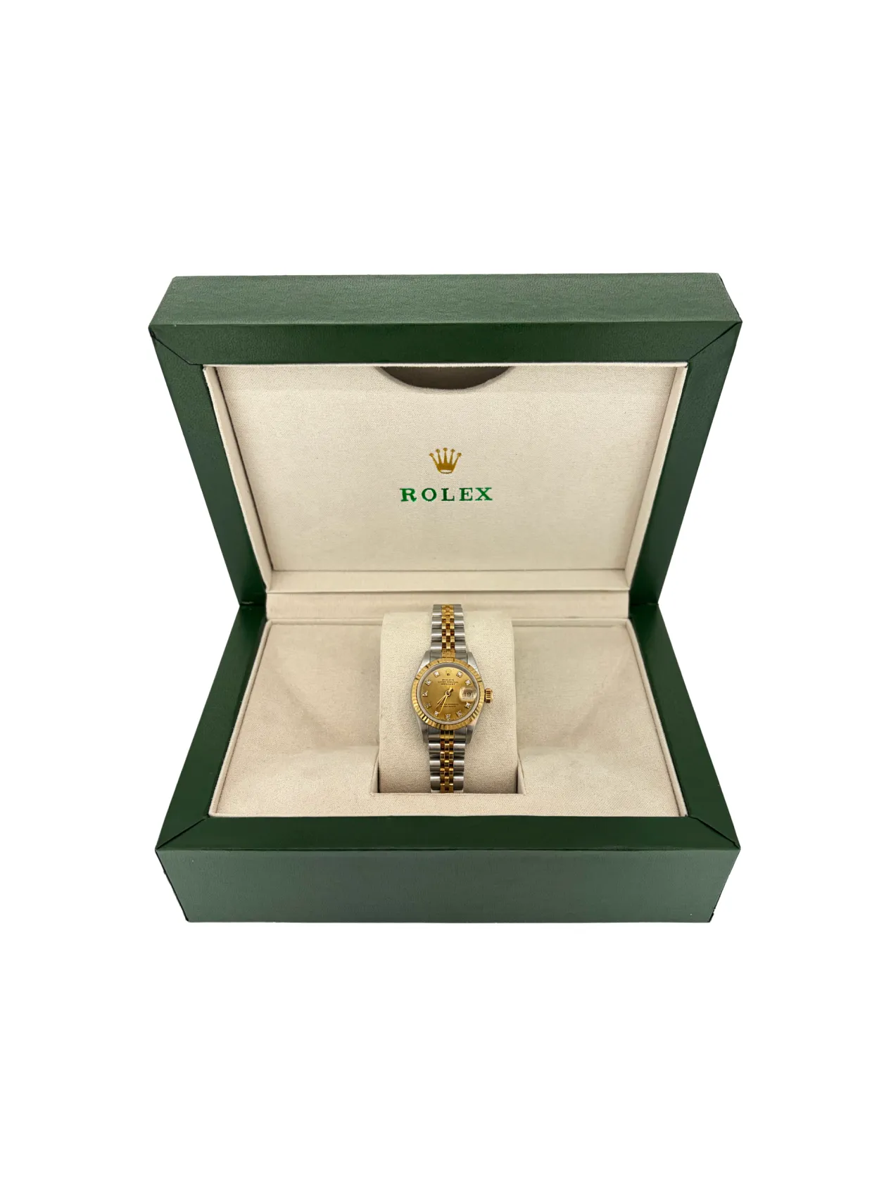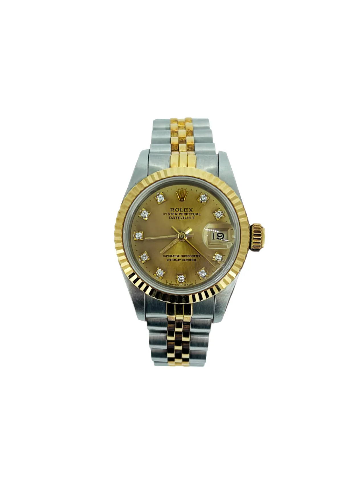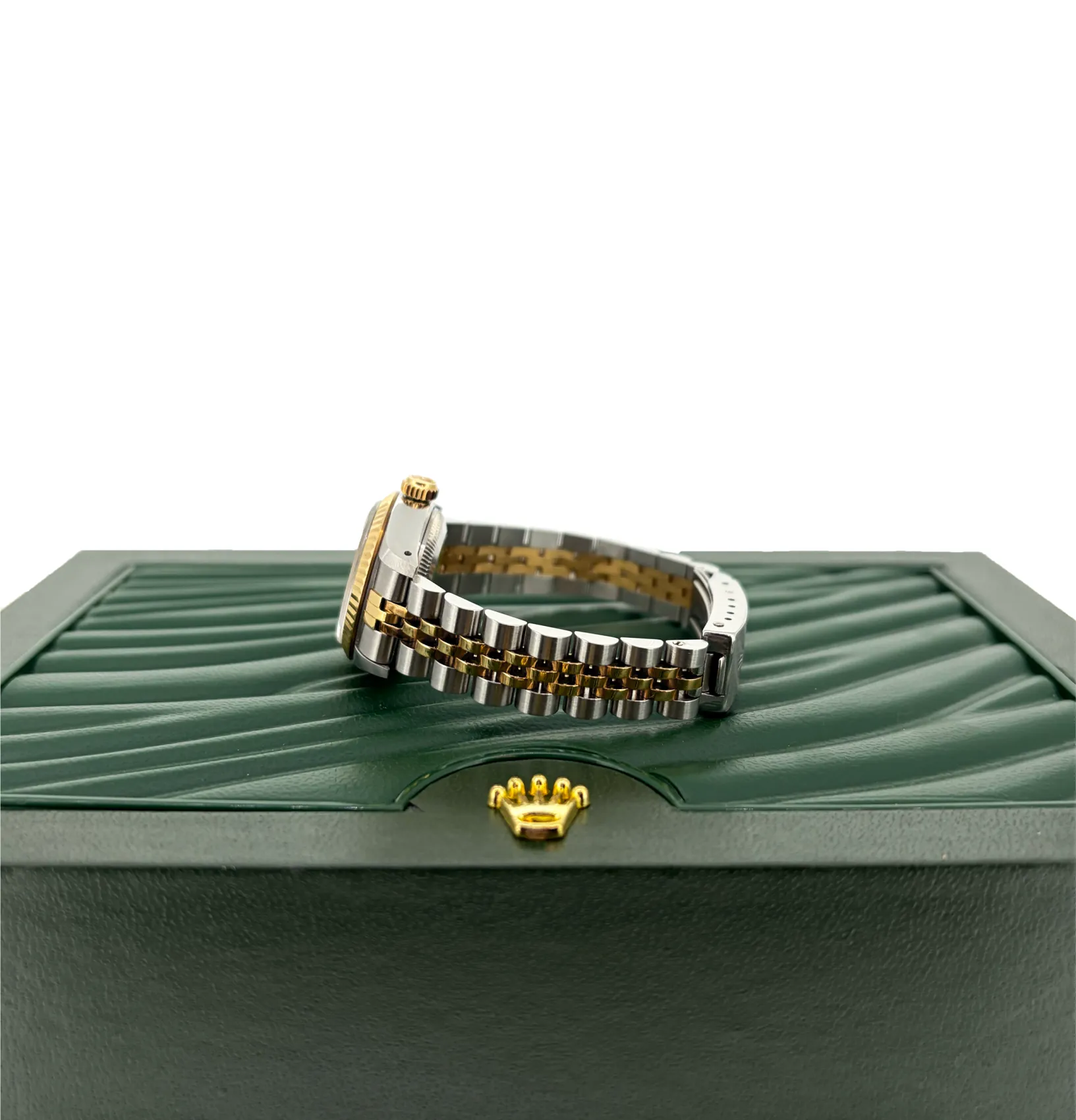 A timeless vintage piece, this Rolex Datejust features a 26mm case crafted from an elegant combination of 18ct Gold and Stainless Steel. Enhanced with diamond detailing, it offers a refined balance of luxury and classic design. Presented with its original 1987 box and papers, this watch is a true collector’s item. The bracelet is fully adjustable, ensuring a comfortable and secure fit for everyday wear.